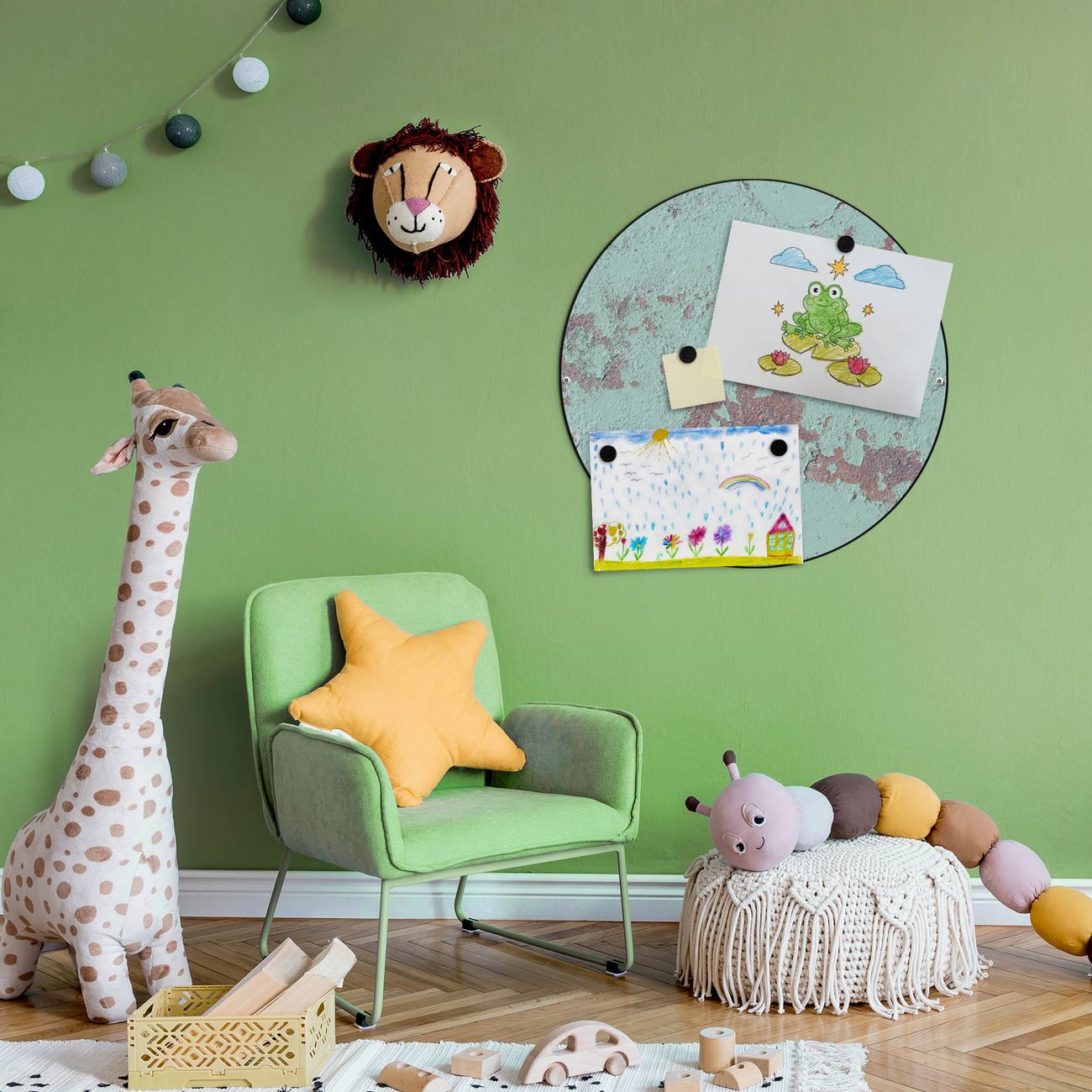FUNKTION / DESIGN Die banjado Magnettafel mit dem Motiv Motiv Blaue Struktur bringt Ordnung in Ihr Zettelchaos. Fotos, Termine, Notizen oder Rezepte lassen Sich hier stilvoll mit Magneten ordnen, Sie behalten alles im Blick. Die Design Magnetwand ist beschreibbar und wieder abwischbar. Mit dieser Pinnwand haben Sie auch ohne Notizen und Magneten ein schönes Dekoelement. Das Format bietet Ihnen ausreichend Platz um alle wichtigen Informationen im Blick zu behalten. DETAILS / NUTZEN Die magnetische Metall Pinnwand besteht aus schwarz lackiertem Stahl. Sie hat einen Durchmesser von 47cm. Es befinden sich an den Seiten zwei vorgefertigte Löcher die eine schnelle und unkomplizierte Anbringung ermöglichen. Das Motiv ist mit einem seidenmatten Laminat versehen und schützt so zusätzlich vor Kratzern. Es halten alle handelsüblichen Magneten daran. Wir sind ein kleines Team aus dem Herzen von Sachsen. Wir fertigen alle Artikel von Hand für Sie an, Sie erhalten keine preiswerte Importware. Auf Wunsch können Sie auch Ihr eigenes Foto auf die Magnettafel aufbringen, schreiben Sie uns an.