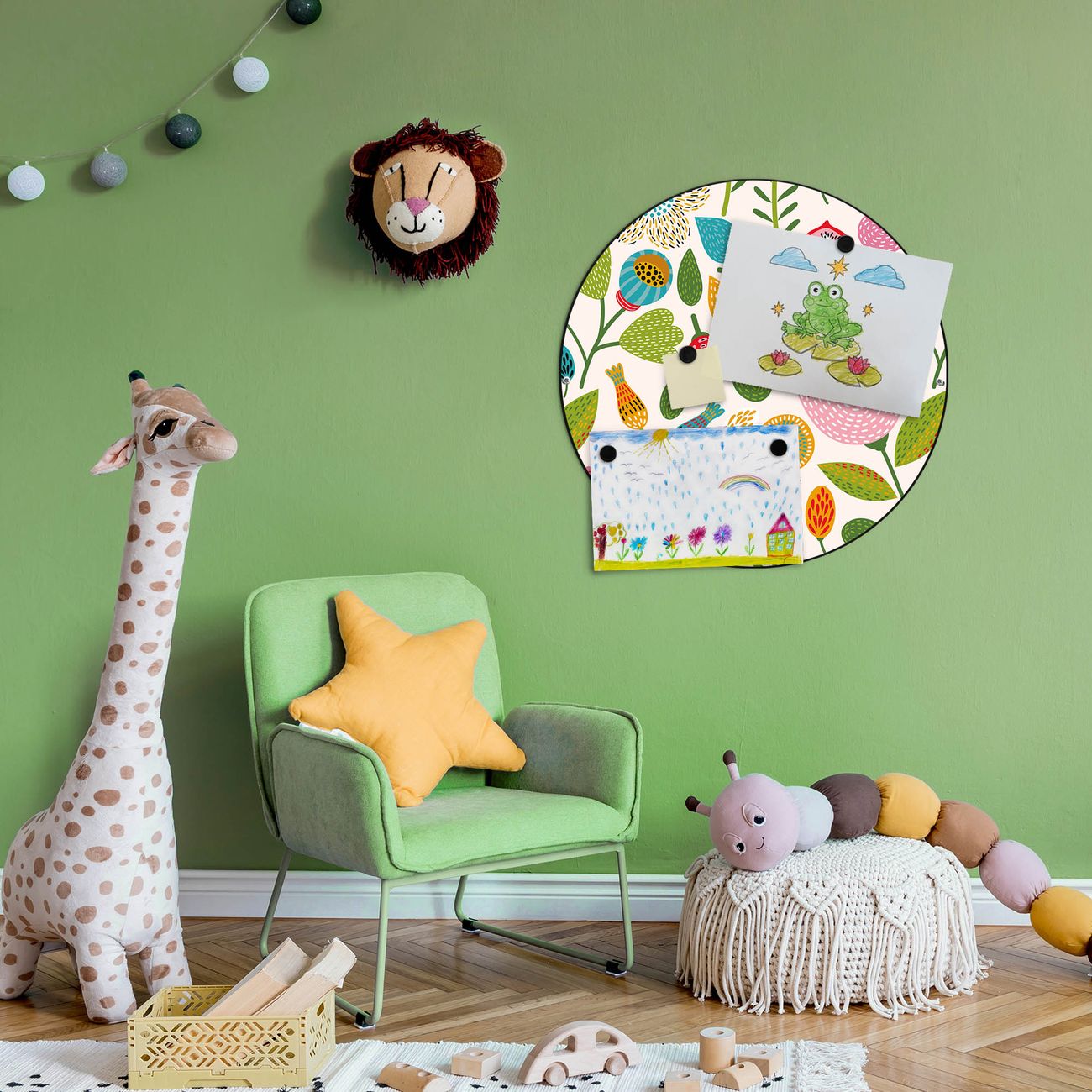 FUNKTION / DESIGN Die banjado Magnettafel mit dem Motiv Motiv Blumen Naiv bringt Ordnung in Ihr Zettelchaos. Fotos, Termine, Notizen oder Rezepte lassen Sich hier stilvoll mit Magneten ordnen, Sie behalten alles im Blick. Die Design Magnetwand ist beschreibbar und wieder abwischbar. Mit dieser Pinnwand haben Sie auch ohne Notizen und Magneten ein schönes Dekoelement. Das Format bietet Ihnen ausreichend Platz um alle wichtigen Informationen im Blick zu behalten. DETAILS / NUTZEN Die magnetische Metall Pinnwand besteht aus schwarz lackiertem Stahl. Sie hat einen Durchmesser von 47cm. Es befinden sich an den Seiten zwei vorgefertigte Löcher die eine schnelle und unkomplizierte Anbringung ermöglichen. Das Motiv ist mit einem seidenmatten Laminat versehen und schützt so zusätzlich vor Kratzern. Es halten alle handelsüblichen Magneten daran. Wir sind ein kleines Team aus dem Herzen von Sachsen. Wir fertigen alle Artikel von Hand für Sie an, Sie erhalten keine preiswerte Importware. Auf Wunsch können Sie auch Ihr eigenes Foto auf die Magnettafel aufbringen, schreiben Sie uns an.