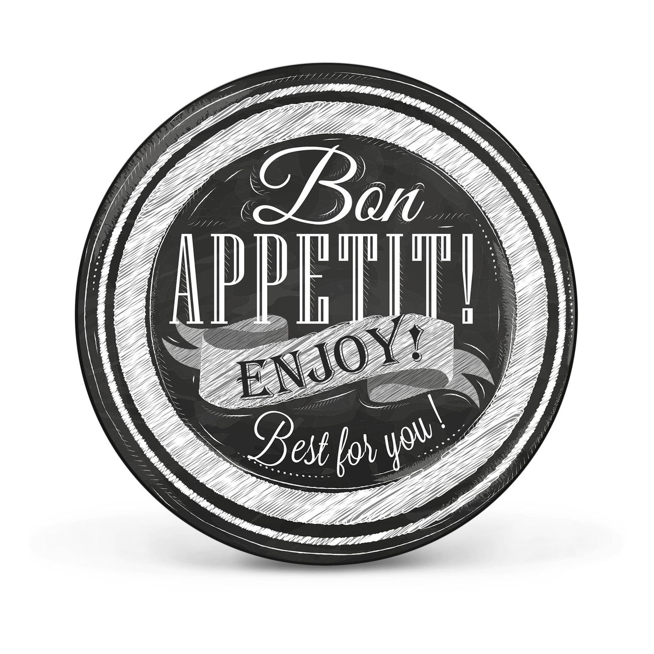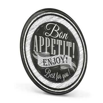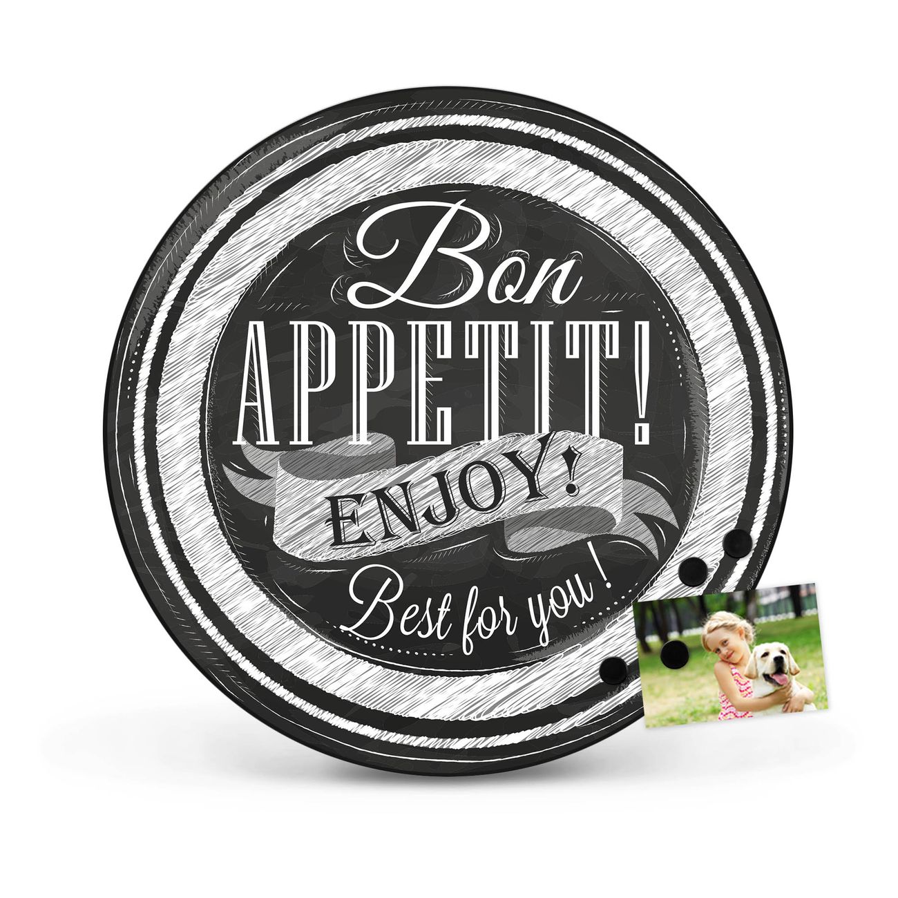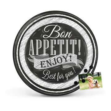 FUNKTION / DESIGN Die banjado Magnettafel mit dem Motiv Motiv Bon Appetit bringt Ordnung in Ihr Zettelchaos. Fotos, Termine, Notizen oder Rezepte lassen Sich hier stilvoll mit Magneten ordnen, Sie behalten alles im Blick. Die Design Magnetwand ist beschreibbar und wieder abwischbar. Mit dieser Pinnwand haben Sie auch ohne Notizen und Magneten ein schönes Dekoelement. Das Format bietet Ihnen ausreichend Platz um alle wichtigen Informationen im Blick zu behalten. DETAILS / NUTZEN Die magnetische Metall Pinnwand besteht aus schwarz lackiertem Stahl. Sie hat einen Durchmesser von 47cm. Es befinden sich an den Seiten zwei vorgefertigte Löcher die eine schnelle und unkomplizierte Anbringung ermöglichen. Das Motiv ist mit einem seidenmatten Laminat versehen und schützt so zusätzlich vor Kratzern. Es halten alle handelsüblichen Magneten daran. Wir sind ein kleines Team aus dem Herzen von Sachsen. Wir fertigen alle Artikel von Hand für Sie an, Sie erhalten keine preiswerte Importware. Auf Wunsch können Sie auch Ihr eigenes Foto auf die Magnettafel aufbringen, schreiben Sie uns an.