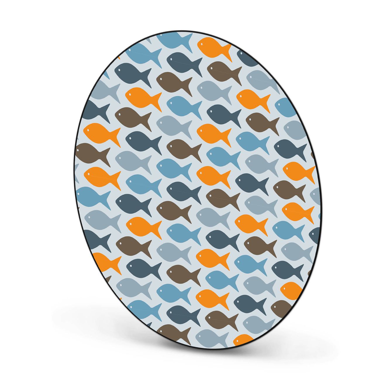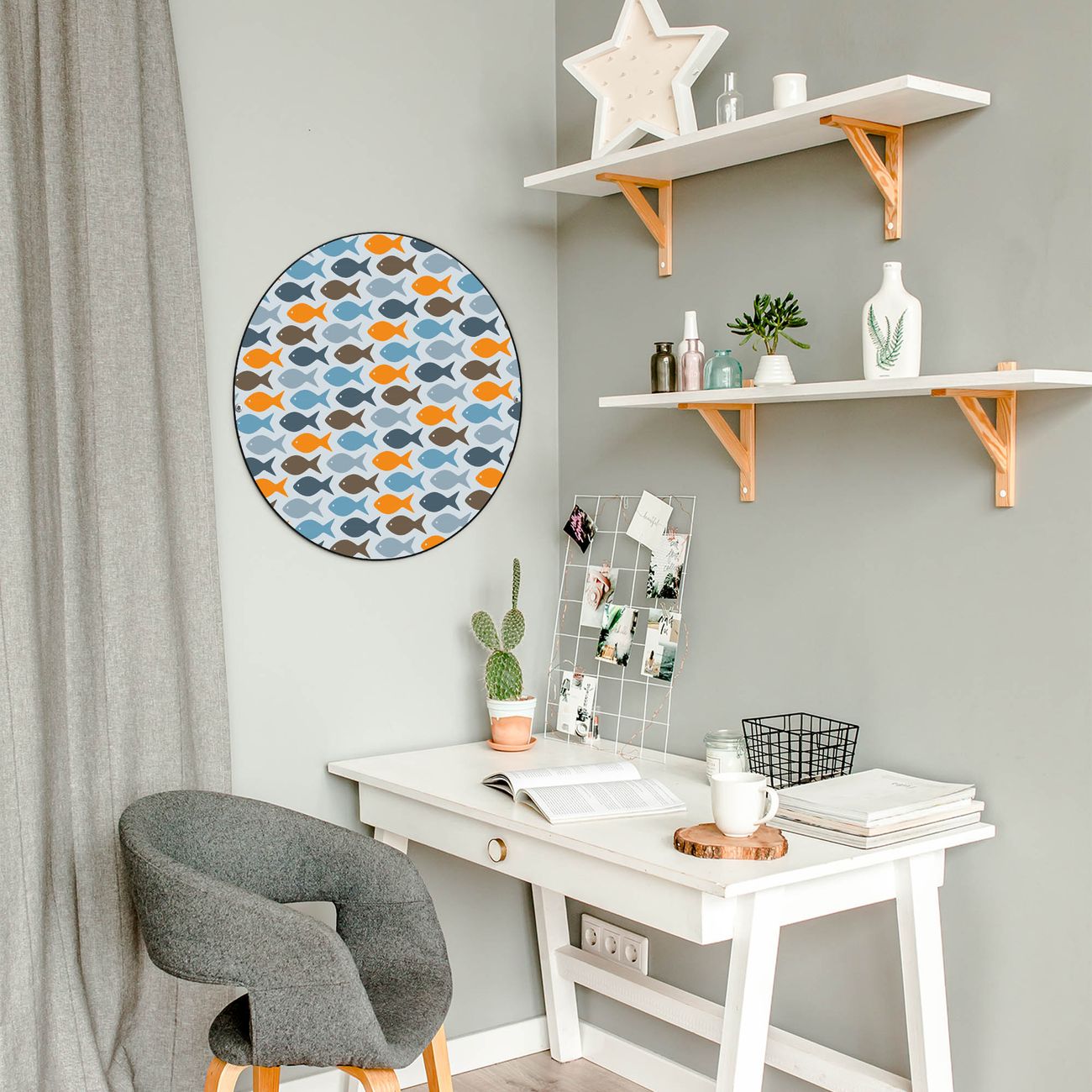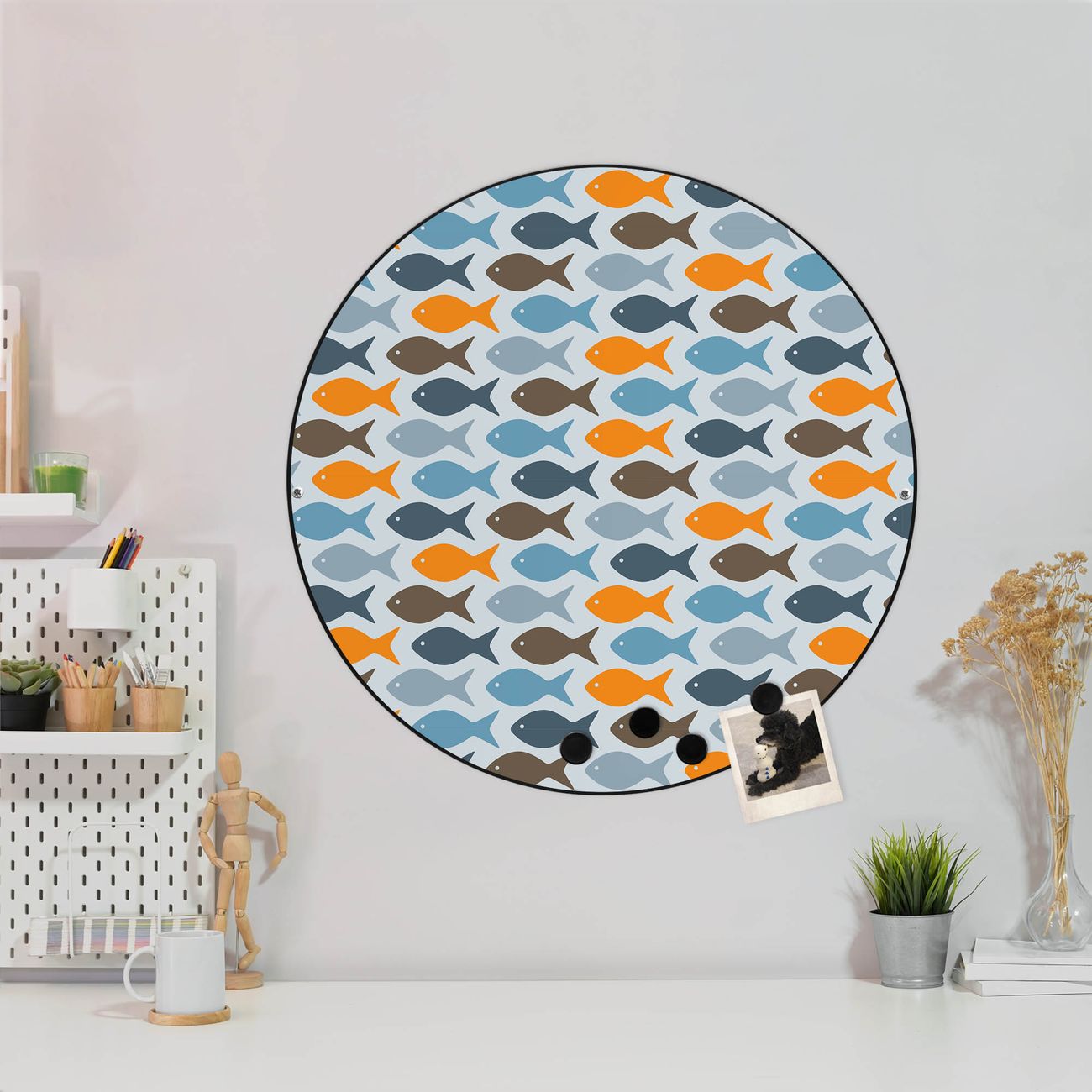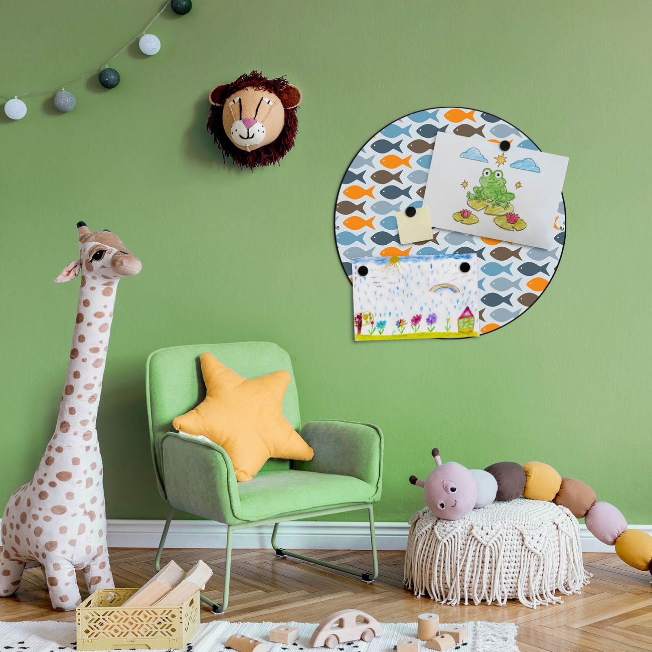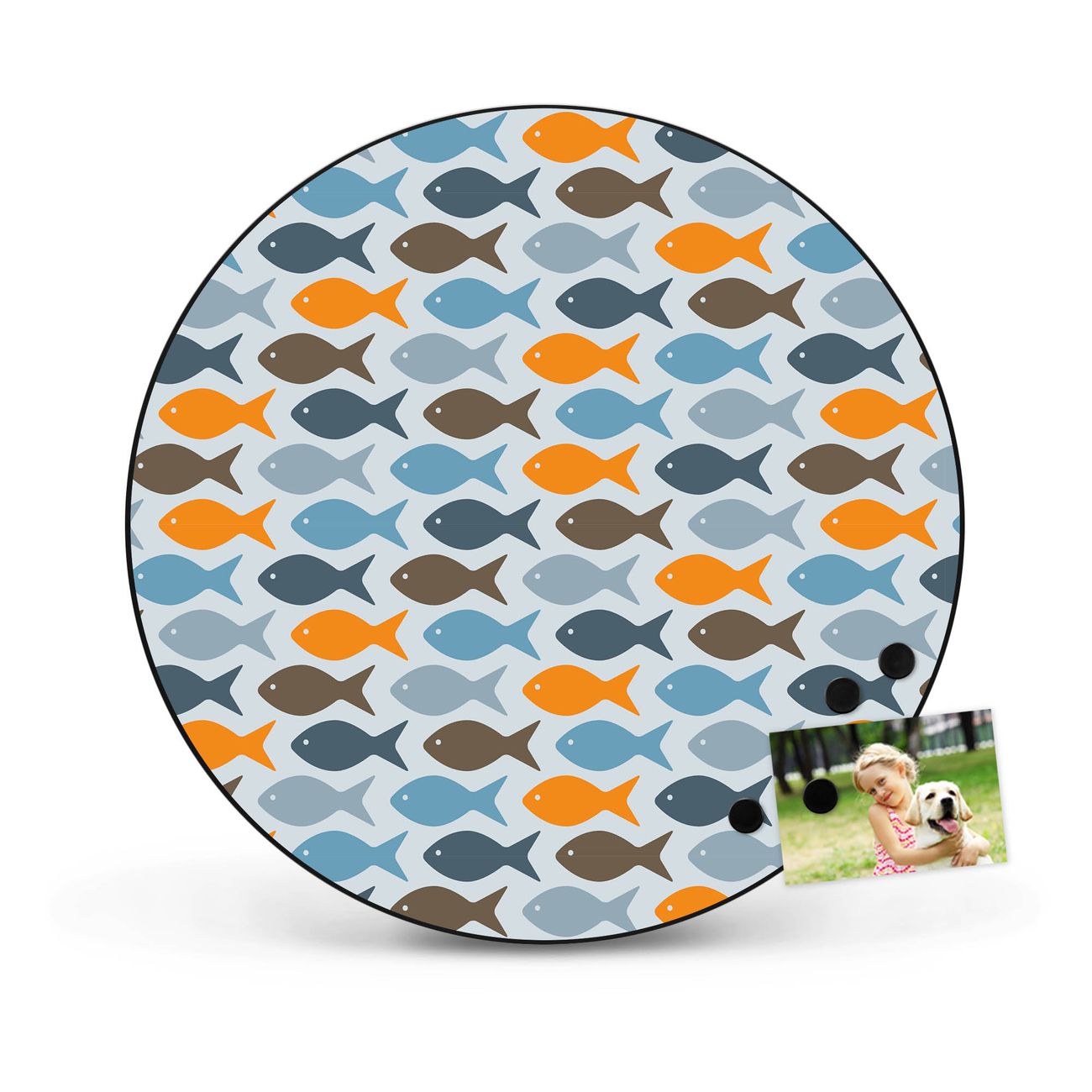 FUNKTION / DESIGN Die banjado Magnettafel mit dem Motiv Motiv Bunte Fische bringt Ordnung in Ihr Zettelchaos. Fotos, Termine, Notizen oder Rezepte lassen Sich hier stilvoll mit Magneten ordnen, Sie behalten alles im Blick. Die Design Magnetwand ist beschreibbar und wieder abwischbar. Mit dieser Pinnwand haben Sie auch ohne Notizen und Magneten ein schönes Dekoelement. Das Format bietet Ihnen ausreichend Platz um alle wichtigen Informationen im Blick zu behalten. DETAILS / NUTZEN Die magnetische Metall Pinnwand besteht aus schwarz lackiertem Stahl. Sie hat einen Durchmesser von 47cm. Es befinden sich an den Seiten zwei vorgefertigte Löcher die eine schnelle und unkomplizierte Anbringung ermöglichen. Das Motiv ist mit einem seidenmatten Laminat versehen und schützt so zusätzlich vor Kratzern. Es halten alle handelsüblichen Magneten daran. Wir sind ein kleines Team aus dem Herzen von Sachsen. Wir fertigen alle Artikel von Hand für Sie an, Sie erhalten keine preiswerte Importware. Auf Wunsch können Sie auch Ihr eigenes Foto auf die Magnettafel aufbringen, schreiben Sie uns an.