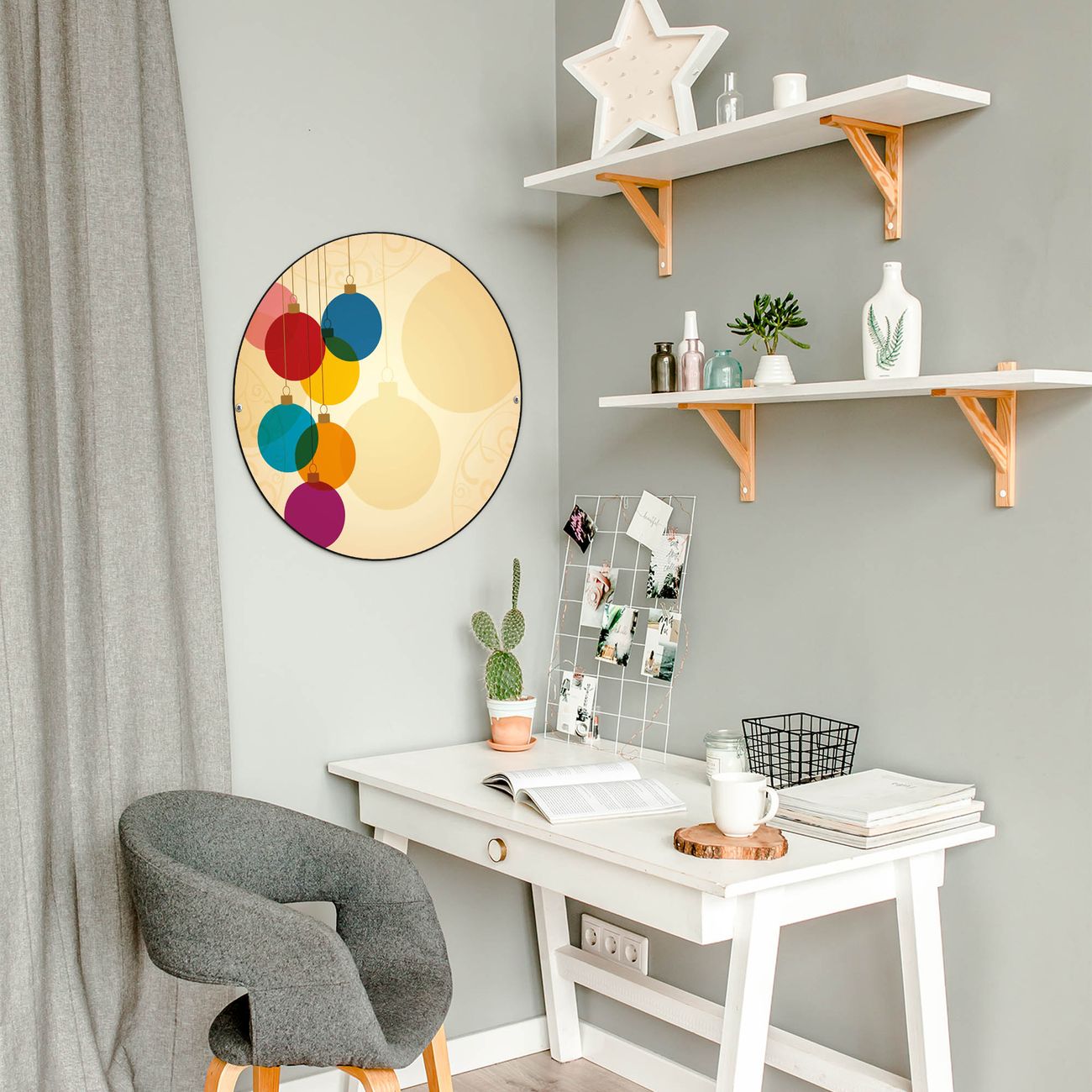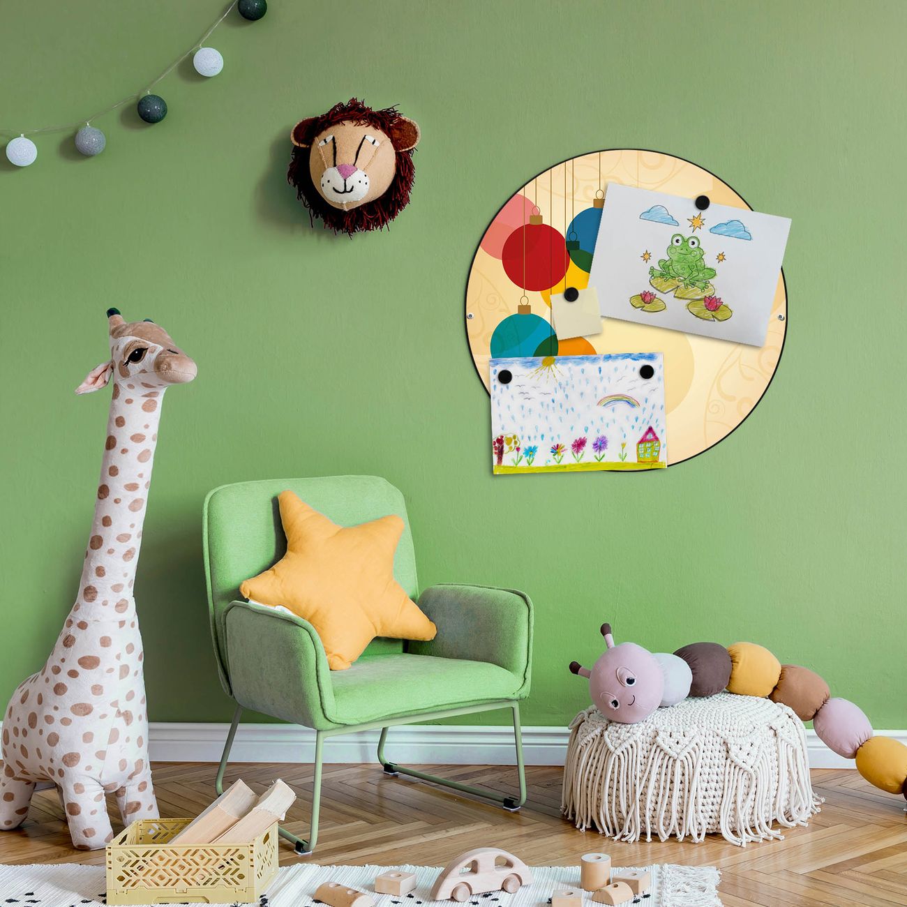 FUNKTION / DESIGN Die banjado Magnettafel mit dem Motiv Motiv Bunte Kugeln bringt Ordnung in Ihr Zettelchaos. Fotos, Termine, Notizen oder Rezepte lassen Sich hier stilvoll mit Magneten ordnen, Sie behalten alles im Blick. Die Design Magnetwand ist beschreibbar und wieder abwischbar. Mit dieser Pinnwand haben Sie auch ohne Notizen und Magneten ein schönes Dekoelement. Das Format bietet Ihnen ausreichend Platz um alle wichtigen Informationen im Blick zu behalten. DETAILS / NUTZEN Die magnetische Metall Pinnwand besteht aus schwarz lackiertem Stahl. Sie hat einen Durchmesser von 47cm. Es befinden sich an den Seiten zwei vorgefertigte Löcher die eine schnelle und unkomplizierte Anbringung ermöglichen. Das Motiv ist mit einem seidenmatten Laminat versehen und schützt so zusätzlich vor Kratzern. Es halten alle handelsüblichen Magneten daran. Wir sind ein kleines Team aus dem Herzen von Sachsen. Wir fertigen alle Artikel von Hand für Sie an, Sie erhalten keine preiswerte Importware. Auf Wunsch können Sie auch Ihr eigenes Foto auf die Magnettafel aufbringen, schreiben Sie uns an.