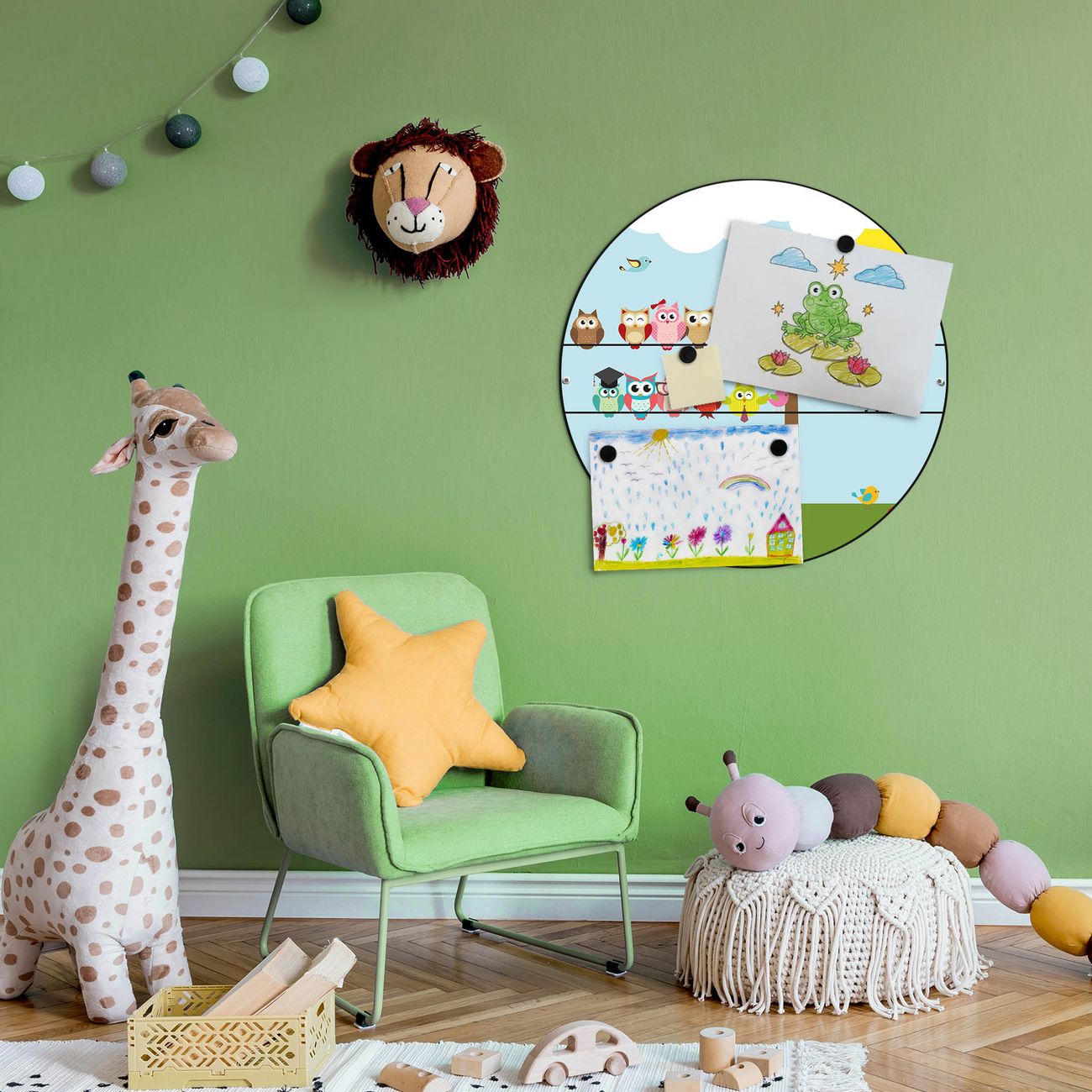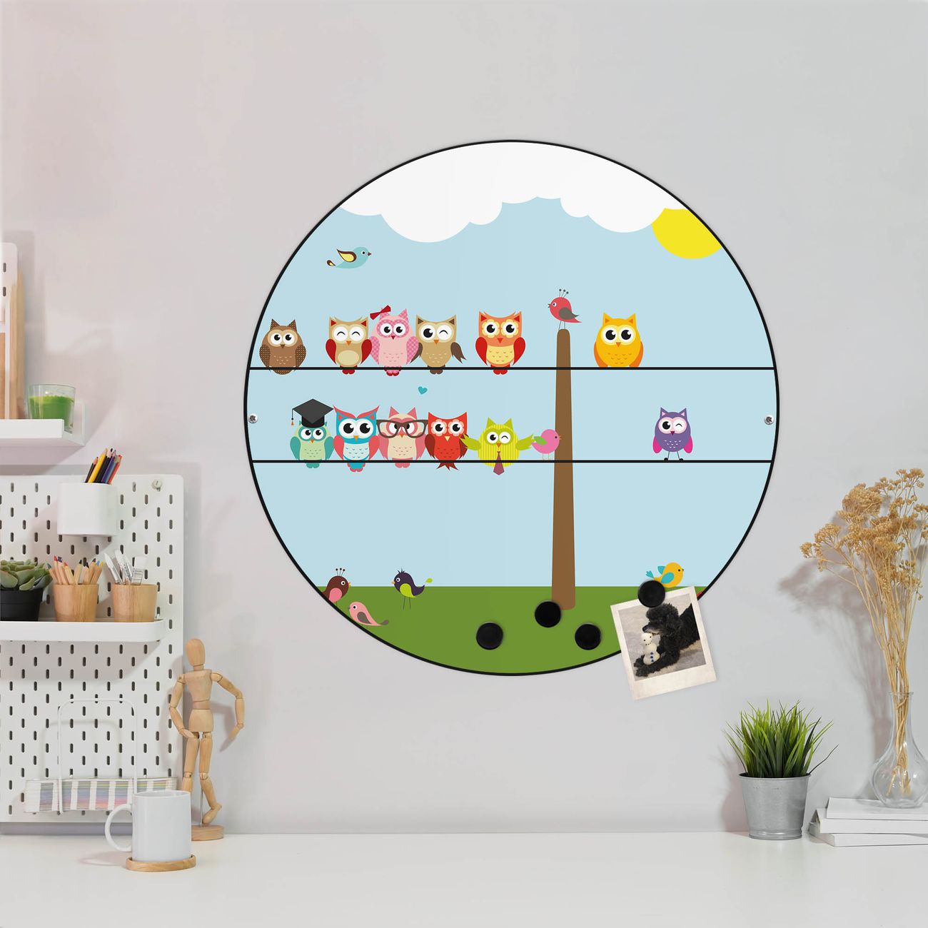 FUNKTION / DESIGN Die banjado Magnettafel mit dem Motiv Motiv Da Wären Wir bringt Ordnung in Ihr Zettelchaos. Fotos, Termine, Notizen oder Rezepte lassen Sich hier stilvoll mit Magneten ordnen, Sie behalten alles im Blick. Die Design Magnetwand ist beschreibbar und wieder abwischbar. Mit dieser Pinnwand haben Sie auch ohne Notizen und Magneten ein schönes Dekoelement. Das Format bietet Ihnen ausreichend Platz um alle wichtigen Informationen im Blick zu behalten. DETAILS / NUTZEN Die magnetische Metall Pinnwand besteht aus schwarz lackiertem Stahl. Sie hat einen Durchmesser von 47cm. Es befinden sich an den Seiten zwei vorgefertigte Löcher die eine schnelle und unkomplizierte Anbringung ermöglichen. Das Motiv ist mit einem seidenmatten Laminat versehen und schützt so zusätzlich vor Kratzern. Es halten alle handelsüblichen Magneten daran. Wir sind ein kleines Team aus dem Herzen von Sachsen. Wir fertigen alle Artikel von Hand für Sie an, Sie erhalten keine preiswerte Importware. Auf Wunsch können Sie auch Ihr eigenes Foto auf die Magnettafel aufbringen, schreiben Sie uns an.