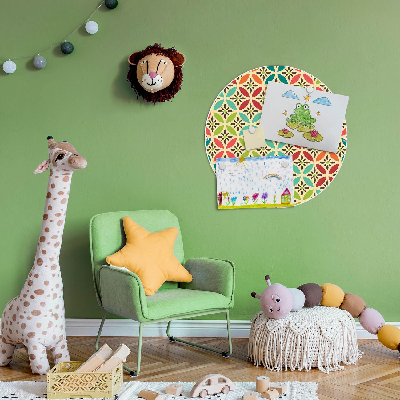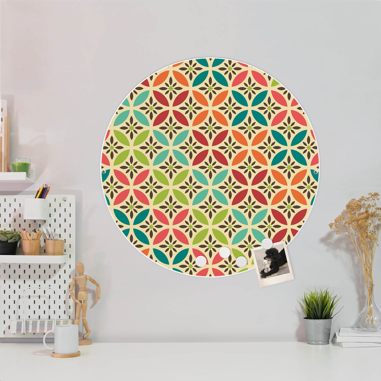 FUNKTION / DESIGN Die banjado Magnettafel mit dem Motiv Motiv Diamant Muster bringt Ordnung in Ihr Zettelchaos. Fotos, Termine, Notizen oder Rezepte lassen Sich hier stilvoll mit Magneten ordnen, Sie behalten alles im Blick. Die Design Magnetwand ist beschreibbar und wieder abwischbar. Mit dieser Pinnwand haben Sie auch ohne Notizen und Magneten ein schönes Dekoelement. Das Format bietet Ihnen ausreichend Platz um alle wichtigen Informationen im Blick zu behalten. DETAILS / NUTZEN Die magnetische Metall Pinnwand besteht aus weiß lackiertem Stahl. Sie hat einen Durchmesser von 47cm. Es befinden sich an den Seiten zwei vorgefertigte Löcher die eine schnelle und unkomplizierte Anbringung ermöglichen. Das Motiv ist mit einem seidenmatten Laminat versehen und schützt so zusätzlich vor Kratzern. Es halten alle handelsüblichen Magneten daran. Wir sind ein kleines Team aus dem Herzen von Sachsen. Wir fertigen alle Artikel von Hand für Sie an, Sie erhalten keine preiswerte Importware. Auf Wunsch können Sie auch Ihr eigenes Foto auf die Magnettafel aufbringen, schreiben Sie uns an.