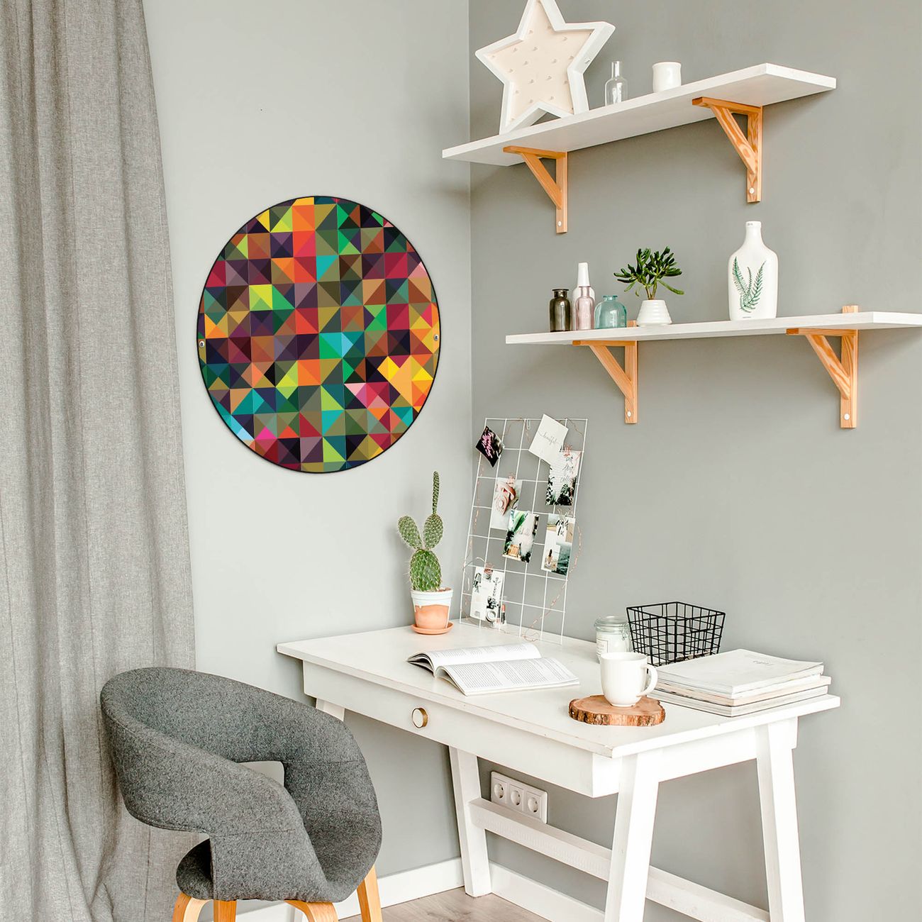FUNKTION / DESIGN Die banjado Magnettafel mit dem Motiv Motiv Dunkles Kaleidoskop bringt Ordnung in Ihr Zettelchaos. Fotos, Termine, Notizen oder Rezepte lassen Sich hier stilvoll mit Magneten ordnen, Sie behalten alles im Blick. Die Design Magnetwand ist beschreibbar und wieder abwischbar. Mit dieser Pinnwand haben Sie auch ohne Notizen und Magneten ein schönes Dekoelement. Das Format bietet Ihnen ausreichend Platz um alle wichtigen Informationen im Blick zu behalten. DETAILS / NUTZEN Die magnetische Metall Pinnwand besteht aus schwarz lackiertem Stahl. Sie hat einen Durchmesser von 47cm. Es befinden sich an den Seiten zwei vorgefertigte Löcher die eine schnelle und unkomplizierte Anbringung ermöglichen. Das Motiv ist mit einem seidenmatten Laminat versehen und schützt so zusätzlich vor Kratzern. Es halten alle handelsüblichen Magneten daran. Wir sind ein kleines Team aus dem Herzen von Sachsen. Wir fertigen alle Artikel von Hand für Sie an, Sie erhalten keine preiswerte Importware. Auf Wunsch können Sie auch Ihr eigenes Foto auf die Magnettafel aufbringen, schreiben Sie uns an.