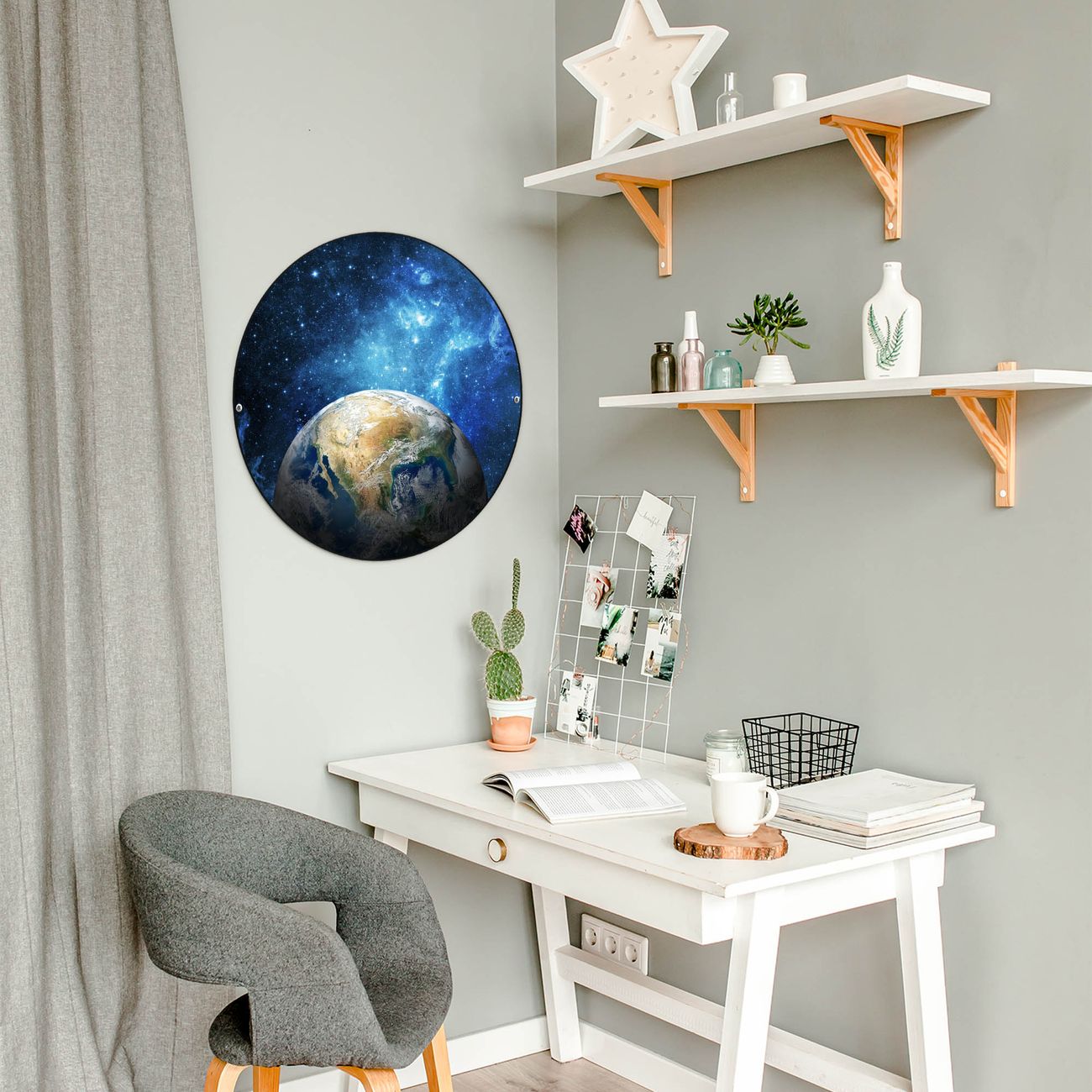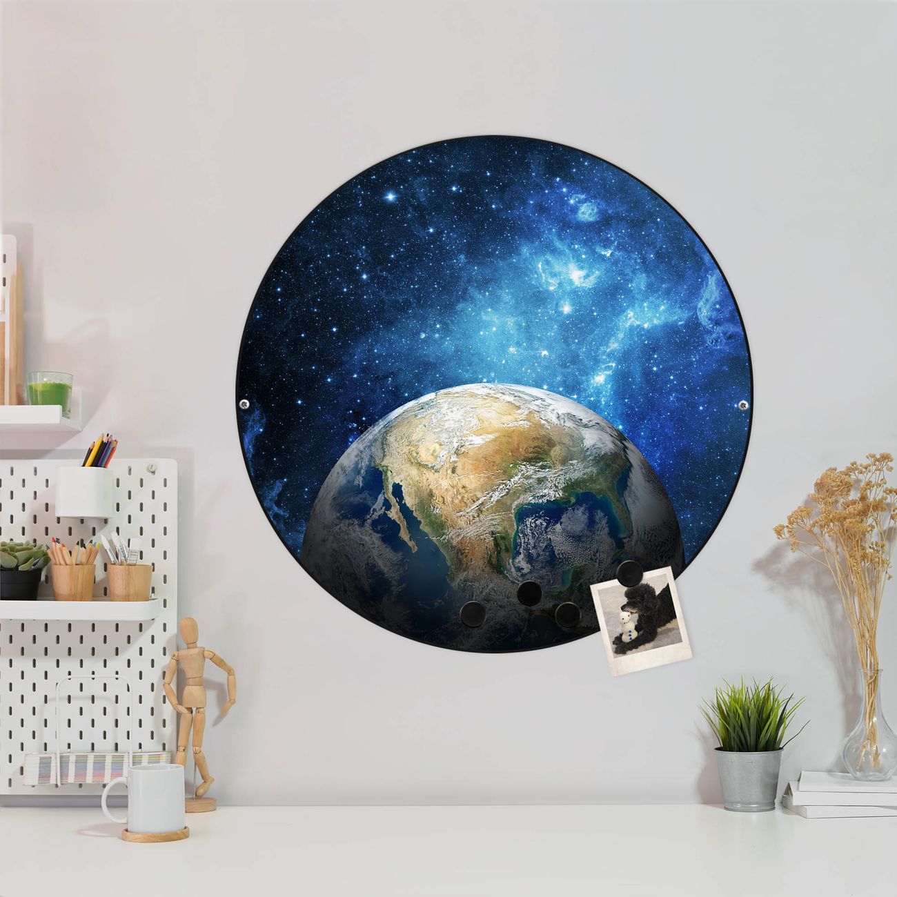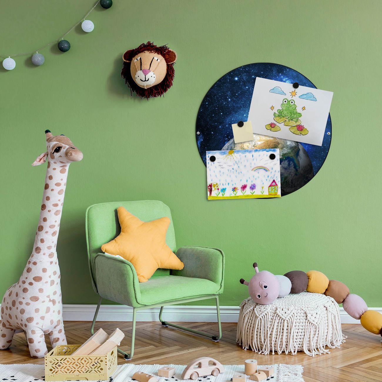 FUNKTION / DESIGN Die banjado Magnettafel mit dem Motiv Motiv Erdkugel bringt Ordnung in Ihr Zettelchaos. Fotos, Termine, Notizen oder Rezepte lassen Sich hier stilvoll mit Magneten ordnen, Sie behalten alles im Blick. Die Design Magnetwand ist beschreibbar und wieder abwischbar. Mit dieser Pinnwand haben Sie auch ohne Notizen und Magneten ein schönes Dekoelement. Das Format bietet Ihnen ausreichend Platz um alle wichtigen Informationen im Blick zu behalten. DETAILS / NUTZEN Die magnetische Metall Pinnwand besteht aus schwarz lackiertem Stahl. Sie hat einen Durchmesser von 47cm. Es befinden sich an den Seiten zwei vorgefertigte Löcher die eine schnelle und unkomplizierte Anbringung ermöglichen. Das Motiv ist mit einem seidenmatten Laminat versehen und schützt so zusätzlich vor Kratzern. Es halten alle handelsüblichen Magneten daran. Wir sind ein kleines Team aus dem Herzen von Sachsen. Wir fertigen alle Artikel von Hand für Sie an, Sie erhalten keine preiswerte Importware. Auf Wunsch können Sie auch Ihr eigenes Foto auf die Magnettafel aufbringen, schreiben Sie uns an.