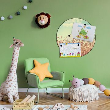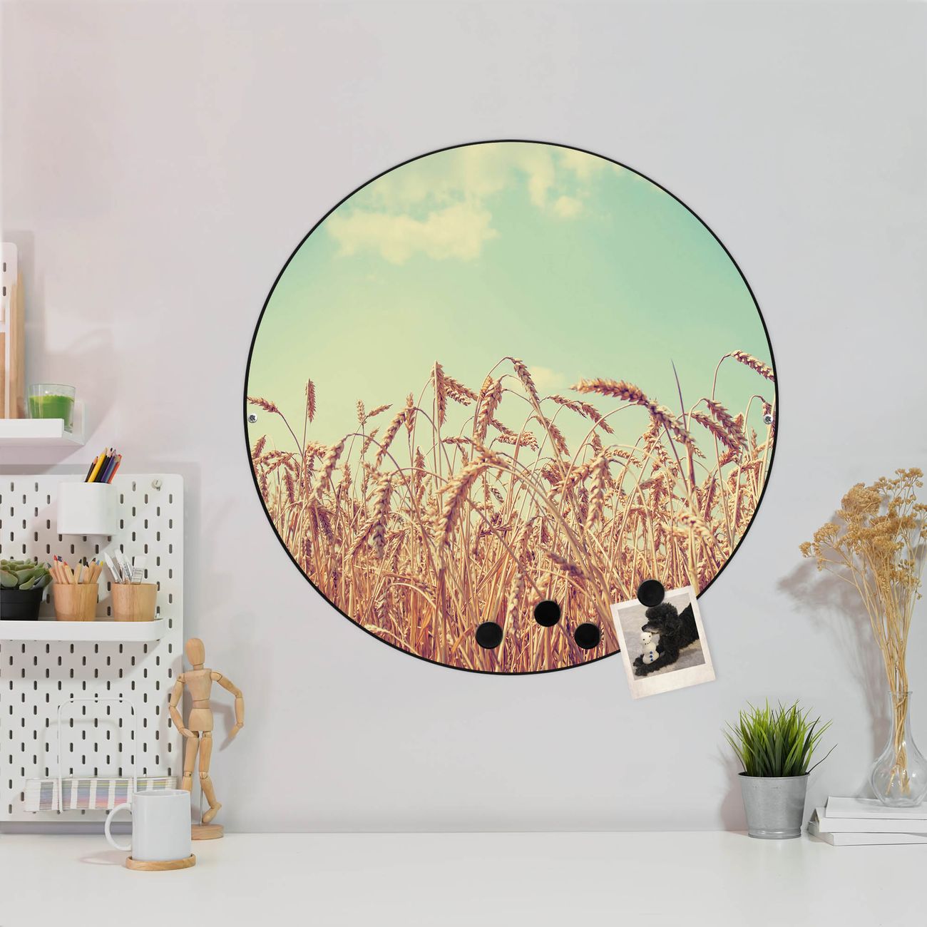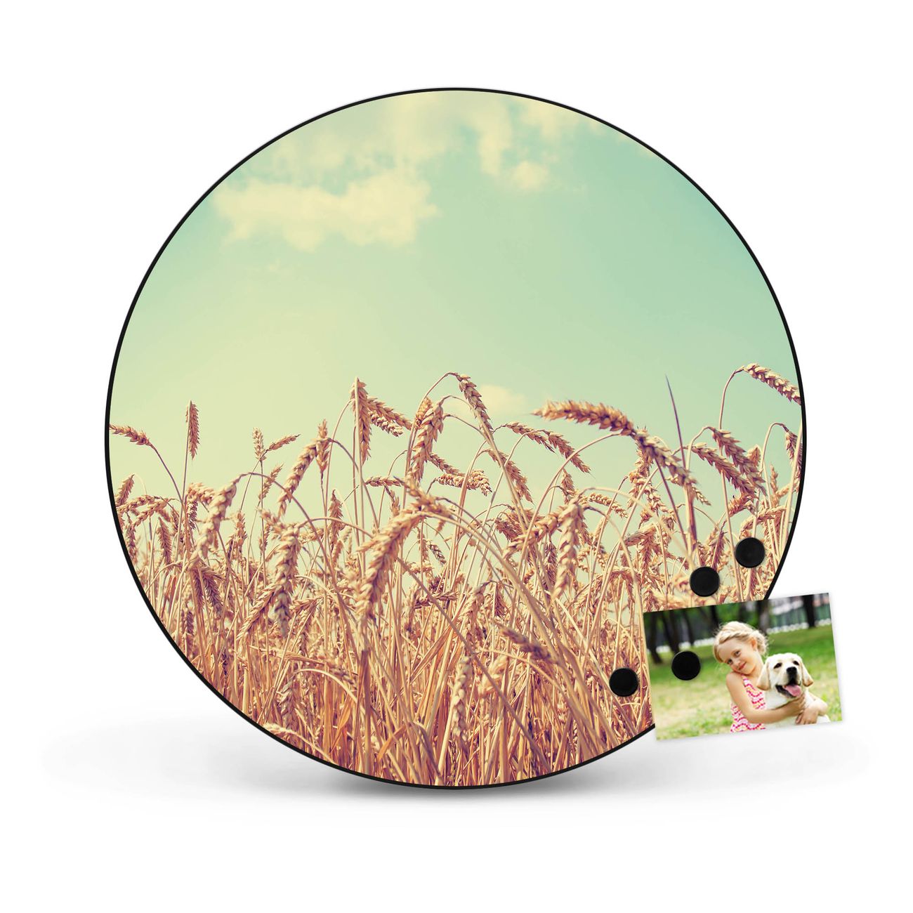 FUNKTION / DESIGN Die banjado Magnettafel mit dem Motiv Motiv Erntezeit bringt Ordnung in Ihr Zettelchaos. Fotos, Termine, Notizen oder Rezepte lassen Sich hier stilvoll mit Magneten ordnen, Sie behalten alles im Blick. Die Design Magnetwand ist beschreibbar und wieder abwischbar. Mit dieser Pinnwand haben Sie auch ohne Notizen und Magneten ein schönes Dekoelement. Das Format bietet Ihnen ausreichend Platz um alle wichtigen Informationen im Blick zu behalten. DETAILS / NUTZEN Die magnetische Metall Pinnwand besteht aus schwarz lackiertem Stahl. Sie hat einen Durchmesser von 47cm. Es befinden sich an den Seiten zwei vorgefertigte Löcher die eine schnelle und unkomplizierte Anbringung ermöglichen. Das Motiv ist mit einem seidenmatten Laminat versehen und schützt so zusätzlich vor Kratzern. Es halten alle handelsüblichen Magneten daran. Wir sind ein kleines Team aus dem Herzen von Sachsen. Wir fertigen alle Artikel von Hand für Sie an, Sie erhalten keine preiswerte Importware. Auf Wunsch können Sie auch Ihr eigenes Foto auf die Magnettafel aufbringen, schreiben Sie uns an.