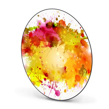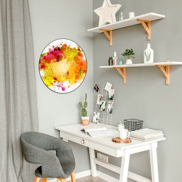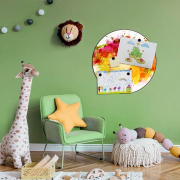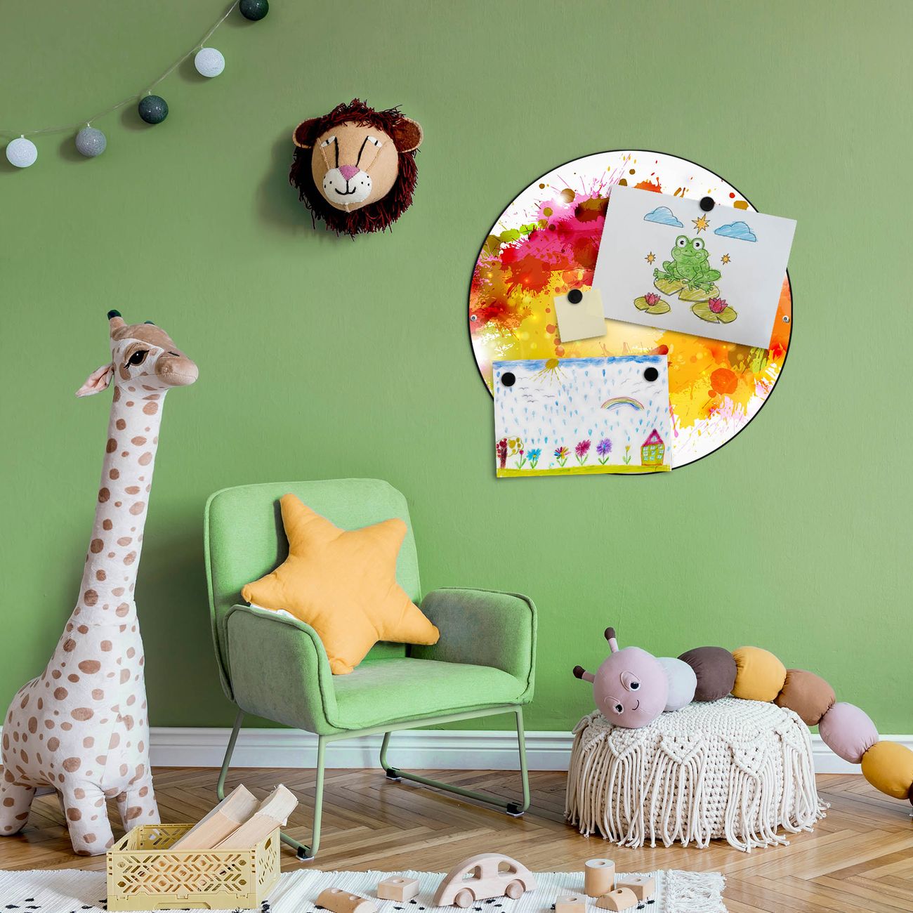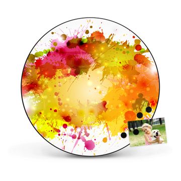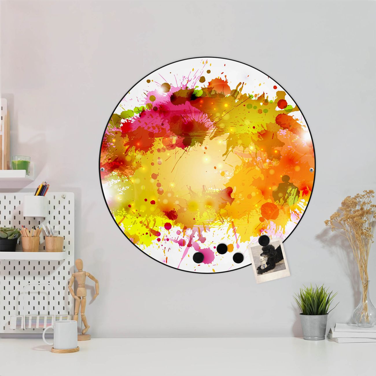 FUNKTION / DESIGN Die banjado Magnettafel mit dem Motiv Motiv Farbkleckse bringt Ordnung in Ihr Zettelchaos. Fotos, Termine, Notizen oder Rezepte lassen Sich hier stilvoll mit Magneten ordnen, Sie behalten alles im Blick. Die Design Magnetwand ist beschreibbar und wieder abwischbar. Mit dieser Pinnwand haben Sie auch ohne Notizen und Magneten ein schönes Dekoelement. Das Format bietet Ihnen ausreichend Platz um alle wichtigen Informationen im Blick zu behalten. DETAILS / NUTZEN Die magnetische Metall Pinnwand besteht aus schwarz lackiertem Stahl. Sie hat einen Durchmesser von 47cm. Es befinden sich an den Seiten zwei vorgefertigte Löcher die eine schnelle und unkomplizierte Anbringung ermöglichen. Das Motiv ist mit einem seidenmatten Laminat versehen und schützt so zusätzlich vor Kratzern. Es halten alle handelsüblichen Magneten daran. Wir sind ein kleines Team aus dem Herzen von Sachsen. Wir fertigen alle Artikel von Hand für Sie an, Sie erhalten keine preiswerte Importware. Auf Wunsch können Sie auch Ihr eigenes Foto auf die Magnettafel aufbringen, schreiben Sie uns an.