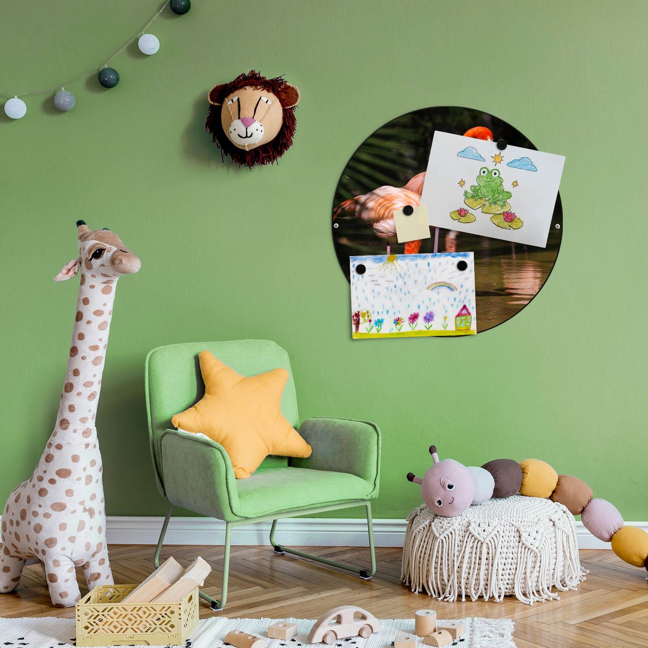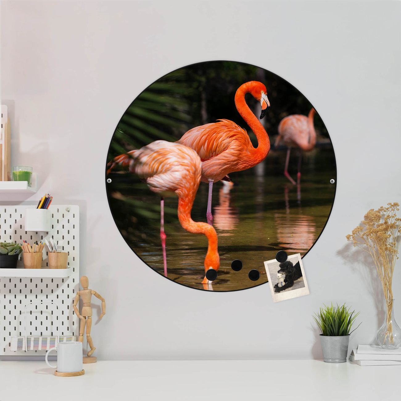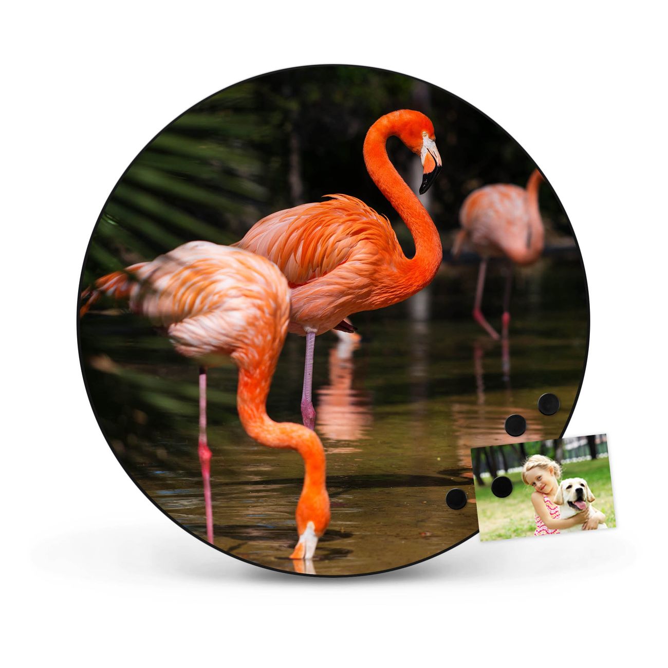 FUNKTION / DESIGN Die banjado Magnettafel mit dem Motiv Motiv Flamingo bringt Ordnung in Ihr Zettelchaos. Fotos, Termine, Notizen oder Rezepte lassen Sich hier stilvoll mit Magneten ordnen, Sie behalten alles im Blick. Die Design Magnetwand ist beschreibbar und wieder abwischbar. Mit dieser Pinnwand haben Sie auch ohne Notizen und Magneten ein schönes Dekoelement. Das Format bietet Ihnen ausreichend Platz um alle wichtigen Informationen im Blick zu behalten. DETAILS / NUTZEN Die magnetische Metall Pinnwand besteht aus schwarz lackiertem Stahl. Sie hat einen Durchmesser von 47cm. Es befinden sich an den Seiten zwei vorgefertigte Löcher die eine schnelle und unkomplizierte Anbringung ermöglichen. Das Motiv ist mit einem seidenmatten Laminat versehen und schützt so zusätzlich vor Kratzern. Es halten alle handelsüblichen Magneten daran. Wir sind ein kleines Team aus dem Herzen von Sachsen. Wir fertigen alle Artikel von Hand für Sie an, Sie erhalten keine preiswerte Importware. Auf Wunsch können Sie auch Ihr eigenes Foto auf die Magnettafel aufbringen, schreiben Sie uns an.