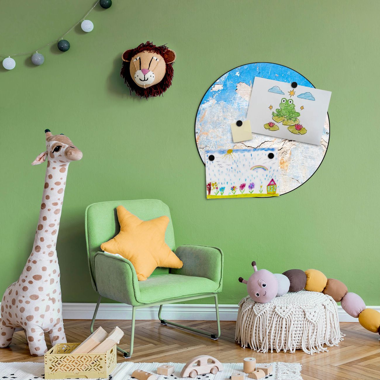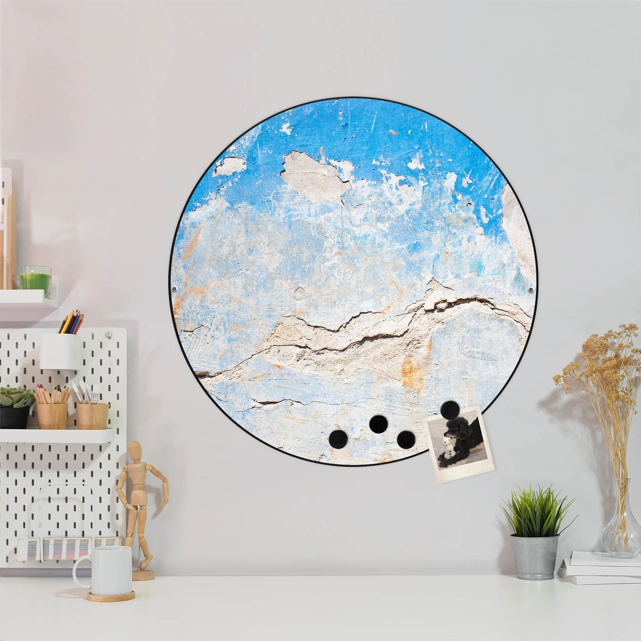 FUNKTION / DESIGN Die banjado Magnettafel mit dem Motiv Motiv Gebrochene Wand bringt Ordnung in Ihr Zettelchaos. Fotos, Termine, Notizen oder Rezepte lassen Sich hier stilvoll mit Magneten ordnen, Sie behalten alles im Blick. Die Design Magnetwand ist beschreibbar und wieder abwischbar. Mit dieser Pinnwand haben Sie auch ohne Notizen und Magneten ein schönes Dekoelement. Das Format bietet Ihnen ausreichend Platz um alle wichtigen Informationen im Blick zu behalten. DETAILS / NUTZEN Die magnetische Metall Pinnwand besteht aus schwarz lackiertem Stahl. Sie hat einen Durchmesser von 47cm. Es befinden sich an den Seiten zwei vorgefertigte Löcher die eine schnelle und unkomplizierte Anbringung ermöglichen. Das Motiv ist mit einem seidenmatten Laminat versehen und schützt so zusätzlich vor Kratzern. Es halten alle handelsüblichen Magneten daran. Wir sind ein kleines Team aus dem Herzen von Sachsen. Wir fertigen alle Artikel von Hand für Sie an, Sie erhalten keine preiswerte Importware. Auf Wunsch können Sie auch Ihr eigenes Foto auf die Magnettafel aufbringen, schreiben Sie uns an.