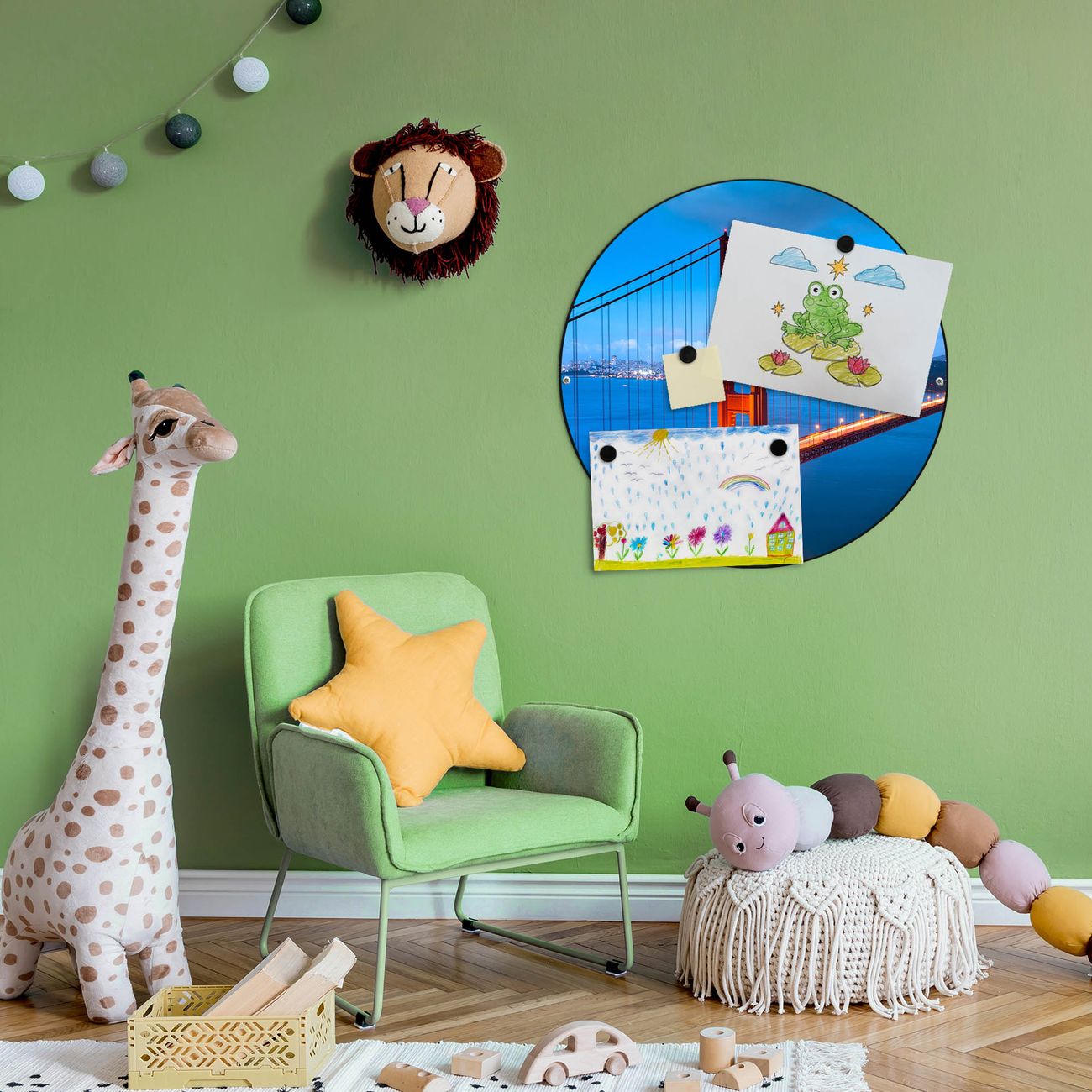 FUNKTION / DESIGN Die banjado Magnettafel mit dem Motiv Motiv Golden Gate Bridge bringt Ordnung in Ihr Zettelchaos. Fotos, Termine, Notizen oder Rezepte lassen Sich hier stilvoll mit Magneten ordnen, Sie behalten alles im Blick. Die Design Magnetwand ist beschreibbar und wieder abwischbar. Mit dieser Pinnwand haben Sie auch ohne Notizen und Magneten ein schönes Dekoelement. Das Format bietet Ihnen ausreichend Platz um alle wichtigen Informationen im Blick zu behalten. DETAILS / NUTZEN Die magnetische Metall Pinnwand besteht aus schwarz lackiertem Stahl. Sie hat einen Durchmesser von 47cm. Es befinden sich an den Seiten zwei vorgefertigte Löcher die eine schnelle und unkomplizierte Anbringung ermöglichen. Das Motiv ist mit einem seidenmatten Laminat versehen und schützt so zusätzlich vor Kratzern. Es halten alle handelsüblichen Magneten daran. Wir sind ein kleines Team aus dem Herzen von Sachsen. Wir fertigen alle Artikel von Hand für Sie an, Sie erhalten keine preiswerte Importware. Auf Wunsch können Sie auch Ihr eigenes Foto auf die Magnettafel aufbringen, schreiben Sie uns an.
