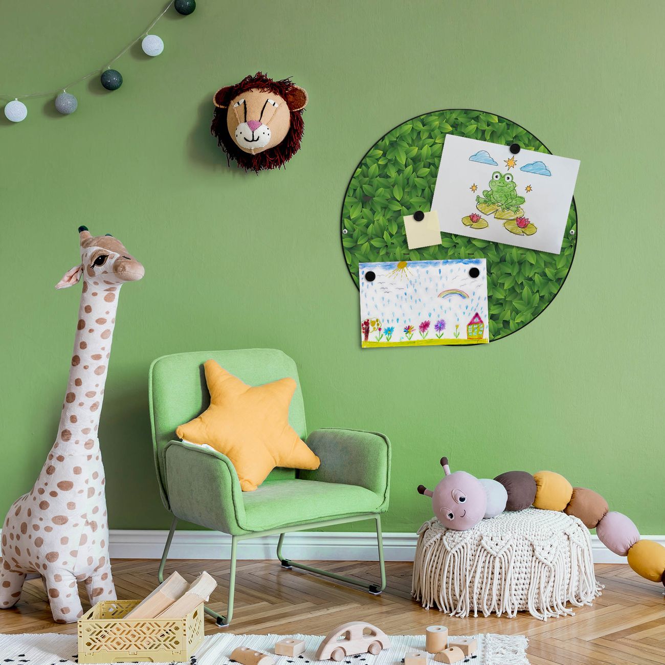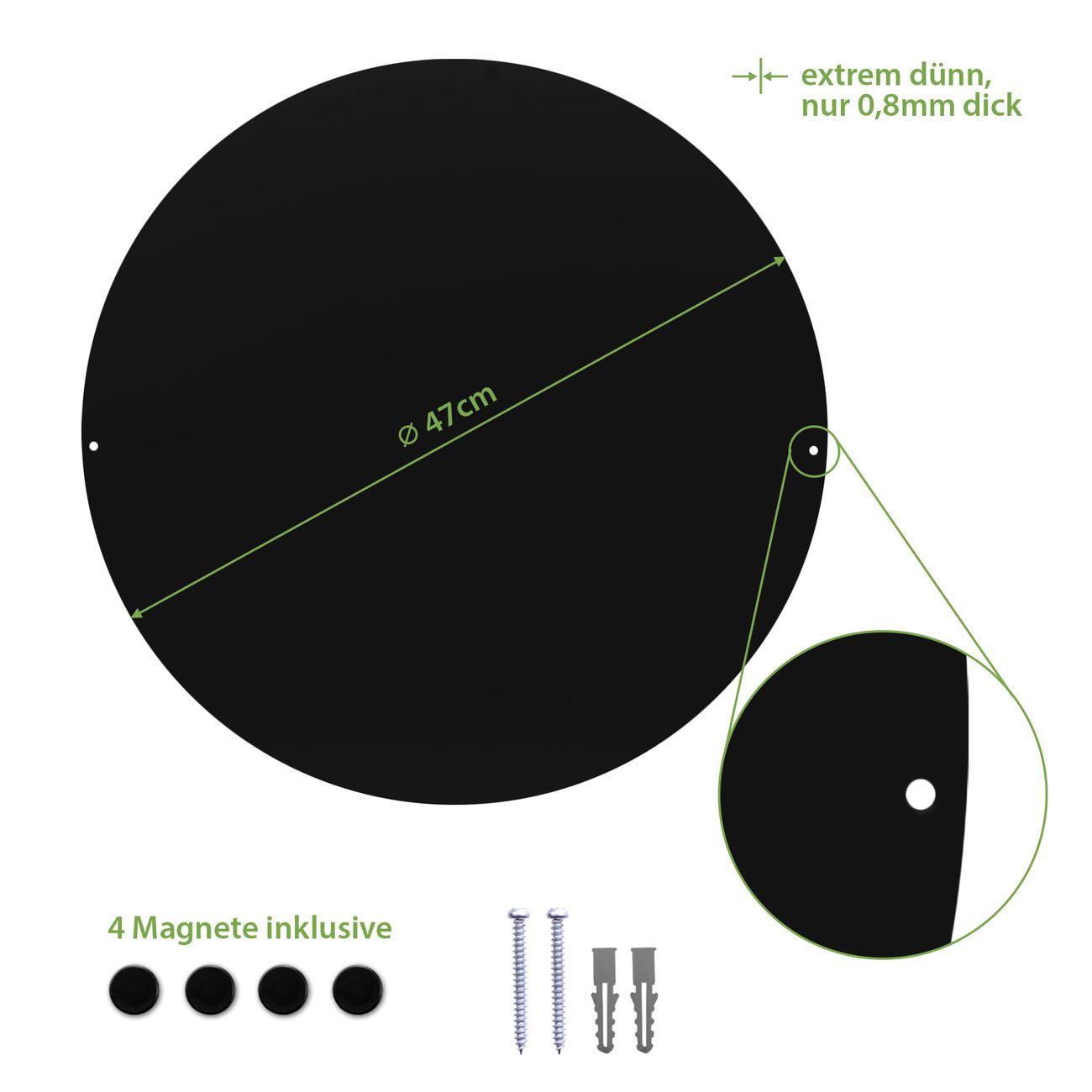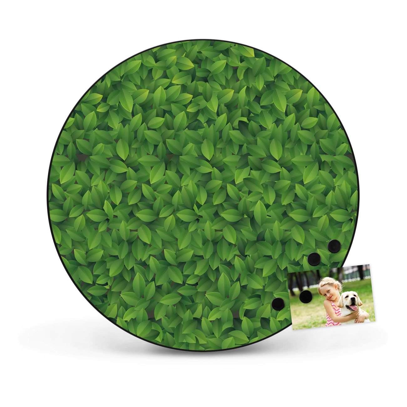FUNKTION / DESIGN Die banjado Magnettafel mit dem Motiv Motiv Grüne Blätter bringt Ordnung in Ihr Zettelchaos. Fotos, Termine, Notizen oder Rezepte lassen Sich hier stilvoll mit Magneten ordnen, Sie behalten alles im Blick. Die Design Magnetwand ist beschreibbar und wieder abwischbar. Mit dieser Pinnwand haben Sie auch ohne Notizen und Magneten ein schönes Dekoelement. Das Format bietet Ihnen ausreichend Platz um alle wichtigen Informationen im Blick zu behalten. DETAILS / NUTZEN Die magnetische Metall Pinnwand besteht aus schwarz lackiertem Stahl. Sie hat einen Durchmesser von 47cm. Es befinden sich an den Seiten zwei vorgefertigte Löcher die eine schnelle und unkomplizierte Anbringung ermöglichen. Das Motiv ist mit einem seidenmatten Laminat versehen und schützt so zusätzlich vor Kratzern. Es halten alle handelsüblichen Magneten daran. Wir sind ein kleines Team aus dem Herzen von Sachsen. Wir fertigen alle Artikel von Hand für Sie an, Sie erhalten keine preiswerte Importware. Auf Wunsch können Sie auch Ihr eigenes Foto auf die Magnettafel aufbringen, schreiben Sie uns an.