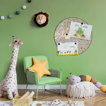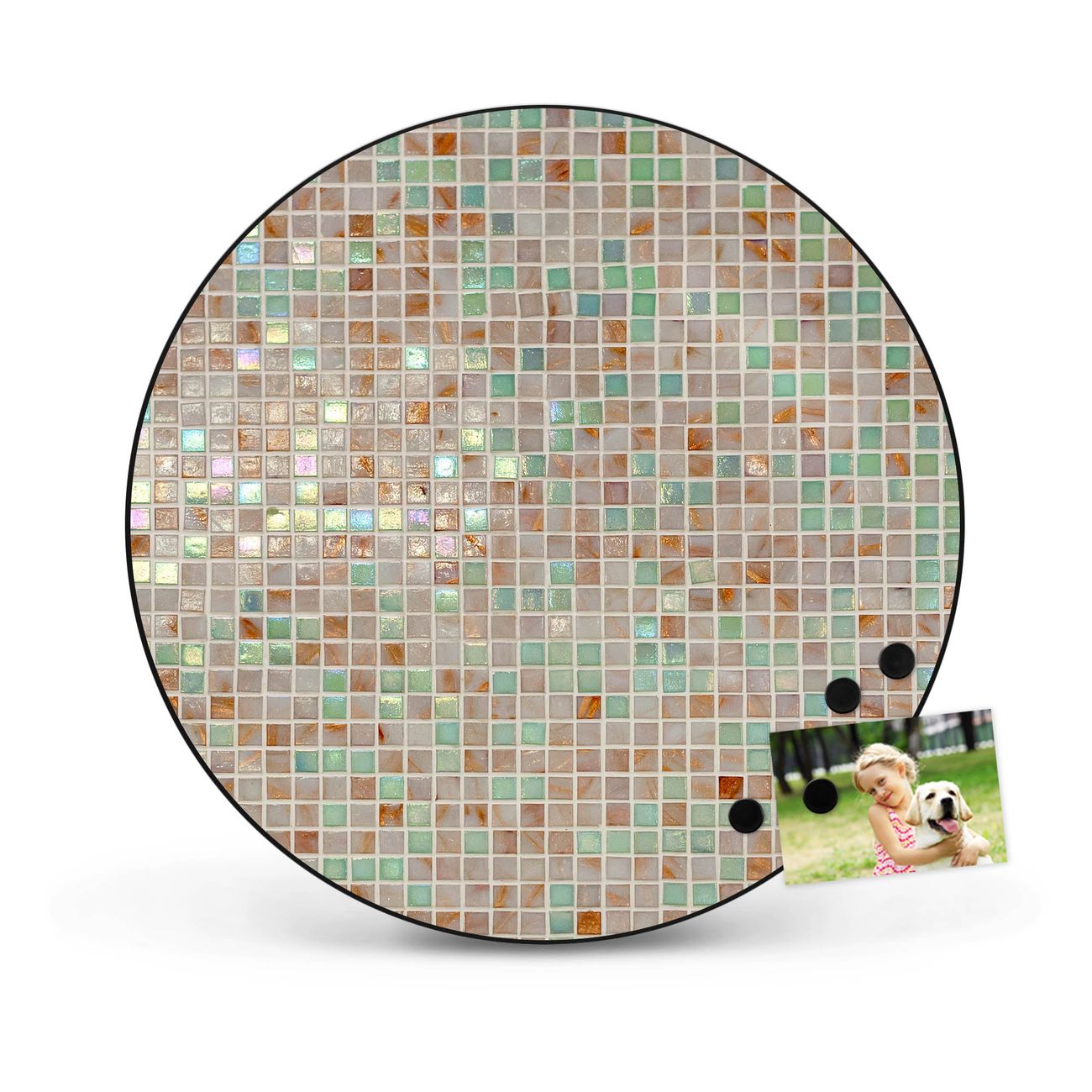 FUNKTION / DESIGN Die banjado Magnettafel mit dem Motiv Motiv Grüne Fliesen bringt Ordnung in Ihr Zettelchaos. Fotos, Termine, Notizen oder Rezepte lassen Sich hier stilvoll mit Magneten ordnen, Sie behalten alles im Blick. Die Design Magnetwand ist beschreibbar und wieder abwischbar. Mit dieser Pinnwand haben Sie auch ohne Notizen und Magneten ein schönes Dekoelement. Das Format bietet Ihnen ausreichend Platz um alle wichtigen Informationen im Blick zu behalten. DETAILS / NUTZEN Die magnetische Metall Pinnwand besteht aus schwarz lackiertem Stahl. Sie hat einen Durchmesser von 47cm. Es befinden sich an den Seiten zwei vorgefertigte Löcher die eine schnelle und unkomplizierte Anbringung ermöglichen. Das Motiv ist mit einem seidenmatten Laminat versehen und schützt so zusätzlich vor Kratzern. Es halten alle handelsüblichen Magneten daran. Wir sind ein kleines Team aus dem Herzen von Sachsen. Wir fertigen alle Artikel von Hand für Sie an, Sie erhalten keine preiswerte Importware. Auf Wunsch können Sie auch Ihr eigenes Foto auf die Magnettafel aufbringen, schreiben Sie uns an.