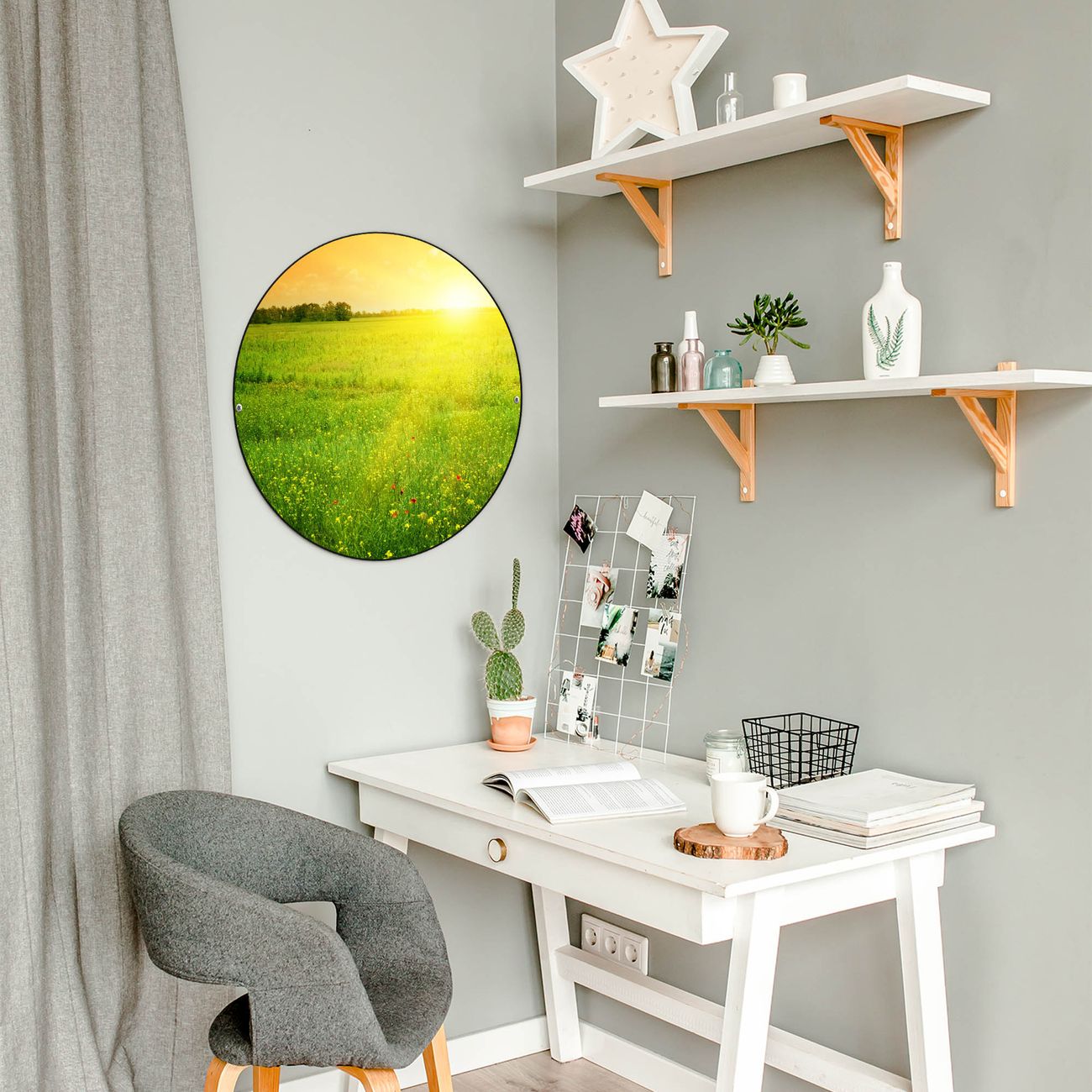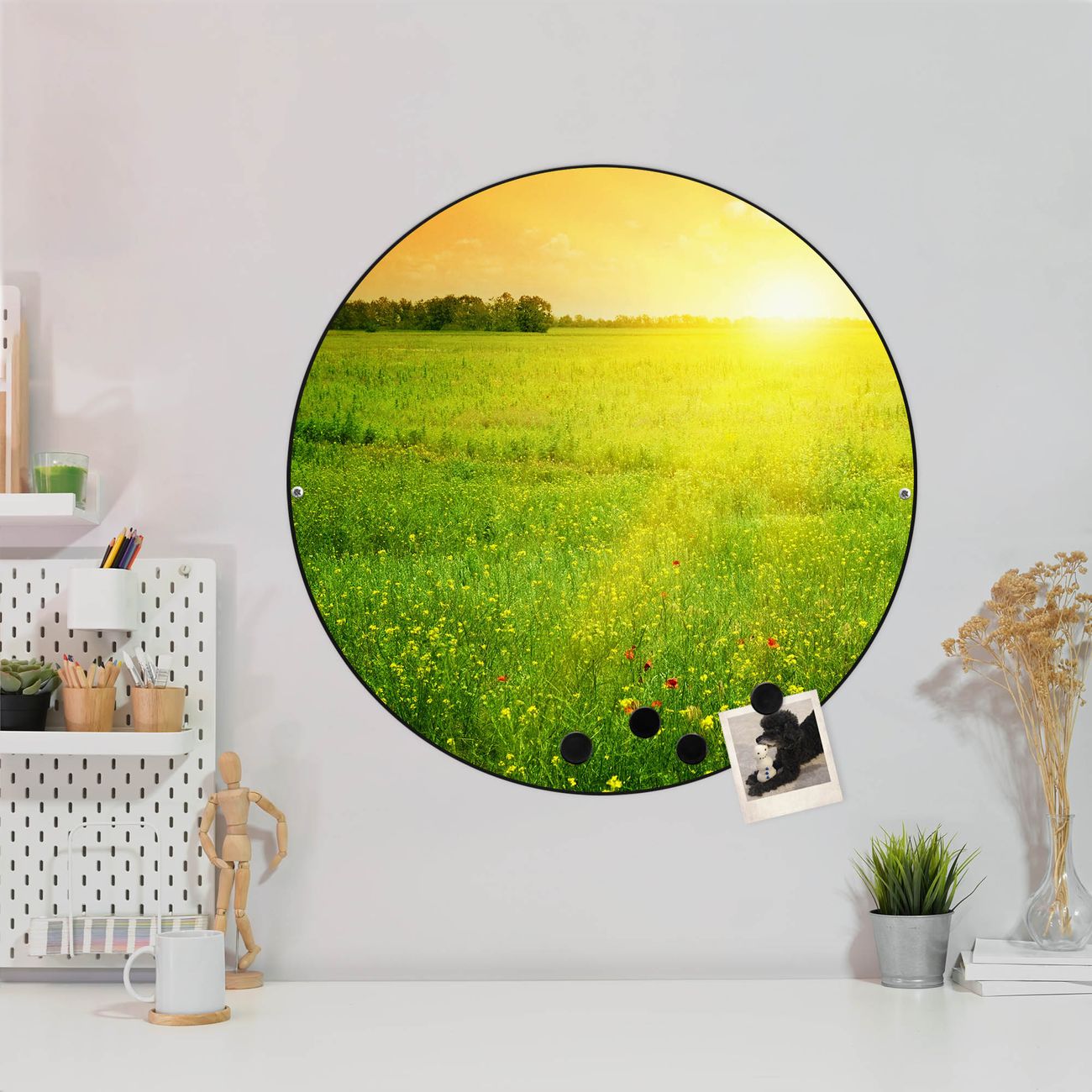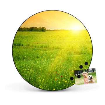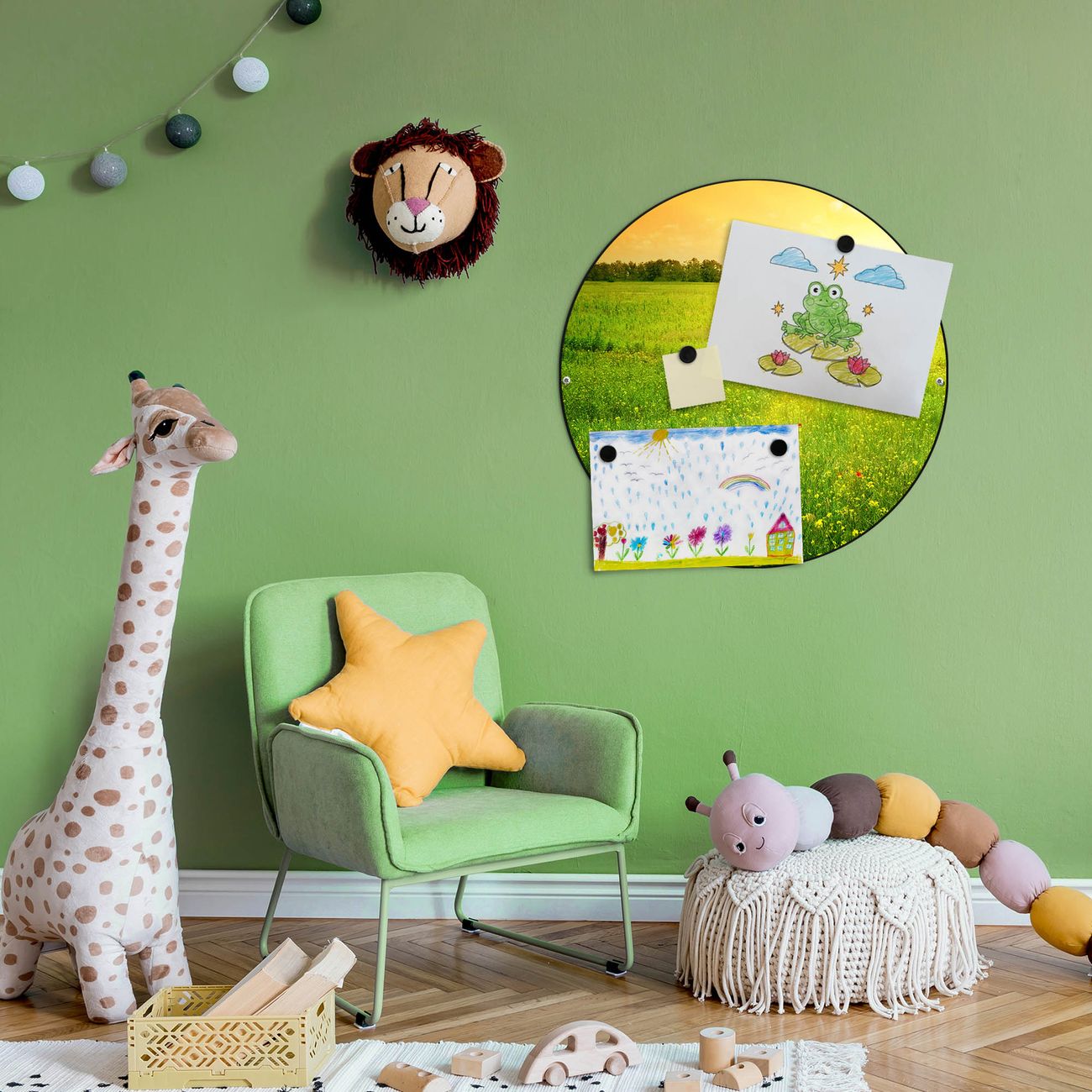 FUNKTION / DESIGN Die banjado Magnettafel mit dem Motiv Motiv Guten Morgen 2 bringt Ordnung in Ihr Zettelchaos. Fotos, Termine, Notizen oder Rezepte lassen Sich hier stilvoll mit Magneten ordnen, Sie behalten alles im Blick. Die Design Magnetwand ist beschreibbar und wieder abwischbar. Mit dieser Pinnwand haben Sie auch ohne Notizen und Magneten ein schönes Dekoelement. Das Format bietet Ihnen ausreichend Platz um alle wichtigen Informationen im Blick zu behalten. DETAILS / NUTZEN Die magnetische Metall Pinnwand besteht aus schwarz lackiertem Stahl. Sie hat einen Durchmesser von 47cm. Es befinden sich an den Seiten zwei vorgefertigte Löcher die eine schnelle und unkomplizierte Anbringung ermöglichen. Das Motiv ist mit einem seidenmatten Laminat versehen und schützt so zusätzlich vor Kratzern. Es halten alle handelsüblichen Magneten daran. Wir sind ein kleines Team aus dem Herzen von Sachsen. Wir fertigen alle Artikel von Hand für Sie an, Sie erhalten keine preiswerte Importware. Auf Wunsch können Sie auch Ihr eigenes Foto auf die Magnettafel aufbringen, schreiben Sie uns an.