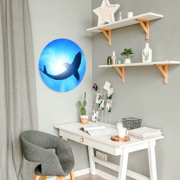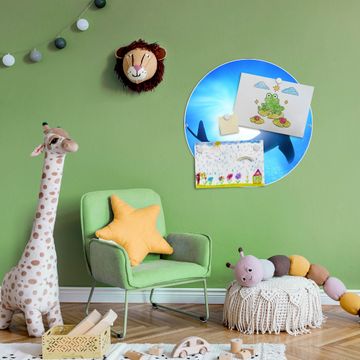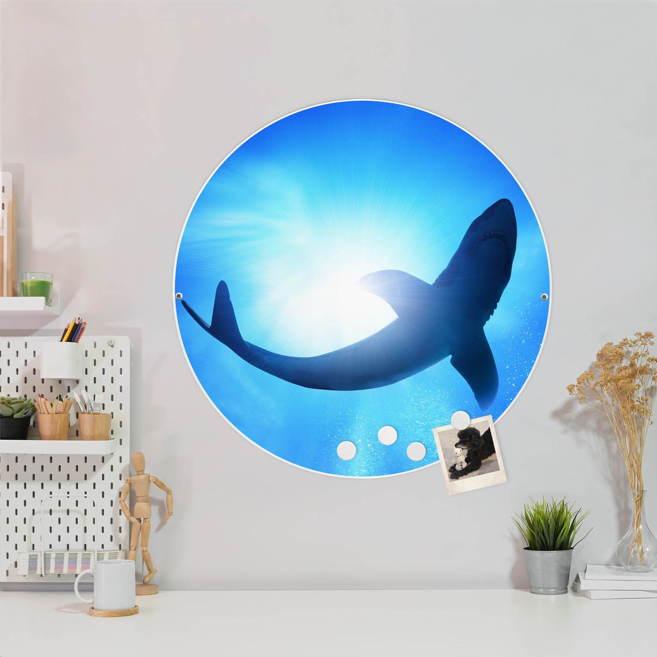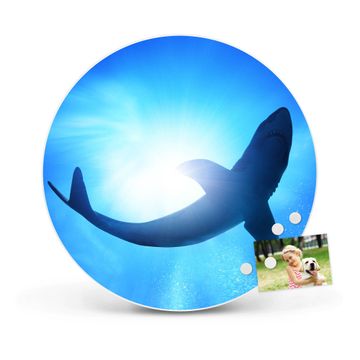 FUNKTION / DESIGN Die banjado Magnettafel mit dem Motiv Motiv Hai bringt Ordnung in Ihr Zettelchaos. Fotos, Termine, Notizen oder Rezepte lassen Sich hier stilvoll mit Magneten ordnen, Sie behalten alles im Blick. Die Design Magnetwand ist beschreibbar und wieder abwischbar. Mit dieser Pinnwand haben Sie auch ohne Notizen und Magneten ein schönes Dekoelement. Das Format bietet Ihnen ausreichend Platz um alle wichtigen Informationen im Blick zu behalten. DETAILS / NUTZEN Die magnetische Metall Pinnwand besteht aus weiß lackiertem Stahl. Sie hat einen Durchmesser von 47cm. Es befinden sich an den Seiten zwei vorgefertigte Löcher die eine schnelle und unkomplizierte Anbringung ermöglichen. Das Motiv ist mit einem seidenmatten Laminat versehen und schützt so zusätzlich vor Kratzern. Es halten alle handelsüblichen Magneten daran. Wir sind ein kleines Team aus dem Herzen von Sachsen. Wir fertigen alle Artikel von Hand für Sie an, Sie erhalten keine preiswerte Importware. Auf Wunsch können Sie auch Ihr eigenes Foto auf die Magnettafel aufbringen, schreiben Sie uns an.