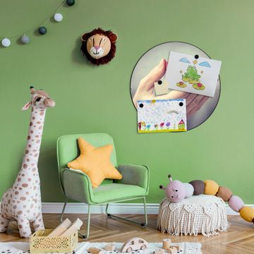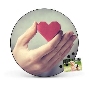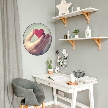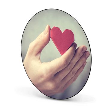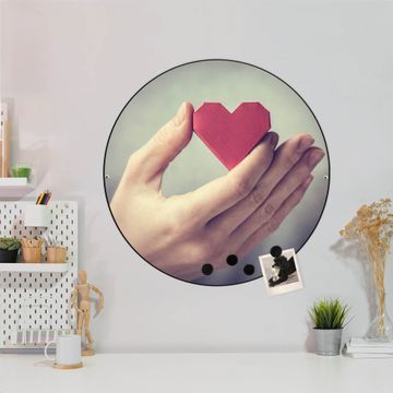 FUNKTION / DESIGN Die banjado Magnettafel mit dem Motiv Motiv Hand Aufs Herz bringt Ordnung in Ihr Zettelchaos. Fotos, Termine, Notizen oder Rezepte lassen Sich hier stilvoll mit Magneten ordnen, Sie behalten alles im Blick. Die Design Magnetwand ist beschreibbar und wieder abwischbar. Mit dieser Pinnwand haben Sie auch ohne Notizen und Magneten ein schönes Dekoelement. Das Format bietet Ihnen ausreichend Platz um alle wichtigen Informationen im Blick zu behalten. DETAILS / NUTZEN Die magnetische Metall Pinnwand besteht aus schwarz lackiertem Stahl. Sie hat einen Durchmesser von 47cm. Es befinden sich an den Seiten zwei vorgefertigte Löcher die eine schnelle und unkomplizierte Anbringung ermöglichen. Das Motiv ist mit einem seidenmatten Laminat versehen und schützt so zusätzlich vor Kratzern. Es halten alle handelsüblichen Magneten daran. Wir sind ein kleines Team aus dem Herzen von Sachsen. Wir fertigen alle Artikel von Hand für Sie an, Sie erhalten keine preiswerte Importware. Auf Wunsch können Sie auch Ihr eigenes Foto auf die Magnettafel aufbringen, schreiben Sie uns an.