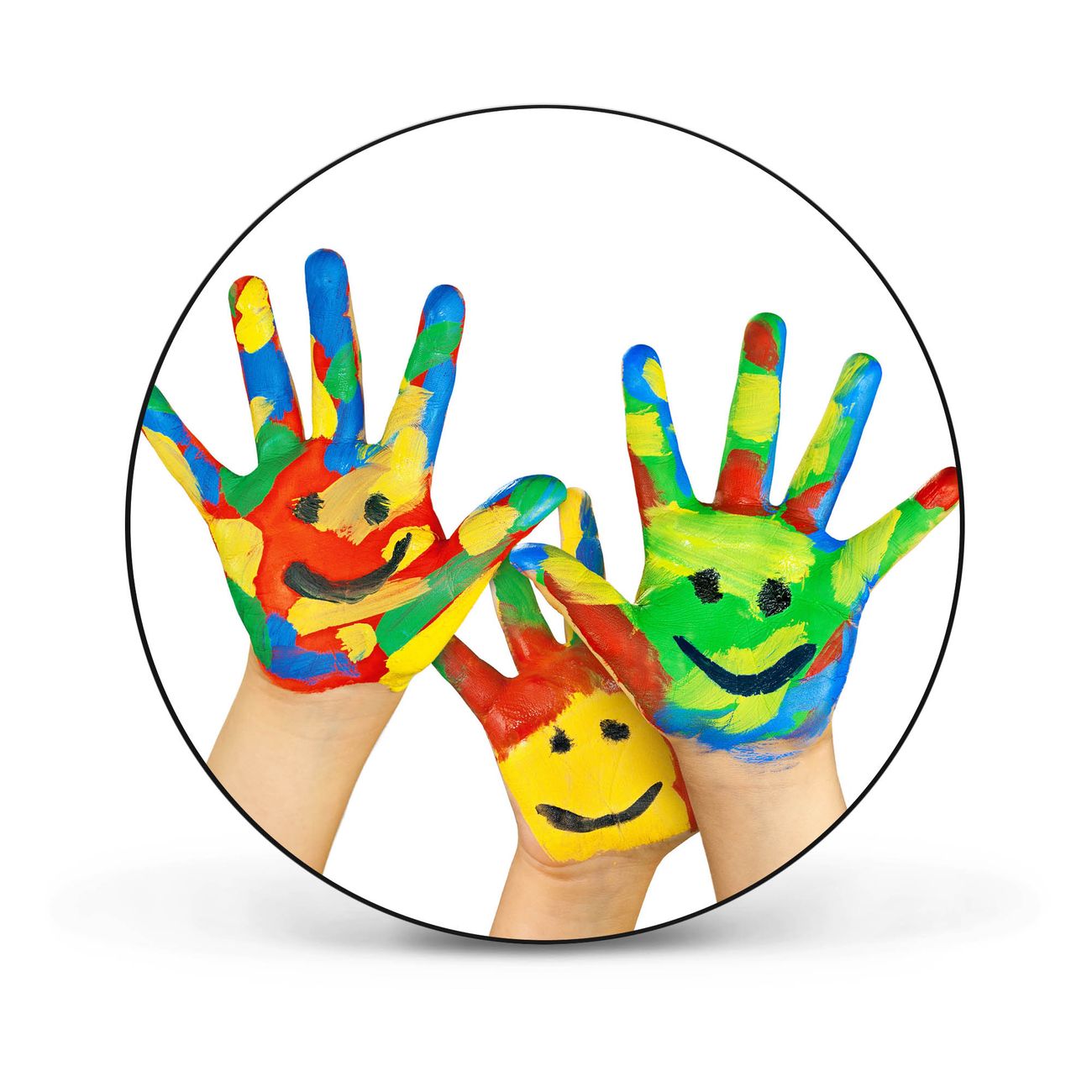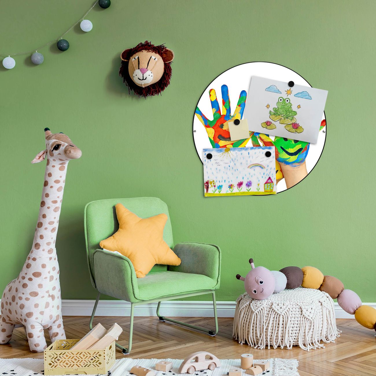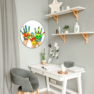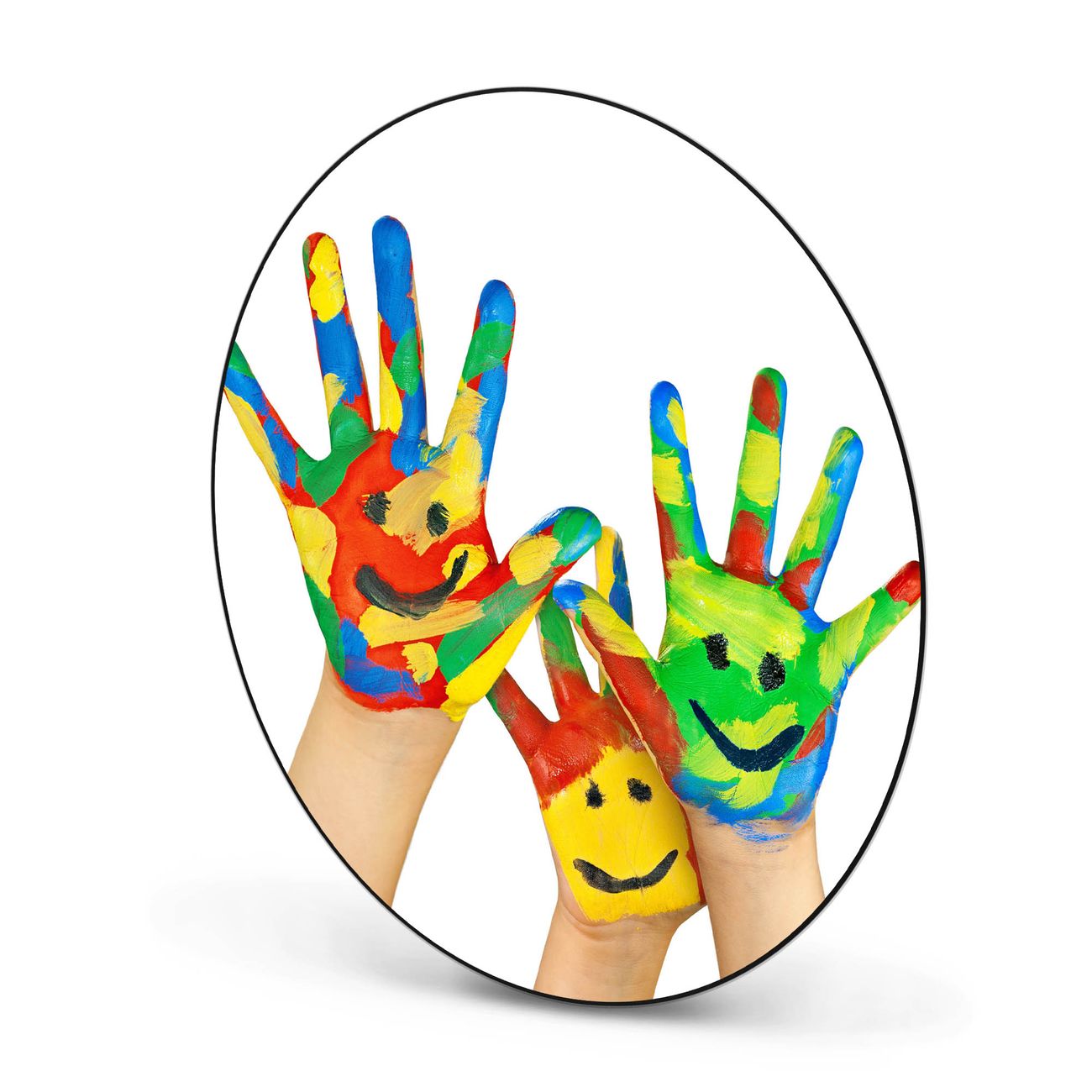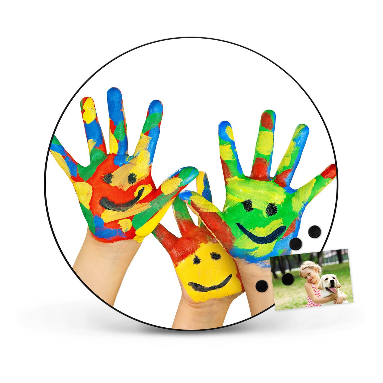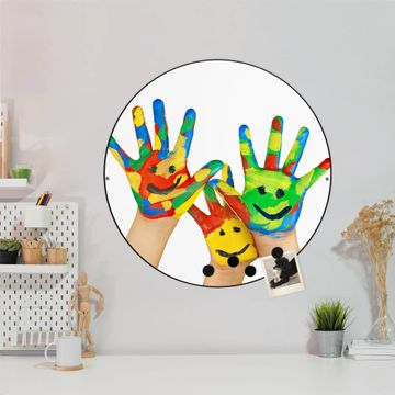 FUNKTION / DESIGN Die banjado Magnettafel mit dem Motiv Motiv Happy Hands bringt Ordnung in Ihr Zettelchaos. Fotos, Termine, Notizen oder Rezepte lassen Sich hier stilvoll mit Magneten ordnen, Sie behalten alles im Blick. Die Design Magnetwand ist beschreibbar und wieder abwischbar. Mit dieser Pinnwand haben Sie auch ohne Notizen und Magneten ein schönes Dekoelement. Das Format bietet Ihnen ausreichend Platz um alle wichtigen Informationen im Blick zu behalten. DETAILS / NUTZEN Die magnetische Metall Pinnwand besteht aus schwarz lackiertem Stahl. Sie hat einen Durchmesser von 47cm. Es befinden sich an den Seiten zwei vorgefertigte Löcher die eine schnelle und unkomplizierte Anbringung ermöglichen. Das Motiv ist mit einem seidenmatten Laminat versehen und schützt so zusätzlich vor Kratzern. Es halten alle handelsüblichen Magneten daran. Wir sind ein kleines Team aus dem Herzen von Sachsen. Wir fertigen alle Artikel von Hand für Sie an, Sie erhalten keine preiswerte Importware. Auf Wunsch können Sie auch Ihr eigenes Foto auf die Magnettafel aufbringen, schreiben Sie uns an.