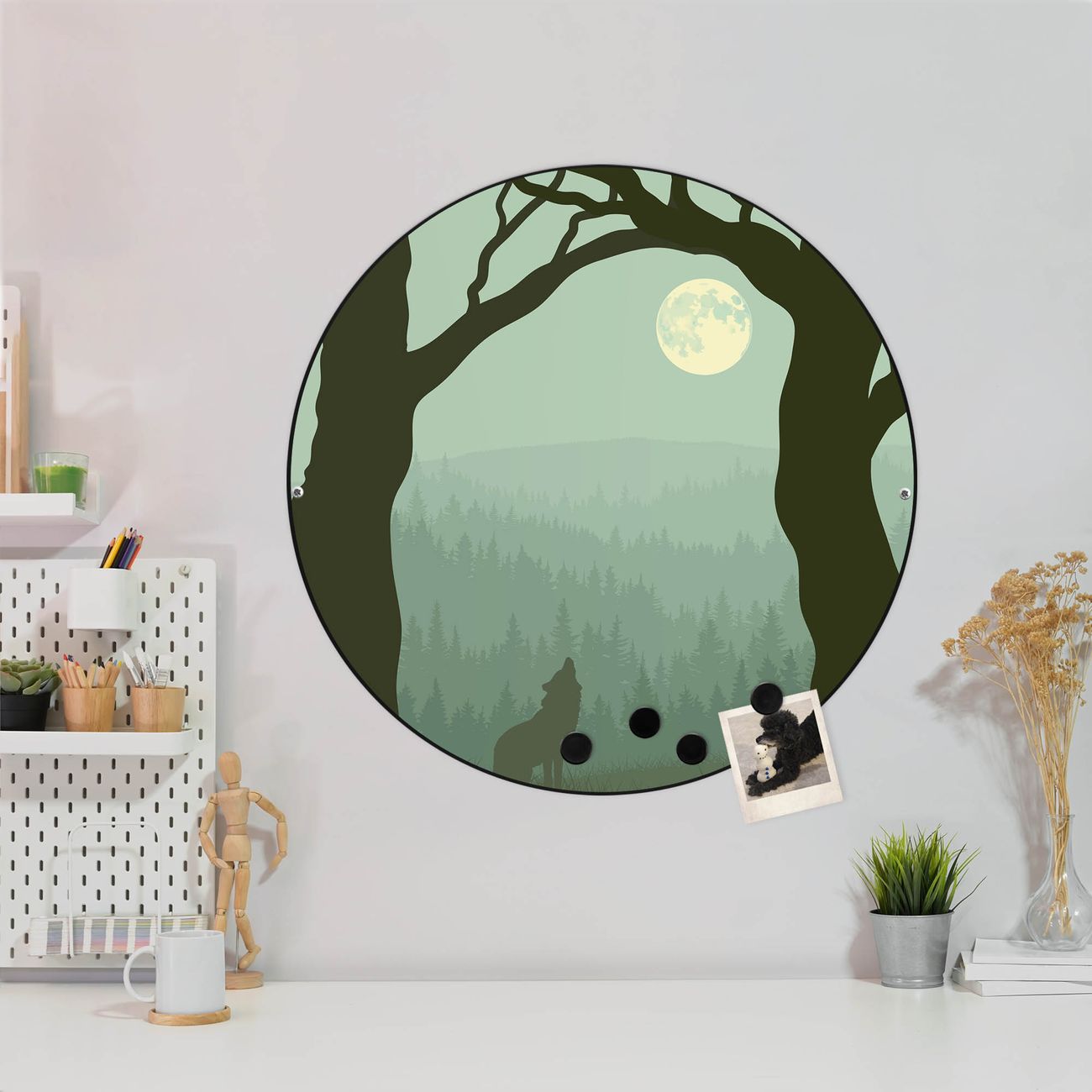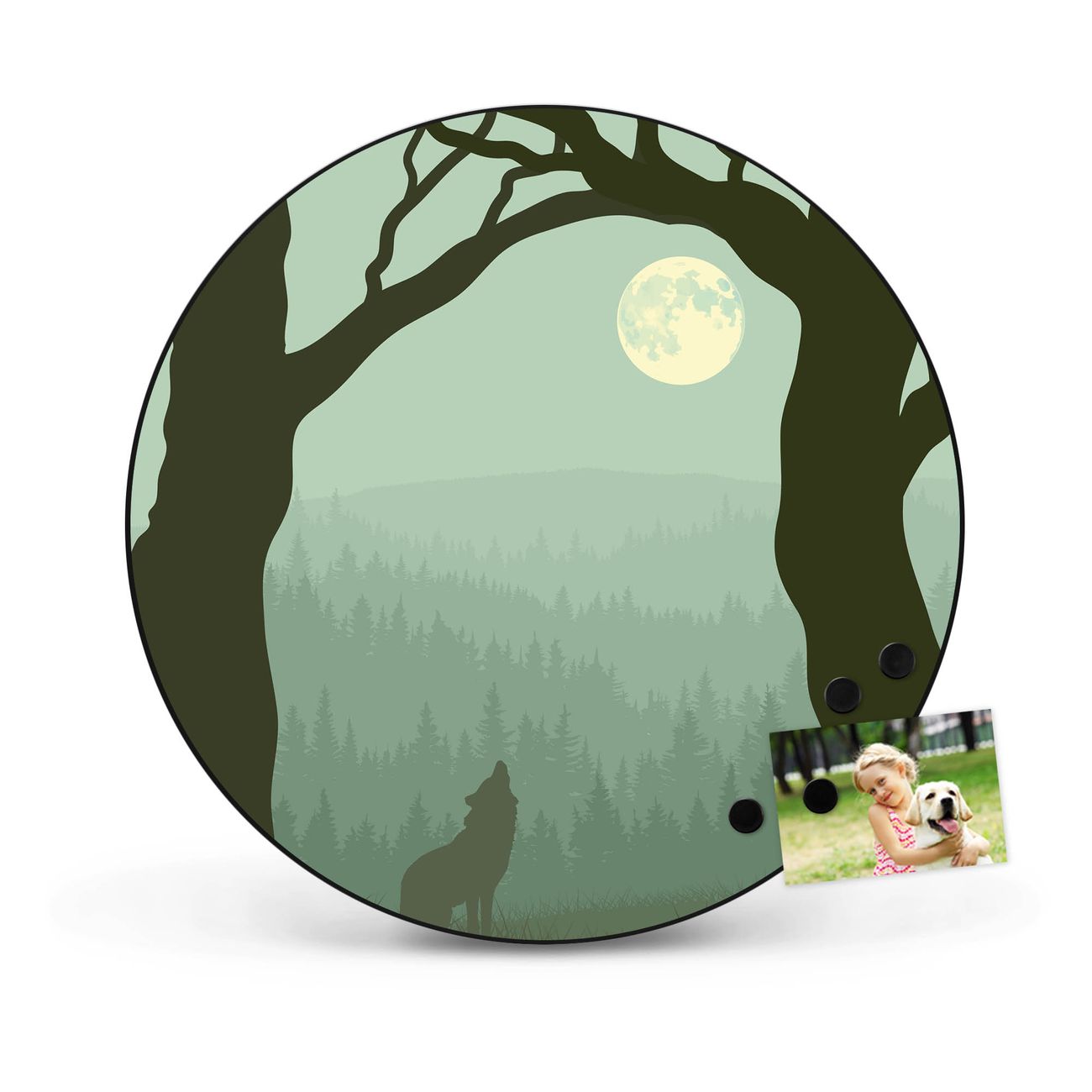 FUNKTION / DESIGN Die banjado Magnettafel mit dem Motiv Motiv Heulender Wolf bringt Ordnung in Ihr Zettelchaos. Fotos, Termine, Notizen oder Rezepte lassen Sich hier stilvoll mit Magneten ordnen, Sie behalten alles im Blick. Die Design Magnetwand ist beschreibbar und wieder abwischbar. Mit dieser Pinnwand haben Sie auch ohne Notizen und Magneten ein schönes Dekoelement. Das Format bietet Ihnen ausreichend Platz um alle wichtigen Informationen im Blick zu behalten. DETAILS / NUTZEN Die magnetische Metall Pinnwand besteht aus schwarz lackiertem Stahl. Sie hat einen Durchmesser von 47cm. Es befinden sich an den Seiten zwei vorgefertigte Löcher die eine schnelle und unkomplizierte Anbringung ermöglichen. Das Motiv ist mit einem seidenmatten Laminat versehen und schützt so zusätzlich vor Kratzern. Es halten alle handelsüblichen Magneten daran. Wir sind ein kleines Team aus dem Herzen von Sachsen. Wir fertigen alle Artikel von Hand für Sie an, Sie erhalten keine preiswerte Importware. Auf Wunsch können Sie auch Ihr eigenes Foto auf die Magnettafel aufbringen, schreiben Sie uns an.