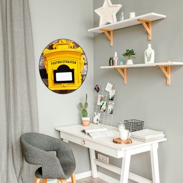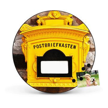 FUNKTION / DESIGN Die banjado Magnettafel mit dem Motiv Motiv Historischer Postkasten bringt Ordnung in Ihr Zettelchaos. Fotos, Termine, Notizen oder Rezepte lassen Sich hier stilvoll mit Magneten ordnen, Sie behalten alles im Blick. Die Design Magnetwand ist beschreibbar und wieder abwischbar. Mit dieser Pinnwand haben Sie auch ohne Notizen und Magneten ein schönes Dekoelement. Das Format bietet Ihnen ausreichend Platz um alle wichtigen Informationen im Blick zu behalten. DETAILS / NUTZEN Die magnetische Metall Pinnwand besteht aus schwarz lackiertem Stahl. Sie hat einen Durchmesser von 47cm. Es befinden sich an den Seiten zwei vorgefertigte Löcher die eine schnelle und unkomplizierte Anbringung ermöglichen. Das Motiv ist mit einem seidenmatten Laminat versehen und schützt so zusätzlich vor Kratzern. Es halten alle handelsüblichen Magneten daran. Wir sind ein kleines Team aus dem Herzen von Sachsen. Wir fertigen alle Artikel von Hand für Sie an, Sie erhalten keine preiswerte Importware. Auf Wunsch können Sie auch Ihr eigenes Foto auf die Magnettafel aufbringen, schreiben Sie uns an.