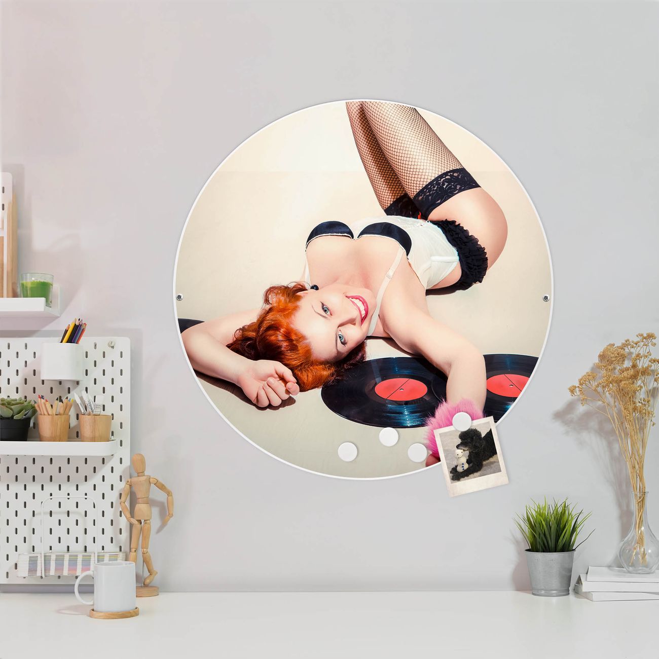 FUNKTION / DESIGN Die banjado Magnettafel mit dem Motiv Hot Vinyl bringt Ordnung in Ihr Zettelchaos. Fotos, Termine, Notizen oder Rezepte lassen Sich hier stilvoll mit Magneten ordnen, Sie behalten alles im Blick. Die Design Magnetwand ist beschreibbar und wieder abwischbar. Mit dieser Pinnwand haben Sie auch ohne Notizen und Magneten ein schönes Dekoelement. Das Format bietet Ihnen ausreichend Platz um alle wichtigen Informationen im Blick zu behalten. DETAILS / NUTZEN Die magnetische Metall Pinnwand besteht aus weiß lackiertem Stahl. Sie hat einen Durchmesser von 47cm. Es befinden sich an den Seiten zwei vorgefertigte Löcher die eine schnelle und unkomplizierte Anbringung ermöglichen. Das Motiv ist mit einem seidenmatten Laminat versehen und schützt so zusätzlich vor Kratzern. Es halten alle handelsüblichen Magneten daran. Wir sind ein kleines Team aus dem Herzen von Sachsen. Wir fertigen alle Artikel von Hand für Sie an, Sie erhalten keine preiswerte Importware. Auf Wunsch können Sie auch Ihr eigenes Foto auf die Magnettafel aufbringen, schreiben Sie uns an.