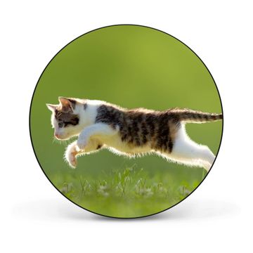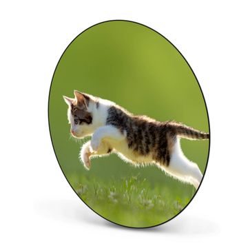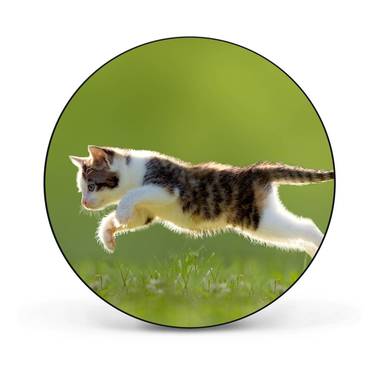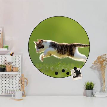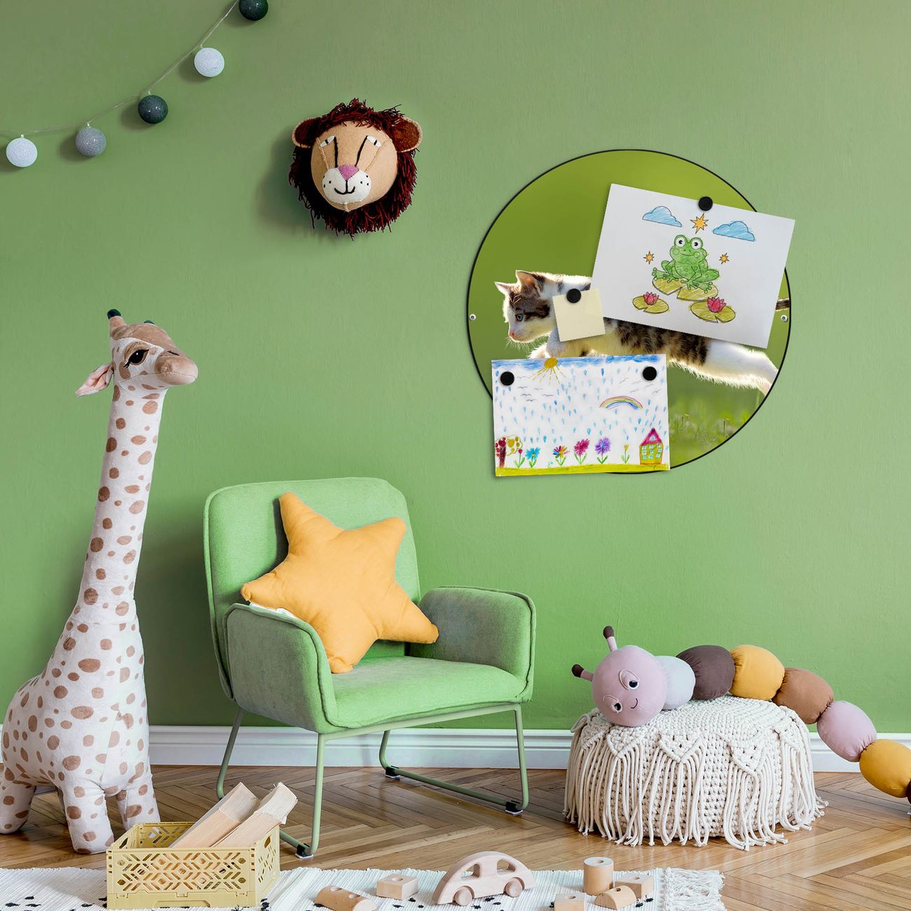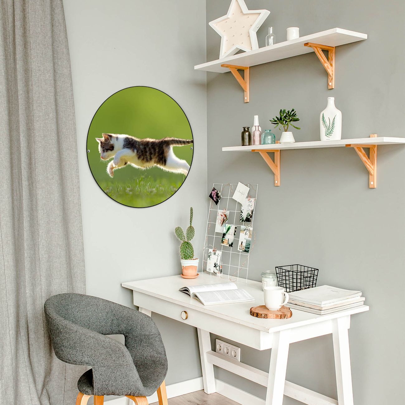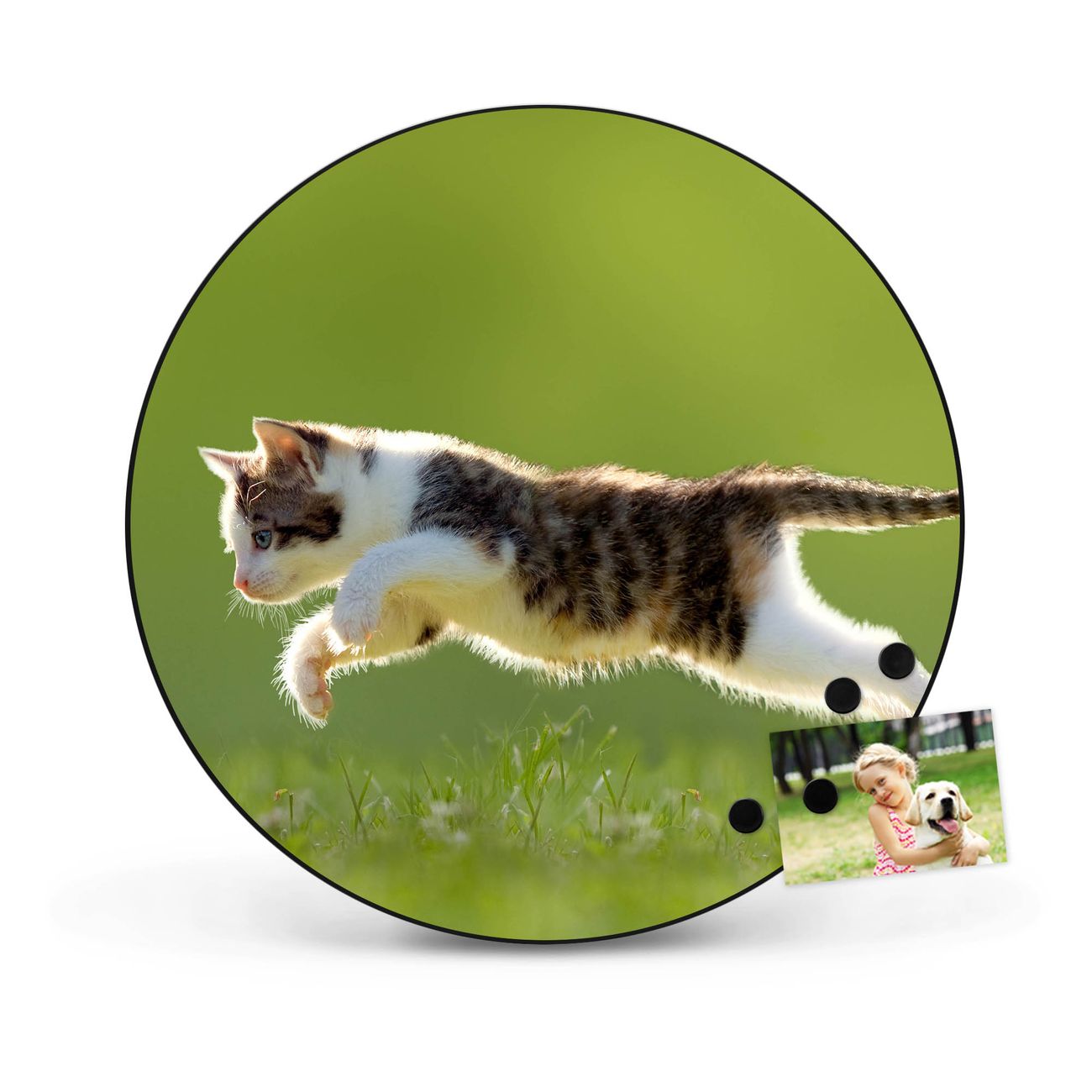 FUNKTION / DESIGN Die banjado Magnettafel mit dem Motiv Motiv Jagende Katze bringt Ordnung in Ihr Zettelchaos. Fotos, Termine, Notizen oder Rezepte lassen Sich hier stilvoll mit Magneten ordnen, Sie behalten alles im Blick. Die Design Magnetwand ist beschreibbar und wieder abwischbar. Mit dieser Pinnwand haben Sie auch ohne Notizen und Magneten ein schönes Dekoelement. Das Format bietet Ihnen ausreichend Platz um alle wichtigen Informationen im Blick zu behalten. DETAILS / NUTZEN Die magnetische Metall Pinnwand besteht aus schwarz lackiertem Stahl. Sie hat einen Durchmesser von 47cm. Es befinden sich an den Seiten zwei vorgefertigte Löcher die eine schnelle und unkomplizierte Anbringung ermöglichen. Das Motiv ist mit einem seidenmatten Laminat versehen und schützt so zusätzlich vor Kratzern. Es halten alle handelsüblichen Magneten daran. Wir sind ein kleines Team aus dem Herzen von Sachsen. Wir fertigen alle Artikel von Hand für Sie an, Sie erhalten keine preiswerte Importware. Auf Wunsch können Sie auch Ihr eigenes Foto auf die Magnettafel aufbringen, schreiben Sie uns an.