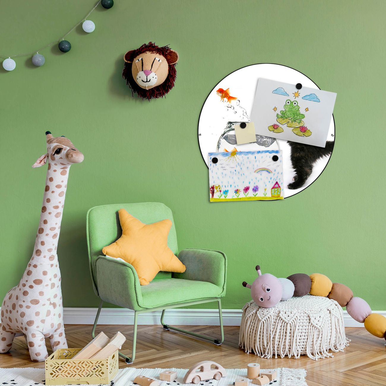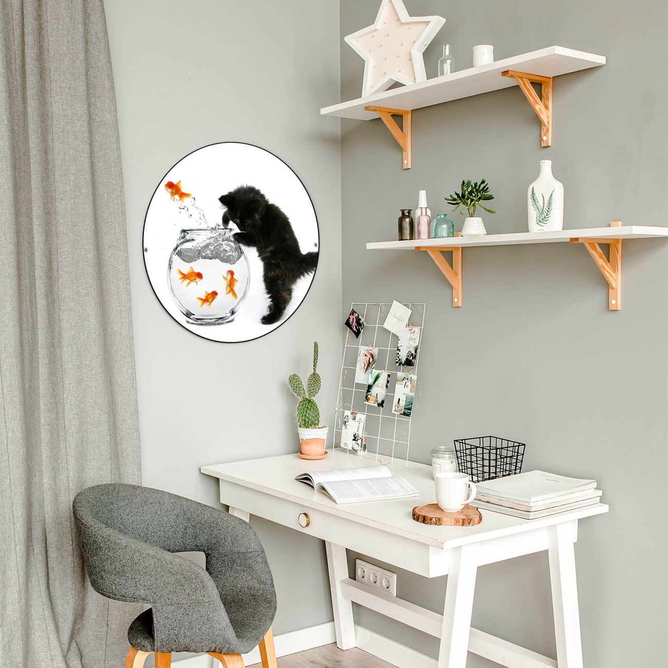 FUNKTION / DESIGN Die banjado Magnettafel mit dem Motiv Motiv Katze Und Fisch bringt Ordnung in Ihr Zettelchaos. Fotos, Termine, Notizen oder Rezepte lassen Sich hier stilvoll mit Magneten ordnen, Sie behalten alles im Blick. Die Design Magnetwand ist beschreibbar und wieder abwischbar. Mit dieser Pinnwand haben Sie auch ohne Notizen und Magneten ein schönes Dekoelement. Das Format bietet Ihnen ausreichend Platz um alle wichtigen Informationen im Blick zu behalten. DETAILS / NUTZEN Die magnetische Metall Pinnwand besteht aus schwarz lackiertem Stahl. Sie hat einen Durchmesser von 47cm. Es befinden sich an den Seiten zwei vorgefertigte Löcher die eine schnelle und unkomplizierte Anbringung ermöglichen. Das Motiv ist mit einem seidenmatten Laminat versehen und schützt so zusätzlich vor Kratzern. Es halten alle handelsüblichen Magneten daran. Wir sind ein kleines Team aus dem Herzen von Sachsen. Wir fertigen alle Artikel von Hand für Sie an, Sie erhalten keine preiswerte Importware. Auf Wunsch können Sie auch Ihr eigenes Foto auf die Magnettafel aufbringen, schreiben Sie uns an.