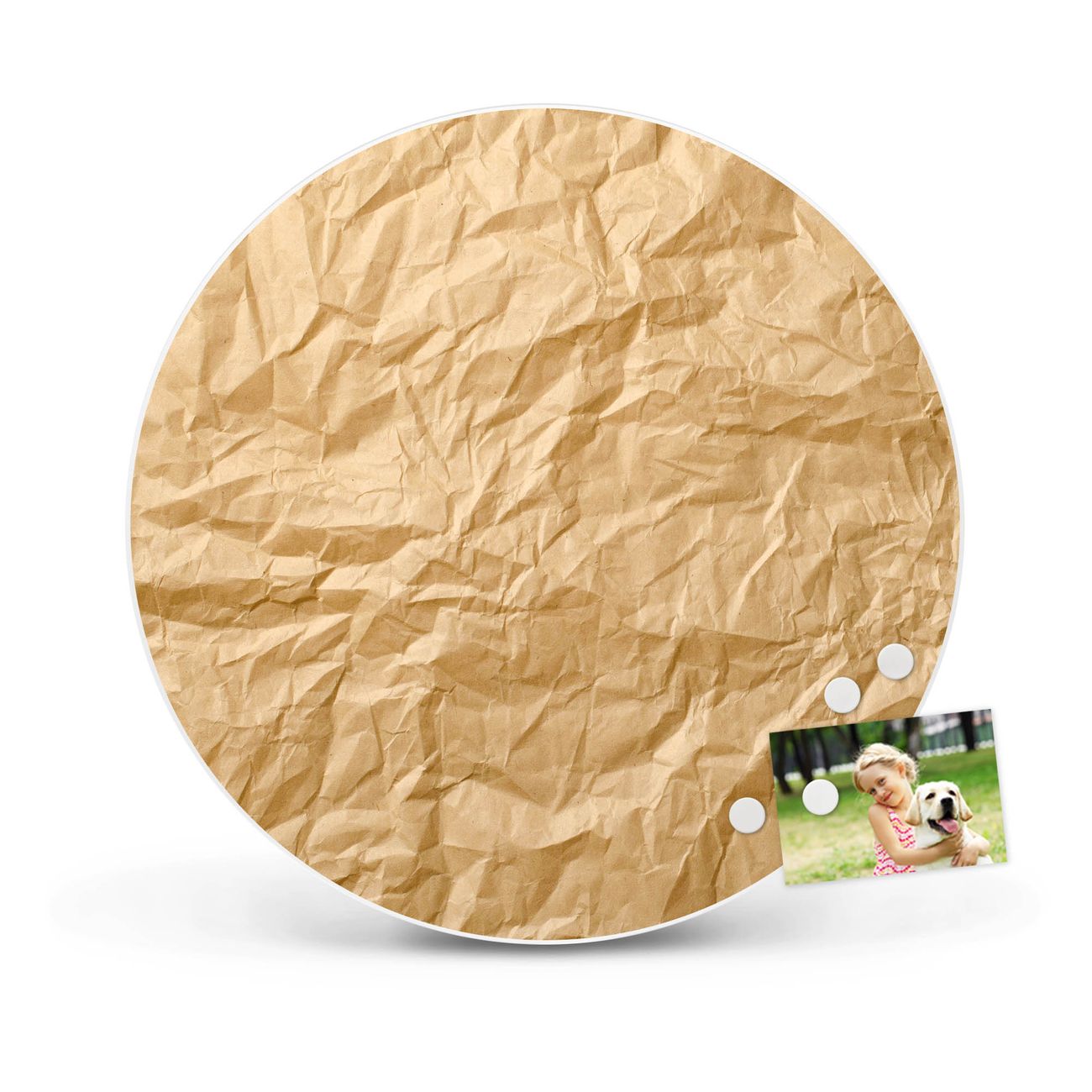 FUNKTION / DESIGN Die banjado Magnettafel mit dem Motiv Motiv Knüllpapier bringt Ordnung in Ihr Zettelchaos. Fotos, Termine, Notizen oder Rezepte lassen Sich hier stilvoll mit Magneten ordnen, Sie behalten alles im Blick. Die Design Magnetwand ist beschreibbar und wieder abwischbar. Mit dieser Pinnwand haben Sie auch ohne Notizen und Magneten ein schönes Dekoelement. Das Format bietet Ihnen ausreichend Platz um alle wichtigen Informationen im Blick zu behalten. DETAILS / NUTZEN Die magnetische Metall Pinnwand besteht aus weiß lackiertem Stahl. Sie hat einen Durchmesser von 47cm. Es befinden sich an den Seiten zwei vorgefertigte Löcher die eine schnelle und unkomplizierte Anbringung ermöglichen. Das Motiv ist mit einem seidenmatten Laminat versehen und schützt so zusätzlich vor Kratzern. Es halten alle handelsüblichen Magneten daran. Wir sind ein kleines Team aus dem Herzen von Sachsen. Wir fertigen alle Artikel von Hand für Sie an, Sie erhalten keine preiswerte Importware. Auf Wunsch können Sie auch Ihr eigenes Foto auf die Magnettafel aufbringen, schreiben Sie uns an.