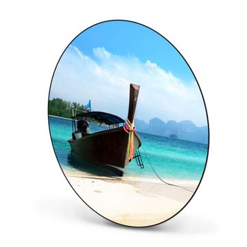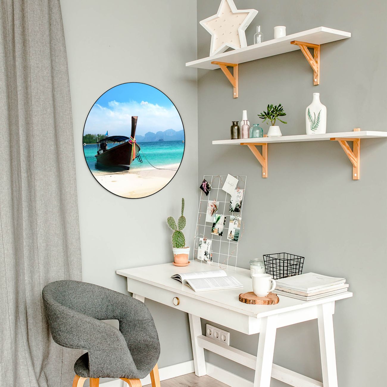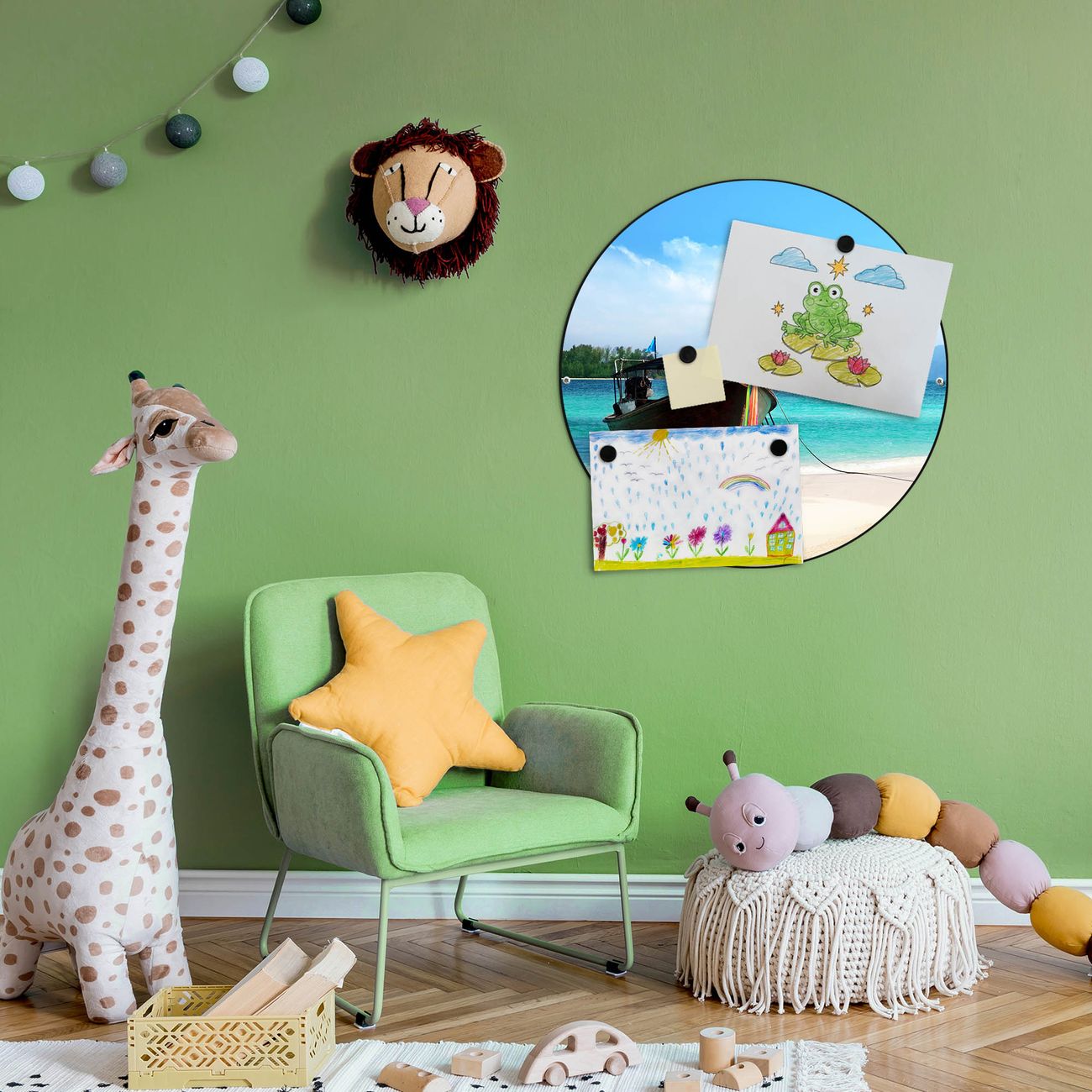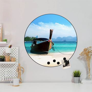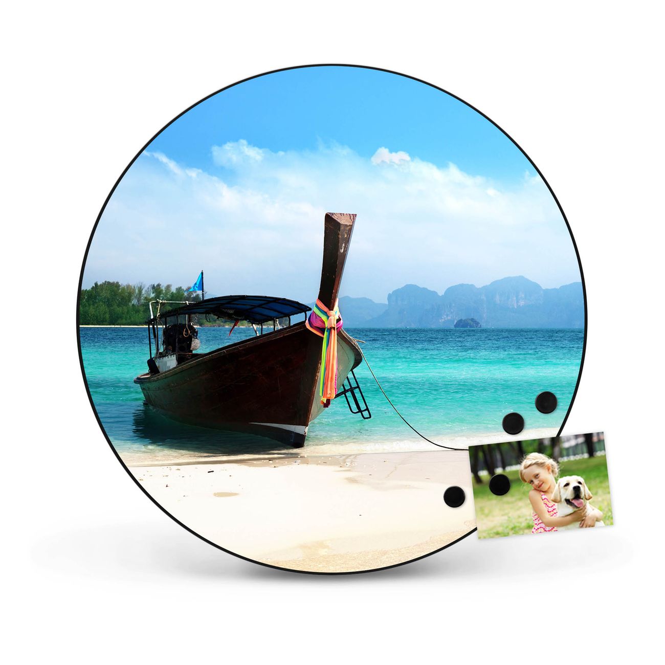 FUNKTION / DESIGN Die banjado Magnettafel mit dem Motiv Motiv Koh Poda bringt Ordnung in Ihr Zettelchaos. Fotos, Termine, Notizen oder Rezepte lassen Sich hier stilvoll mit Magneten ordnen, Sie behalten alles im Blick. Die Design Magnetwand ist beschreibbar und wieder abwischbar. Mit dieser Pinnwand haben Sie auch ohne Notizen und Magneten ein schönes Dekoelement. Das Format bietet Ihnen ausreichend Platz um alle wichtigen Informationen im Blick zu behalten. DETAILS / NUTZEN Die magnetische Metall Pinnwand besteht aus schwarz lackiertem Stahl. Sie hat einen Durchmesser von 47cm. Es befinden sich an den Seiten zwei vorgefertigte Löcher die eine schnelle und unkomplizierte Anbringung ermöglichen. Das Motiv ist mit einem seidenmatten Laminat versehen und schützt so zusätzlich vor Kratzern. Es halten alle handelsüblichen Magneten daran. Wir sind ein kleines Team aus dem Herzen von Sachsen. Wir fertigen alle Artikel von Hand für Sie an, Sie erhalten keine preiswerte Importware. Auf Wunsch können Sie auch Ihr eigenes Foto auf die Magnettafel aufbringen, schreiben Sie uns an.
