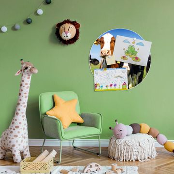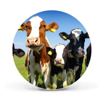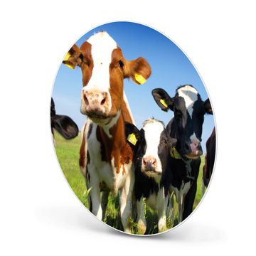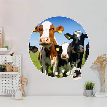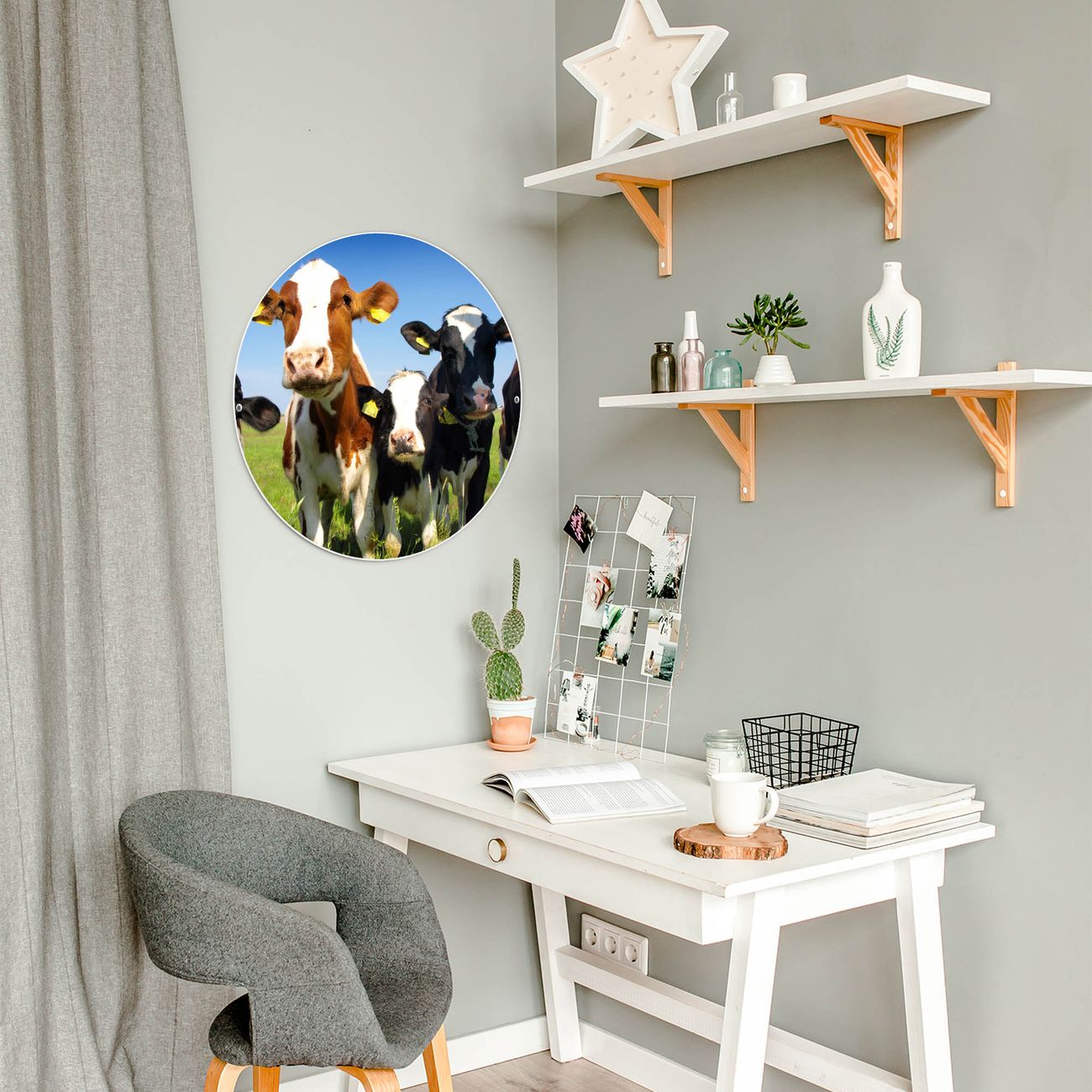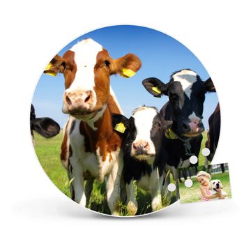 FUNKTION / DESIGN Die banjado Magnettafel mit dem Motiv Motiv Kühe bringt Ordnung in Ihr Zettelchaos. Fotos, Termine, Notizen oder Rezepte lassen Sich hier stilvoll mit Magneten ordnen, Sie behalten alles im Blick. Die Design Magnetwand ist beschreibbar und wieder abwischbar. Mit dieser Pinnwand haben Sie auch ohne Notizen und Magneten ein schönes Dekoelement. Das Format bietet Ihnen ausreichend Platz um alle wichtigen Informationen im Blick zu behalten. DETAILS / NUTZEN Die magnetische Metall Pinnwand besteht aus weiß lackiertem Stahl. Sie hat einen Durchmesser von 47cm. Es befinden sich an den Seiten zwei vorgefertigte Löcher die eine schnelle und unkomplizierte Anbringung ermöglichen. Das Motiv ist mit einem seidenmatten Laminat versehen und schützt so zusätzlich vor Kratzern. Es halten alle handelsüblichen Magneten daran. Wir sind ein kleines Team aus dem Herzen von Sachsen. Wir fertigen alle Artikel von Hand für Sie an, Sie erhalten keine preiswerte Importware. Auf Wunsch können Sie auch Ihr eigenes Foto auf die Magnettafel aufbringen, schreiben Sie uns an.