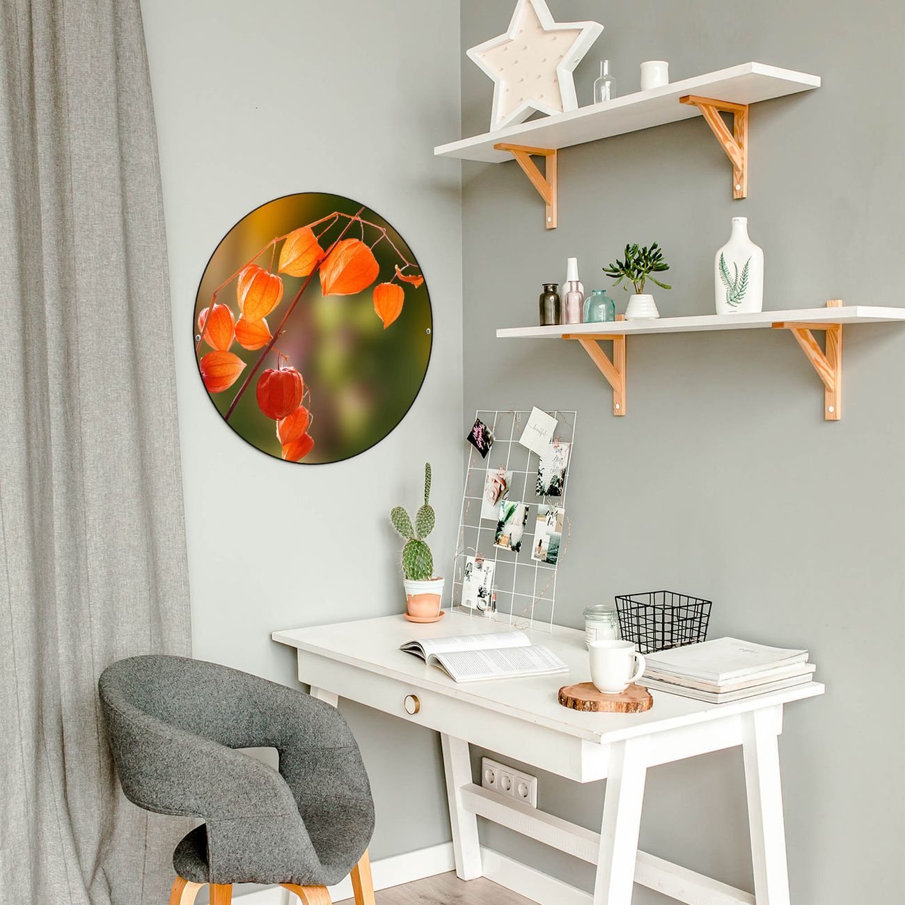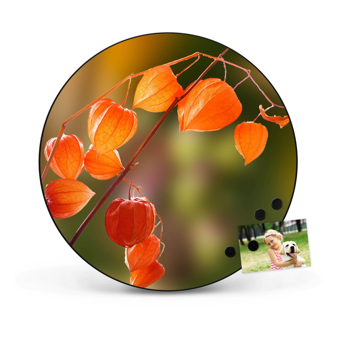 FUNKTION / DESIGN Die banjado Magnettafel mit dem Motiv Motiv Lampionblume bringt Ordnung in Ihr Zettelchaos. Fotos, Termine, Notizen oder Rezepte lassen Sich hier stilvoll mit Magneten ordnen, Sie behalten alles im Blick. Die Design Magnetwand ist beschreibbar und wieder abwischbar. Mit dieser Pinnwand haben Sie auch ohne Notizen und Magneten ein schönes Dekoelement. Das Format bietet Ihnen ausreichend Platz um alle wichtigen Informationen im Blick zu behalten. DETAILS / NUTZEN Die magnetische Metall Pinnwand besteht aus schwarz lackiertem Stahl. Sie hat einen Durchmesser von 47cm. Es befinden sich an den Seiten zwei vorgefertigte Löcher die eine schnelle und unkomplizierte Anbringung ermöglichen. Das Motiv ist mit einem seidenmatten Laminat versehen und schützt so zusätzlich vor Kratzern. Es halten alle handelsüblichen Magneten daran. Wir sind ein kleines Team aus dem Herzen von Sachsen. Wir fertigen alle Artikel von Hand für Sie an, Sie erhalten keine preiswerte Importware. Auf Wunsch können Sie auch Ihr eigenes Foto auf die Magnettafel aufbringen, schreiben Sie uns an.