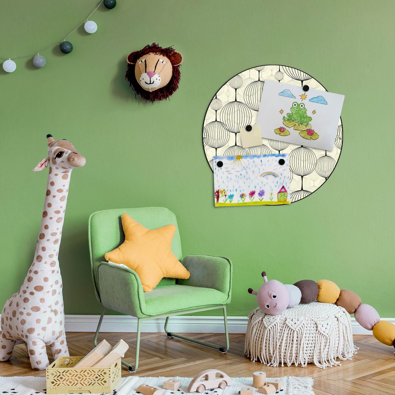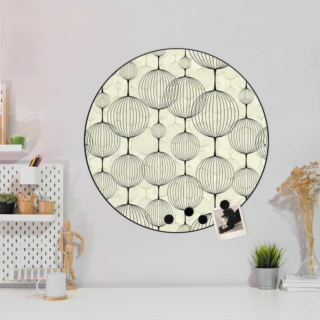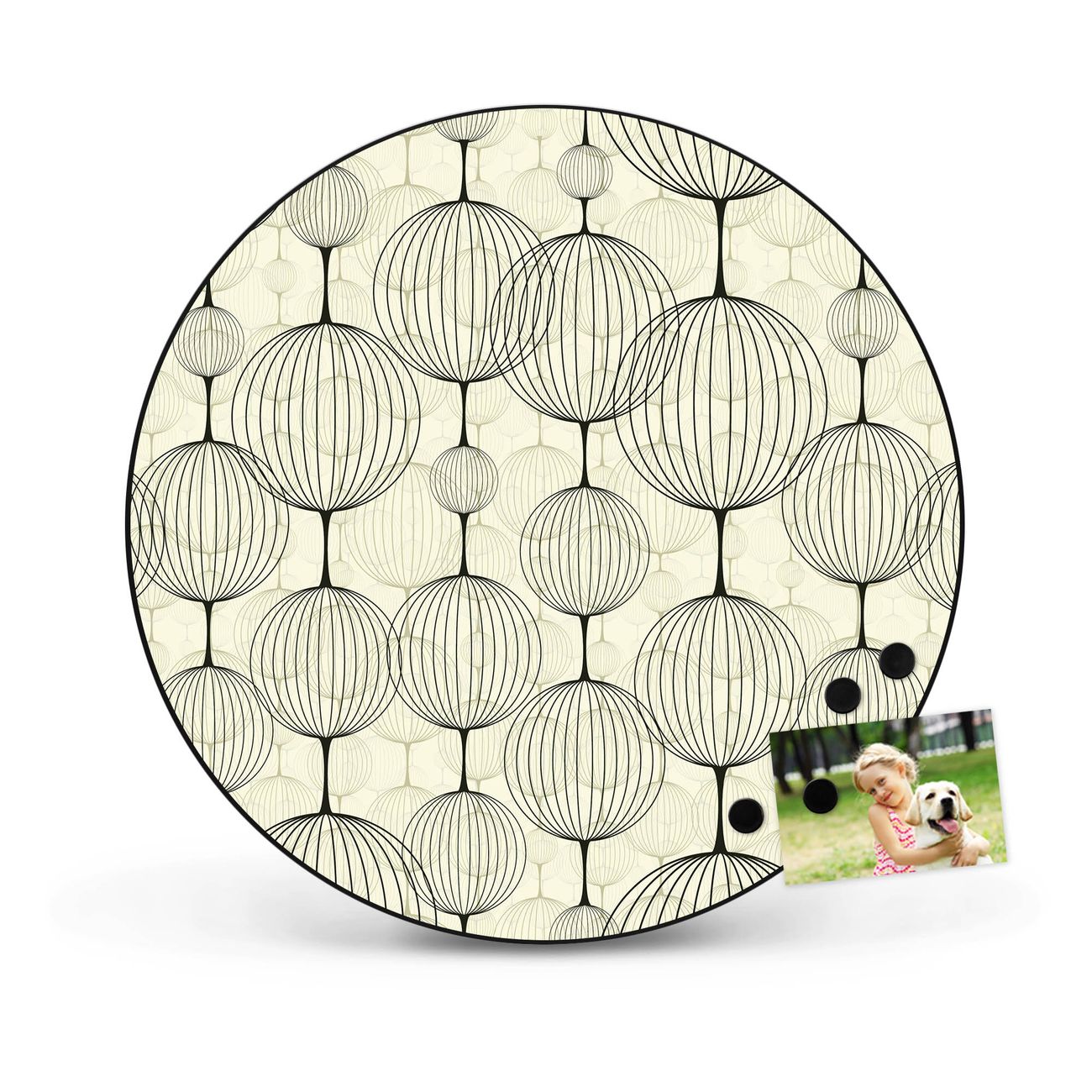 FUNKTION / DESIGN Die banjado Magnettafel mit dem Motiv Motiv Lampions bringt Ordnung in Ihr Zettelchaos. Fotos, Termine, Notizen oder Rezepte lassen Sich hier stilvoll mit Magneten ordnen, Sie behalten alles im Blick. Die Design Magnetwand ist beschreibbar und wieder abwischbar. Mit dieser Pinnwand haben Sie auch ohne Notizen und Magneten ein schönes Dekoelement. Das Format bietet Ihnen ausreichend Platz um alle wichtigen Informationen im Blick zu behalten. DETAILS / NUTZEN Die magnetische Metall Pinnwand besteht aus schwarz lackiertem Stahl. Sie hat einen Durchmesser von 47cm. Es befinden sich an den Seiten zwei vorgefertigte Löcher die eine schnelle und unkomplizierte Anbringung ermöglichen. Das Motiv ist mit einem seidenmatten Laminat versehen und schützt so zusätzlich vor Kratzern. Es halten alle handelsüblichen Magneten daran. Wir sind ein kleines Team aus dem Herzen von Sachsen. Wir fertigen alle Artikel von Hand für Sie an, Sie erhalten keine preiswerte Importware. Auf Wunsch können Sie auch Ihr eigenes Foto auf die Magnettafel aufbringen, schreiben Sie uns an.