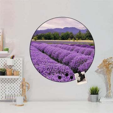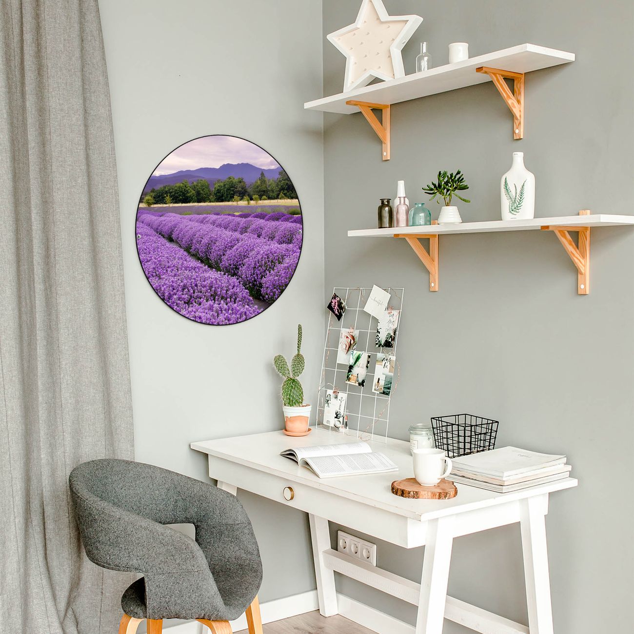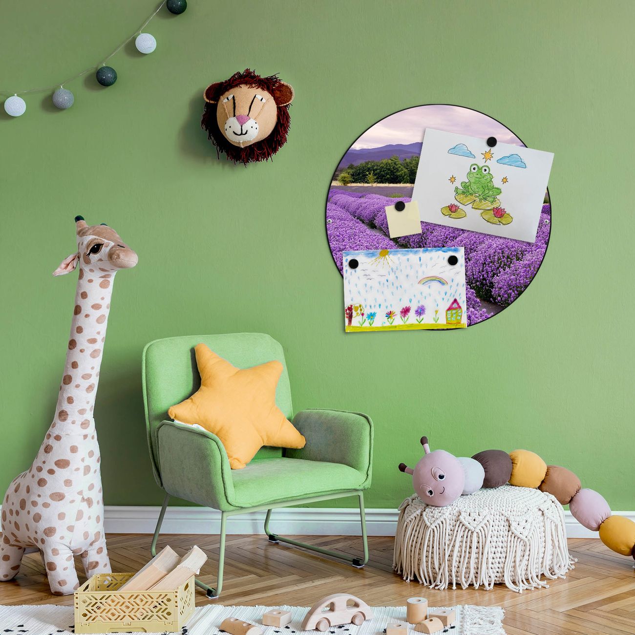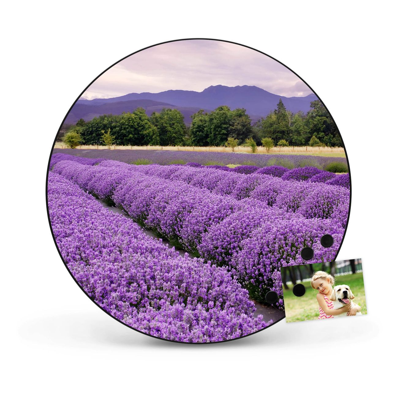 FUNKTION / DESIGN Die banjado Magnettafel mit dem Motiv Motiv Lavendel 1 bringt Ordnung in Ihr Zettelchaos. Fotos, Termine, Notizen oder Rezepte lassen Sich hier stilvoll mit Magneten ordnen, Sie behalten alles im Blick. Die Design Magnetwand ist beschreibbar und wieder abwischbar. Mit dieser Pinnwand haben Sie auch ohne Notizen und Magneten ein schönes Dekoelement. Das Format bietet Ihnen ausreichend Platz um alle wichtigen Informationen im Blick zu behalten. DETAILS / NUTZEN Die magnetische Metall Pinnwand besteht aus schwarz lackiertem Stahl. Sie hat einen Durchmesser von 47cm. Es befinden sich an den Seiten zwei vorgefertigte Löcher die eine schnelle und unkomplizierte Anbringung ermöglichen. Das Motiv ist mit einem seidenmatten Laminat versehen und schützt so zusätzlich vor Kratzern. Es halten alle handelsüblichen Magneten daran. Wir sind ein kleines Team aus dem Herzen von Sachsen. Wir fertigen alle Artikel von Hand für Sie an, Sie erhalten keine preiswerte Importware. Auf Wunsch können Sie auch Ihr eigenes Foto auf die Magnettafel aufbringen, schreiben Sie uns an.