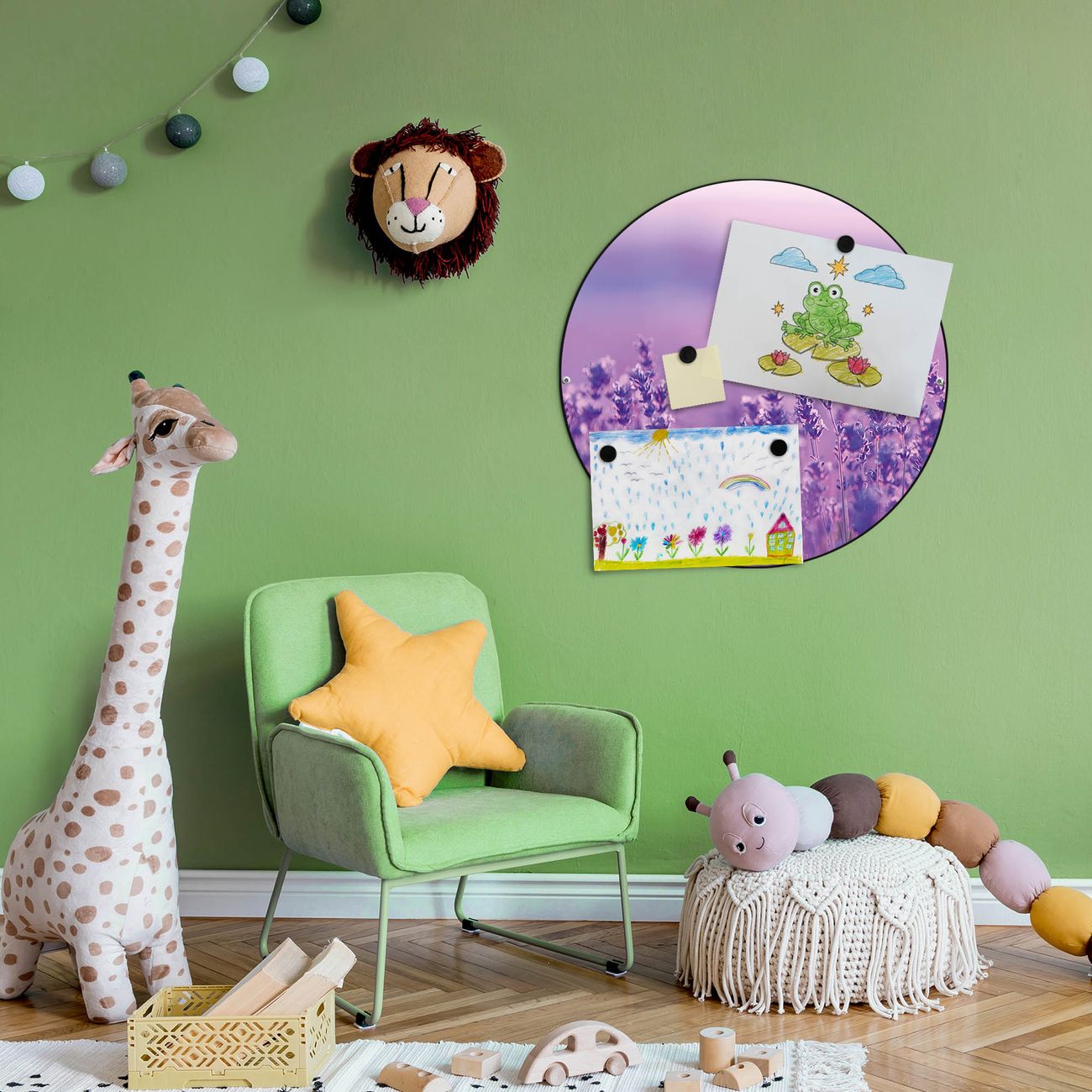 FUNKTION / DESIGN Die banjado Magnettafel mit dem Motiv Motiv Lavendelmeer bringt Ordnung in Ihr Zettelchaos. Fotos, Termine, Notizen oder Rezepte lassen Sich hier stilvoll mit Magneten ordnen, Sie behalten alles im Blick. Die Design Magnetwand ist beschreibbar und wieder abwischbar. Mit dieser Pinnwand haben Sie auch ohne Notizen und Magneten ein schönes Dekoelement. Das Format bietet Ihnen ausreichend Platz um alle wichtigen Informationen im Blick zu behalten. DETAILS / NUTZEN Die magnetische Metall Pinnwand besteht aus schwarz lackiertem Stahl. Sie hat einen Durchmesser von 47cm. Es befinden sich an den Seiten zwei vorgefertigte Löcher die eine schnelle und unkomplizierte Anbringung ermöglichen. Das Motiv ist mit einem seidenmatten Laminat versehen und schützt so zusätzlich vor Kratzern. Es halten alle handelsüblichen Magneten daran. Wir sind ein kleines Team aus dem Herzen von Sachsen. Wir fertigen alle Artikel von Hand für Sie an, Sie erhalten keine preiswerte Importware. Auf Wunsch können Sie auch Ihr eigenes Foto auf die Magnettafel aufbringen, schreiben Sie uns an.