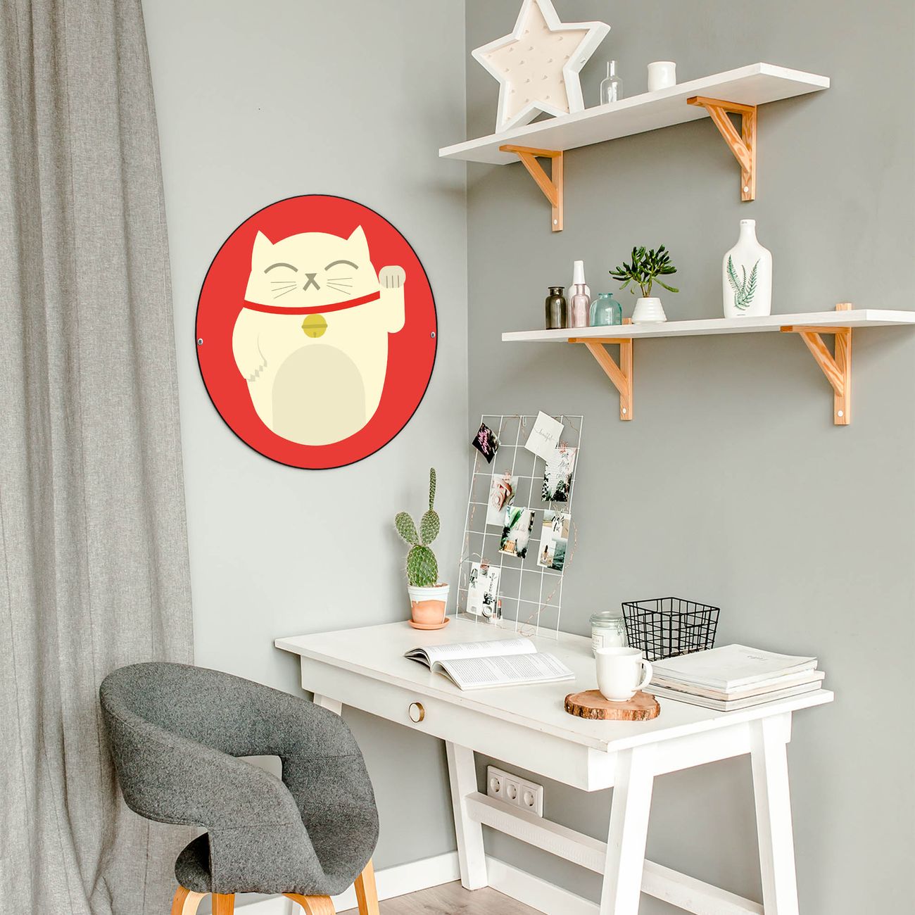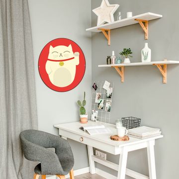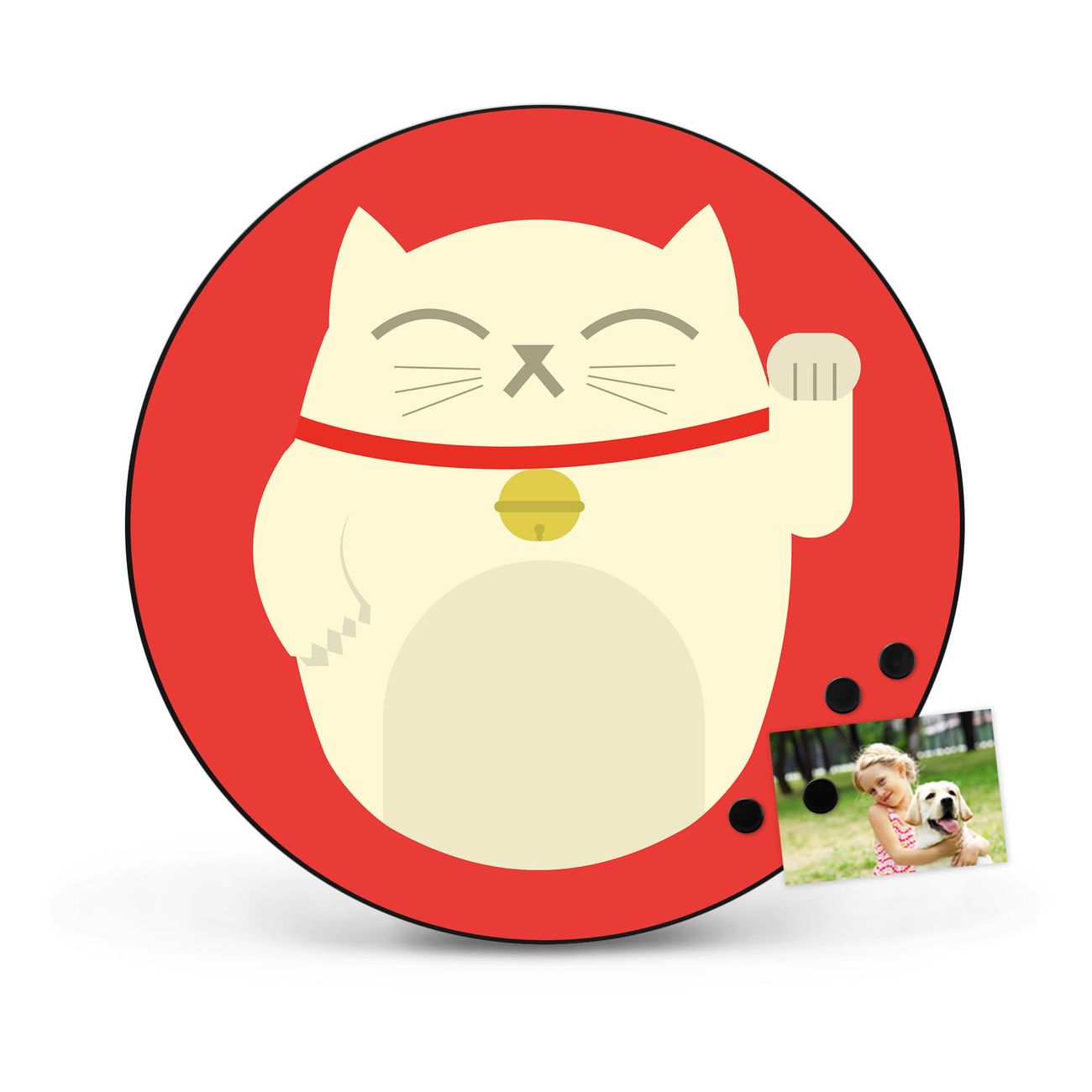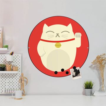 FUNKTION / DESIGN Die banjado Magnettafel mit dem Motiv Motiv Manekineko bringt Ordnung in Ihr Zettelchaos. Fotos, Termine, Notizen oder Rezepte lassen Sich hier stilvoll mit Magneten ordnen, Sie behalten alles im Blick. Die Design Magnetwand ist beschreibbar und wieder abwischbar. Mit dieser Pinnwand haben Sie auch ohne Notizen und Magneten ein schönes Dekoelement. Das Format bietet Ihnen ausreichend Platz um alle wichtigen Informationen im Blick zu behalten. DETAILS / NUTZEN Die magnetische Metall Pinnwand besteht aus schwarz lackiertem Stahl. Sie hat einen Durchmesser von 47cm. Es befinden sich an den Seiten zwei vorgefertigte Löcher die eine schnelle und unkomplizierte Anbringung ermöglichen. Das Motiv ist mit einem seidenmatten Laminat versehen und schützt so zusätzlich vor Kratzern. Es halten alle handelsüblichen Magneten daran. Wir sind ein kleines Team aus dem Herzen von Sachsen. Wir fertigen alle Artikel von Hand für Sie an, Sie erhalten keine preiswerte Importware. Auf Wunsch können Sie auch Ihr eigenes Foto auf die Magnettafel aufbringen, schreiben Sie uns an.