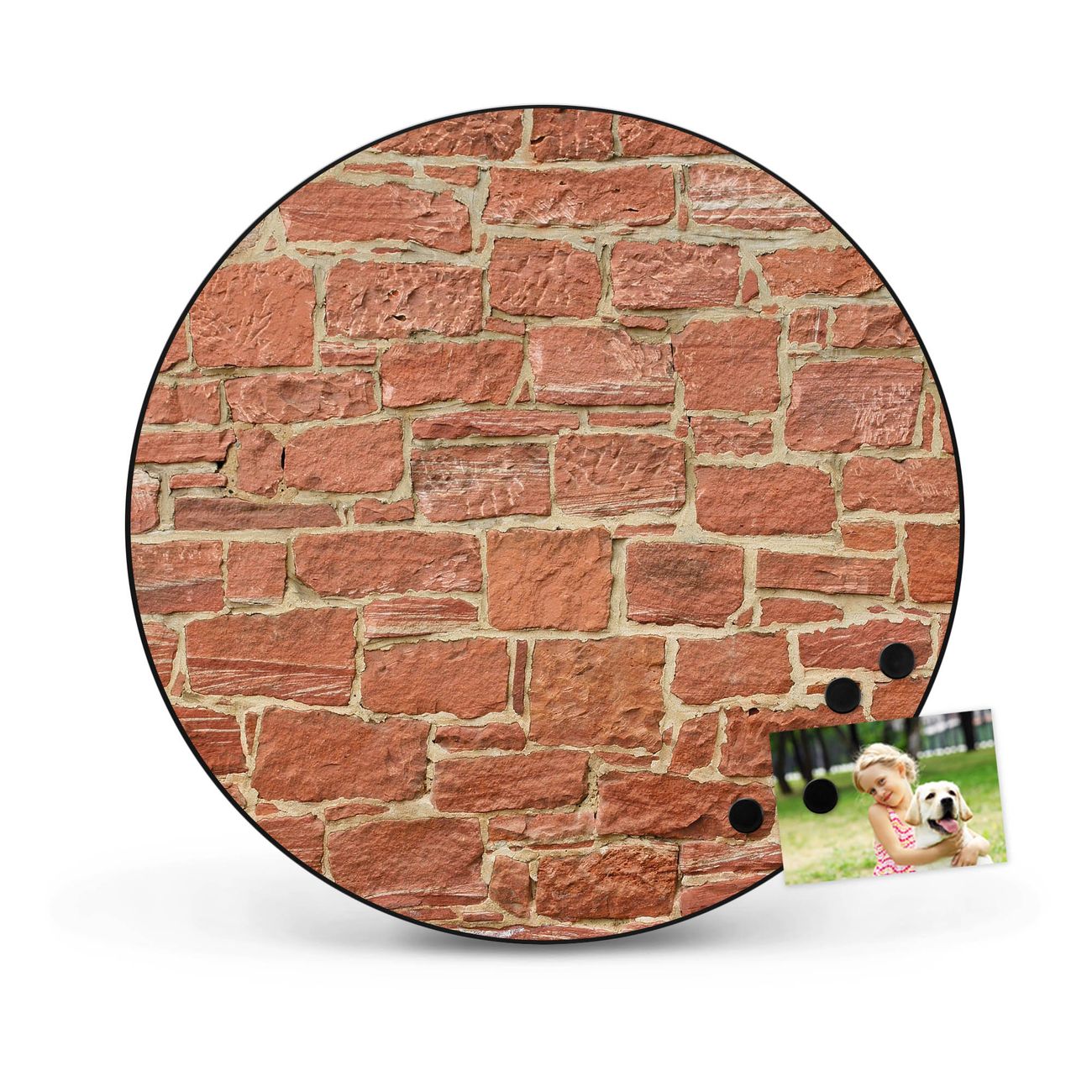 FUNKTION / DESIGN Die banjado Magnettafel mit dem Motiv Motiv Mauerwerk bringt Ordnung in Ihr Zettelchaos. Fotos, Termine, Notizen oder Rezepte lassen Sich hier stilvoll mit Magneten ordnen, Sie behalten alles im Blick. Die Design Magnetwand ist beschreibbar und wieder abwischbar. Mit dieser Pinnwand haben Sie auch ohne Notizen und Magneten ein schönes Dekoelement. Das Format bietet Ihnen ausreichend Platz um alle wichtigen Informationen im Blick zu behalten. DETAILS / NUTZEN Die magnetische Metall Pinnwand besteht aus schwarz lackiertem Stahl. Sie hat einen Durchmesser von 47cm. Es befinden sich an den Seiten zwei vorgefertigte Löcher die eine schnelle und unkomplizierte Anbringung ermöglichen. Das Motiv ist mit einem seidenmatten Laminat versehen und schützt so zusätzlich vor Kratzern. Es halten alle handelsüblichen Magneten daran. Wir sind ein kleines Team aus dem Herzen von Sachsen. Wir fertigen alle Artikel von Hand für Sie an, Sie erhalten keine preiswerte Importware. Auf Wunsch können Sie auch Ihr eigenes Foto auf die Magnettafel aufbringen, schreiben Sie uns an.