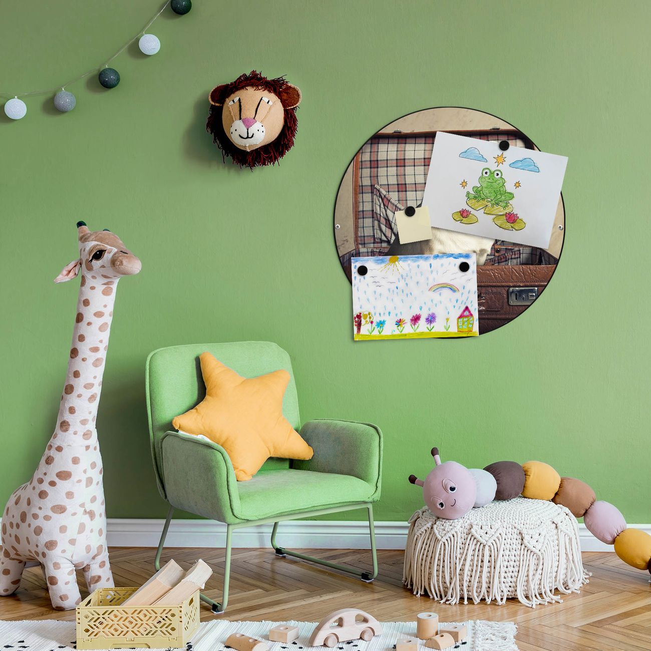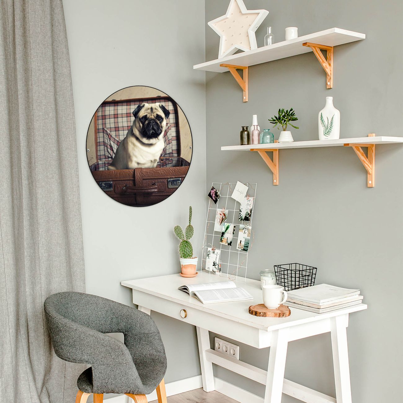FUNKTION / DESIGN Die banjado Magnettafel mit dem Motiv Motiv Mops im Koffer bringt Ordnung in Ihr Zettelchaos. Fotos, Termine, Notizen oder Rezepte lassen Sich hier stilvoll mit Magneten ordnen, Sie behalten alles im Blick. Die Design Magnetwand ist beschreibbar und wieder abwischbar. Mit dieser Pinnwand haben Sie auch ohne Notizen und Magneten ein schönes Dekoelement. Das Format bietet Ihnen ausreichend Platz um alle wichtigen Informationen im Blick zu behalten. DETAILS / NUTZEN Die magnetische Metall Pinnwand besteht aus schwarz lackiertem Stahl. Sie hat einen Durchmesser von 47cm. Es befinden sich an den Seiten zwei vorgefertigte Löcher die eine schnelle und unkomplizierte Anbringung ermöglichen. Das Motiv ist mit einem seidenmatten Laminat versehen und schützt so zusätzlich vor Kratzern. Es halten alle handelsüblichen Magneten daran. Wir sind ein kleines Team aus dem Herzen von Sachsen. Wir fertigen alle Artikel von Hand für Sie an, Sie erhalten keine preiswerte Importware. Auf Wunsch können Sie auch Ihr eigenes Foto auf die Magnettafel aufbringen, schreiben Sie uns an.