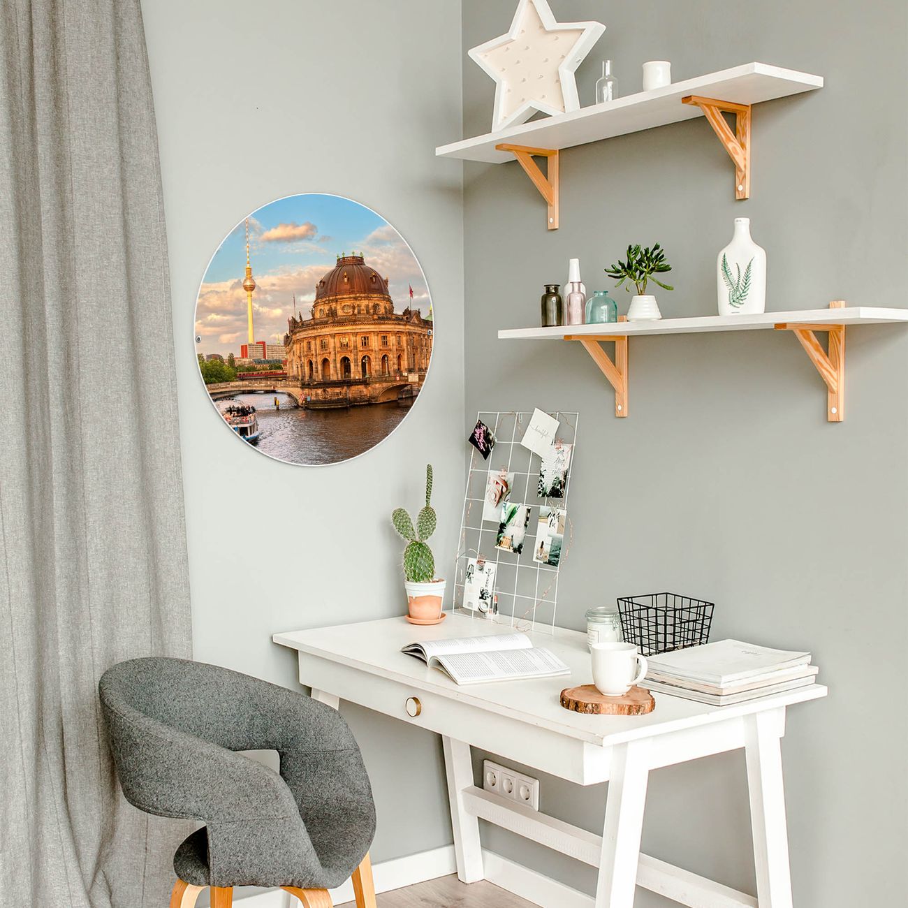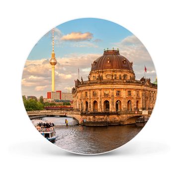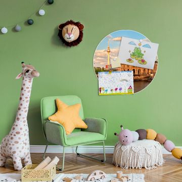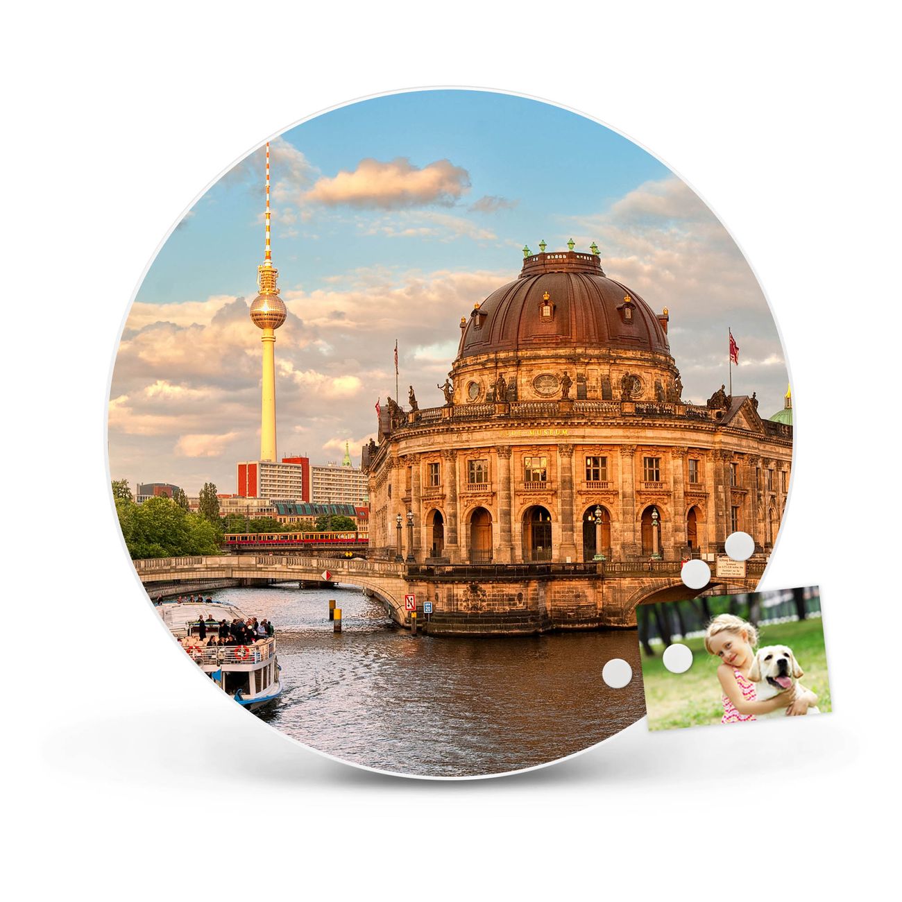 FUNKTION / DESIGN Die banjado Magnettafel mit dem Motiv Motiv Museumsinsel bringt Ordnung in Ihr Zettelchaos. Fotos, Termine, Notizen oder Rezepte lassen Sich hier stilvoll mit Magneten ordnen, Sie behalten alles im Blick. Die Design Magnetwand ist beschreibbar und wieder abwischbar. Mit dieser Pinnwand haben Sie auch ohne Notizen und Magneten ein schönes Dekoelement. Das Format bietet Ihnen ausreichend Platz um alle wichtigen Informationen im Blick zu behalten. DETAILS / NUTZEN Die magnetische Metall Pinnwand besteht aus weiß lackiertem Stahl. Sie hat einen Durchmesser von 47cm. Es befinden sich an den Seiten zwei vorgefertigte Löcher die eine schnelle und unkomplizierte Anbringung ermöglichen. Das Motiv ist mit einem seidenmatten Laminat versehen und schützt so zusätzlich vor Kratzern. Es halten alle handelsüblichen Magneten daran. Wir sind ein kleines Team aus dem Herzen von Sachsen. Wir fertigen alle Artikel von Hand für Sie an, Sie erhalten keine preiswerte Importware. Auf Wunsch können Sie auch Ihr eigenes Foto auf die Magnettafel aufbringen, schreiben Sie uns an.