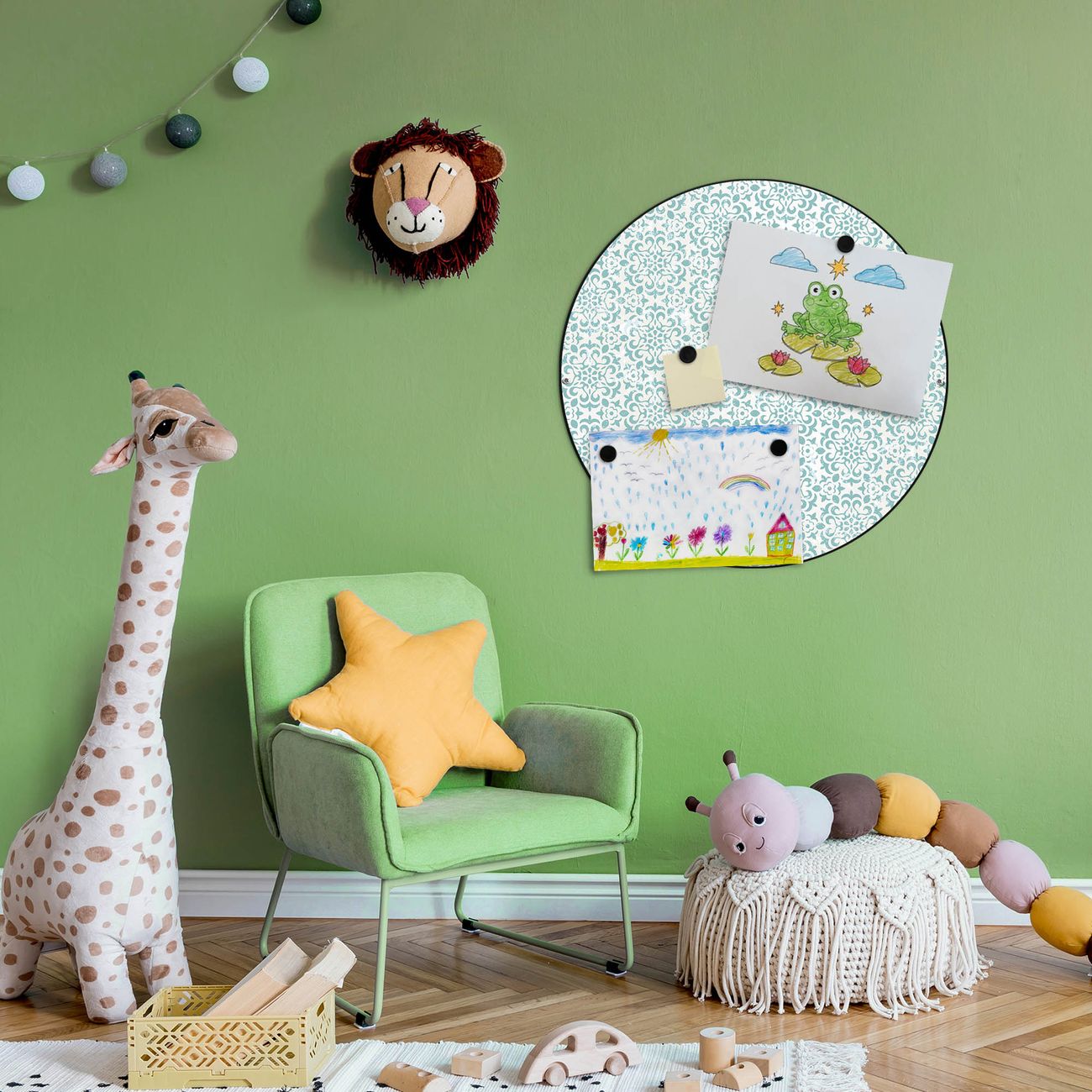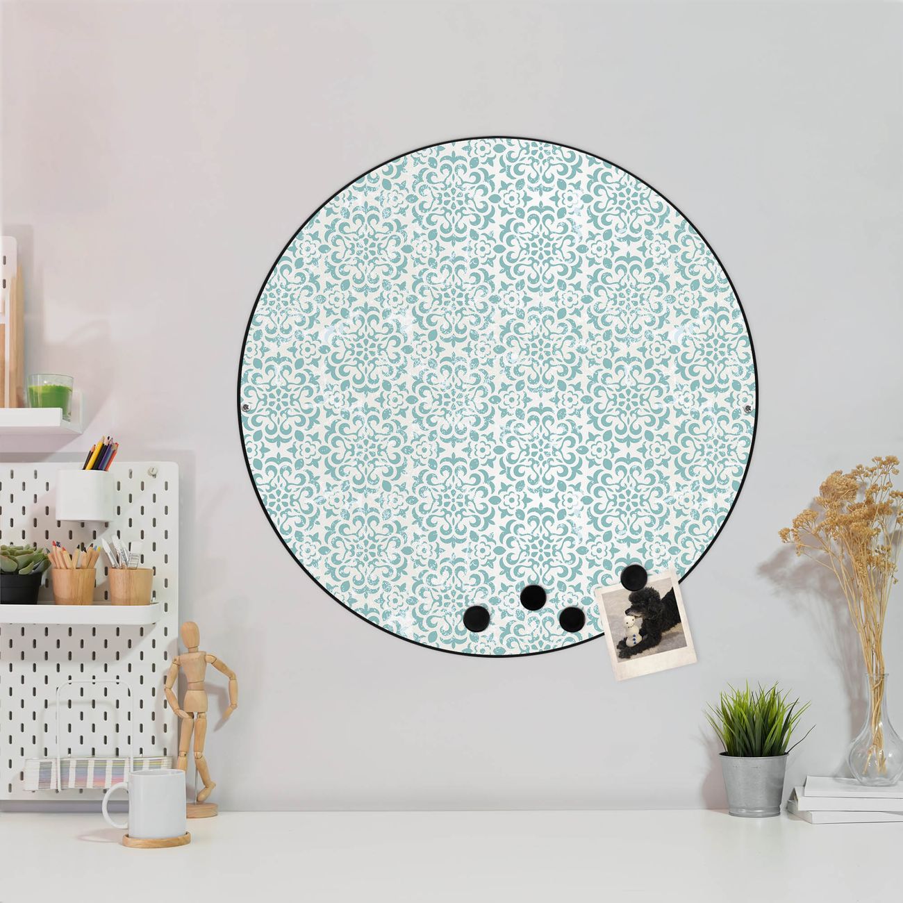 FUNKTION / DESIGN Die banjado Magnettafel mit dem Motiv Motiv Muster Getupft Blau bringt Ordnung in Ihr Zettelchaos. Fotos, Termine, Notizen oder Rezepte lassen Sich hier stilvoll mit Magneten ordnen, Sie behalten alles im Blick. Die Design Magnetwand ist beschreibbar und wieder abwischbar. Mit dieser Pinnwand haben Sie auch ohne Notizen und Magneten ein schönes Dekoelement. Das Format bietet Ihnen ausreichend Platz um alle wichtigen Informationen im Blick zu behalten. DETAILS / NUTZEN Die magnetische Metall Pinnwand besteht aus schwarz lackiertem Stahl. Sie hat einen Durchmesser von 47cm. Es befinden sich an den Seiten zwei vorgefertigte Löcher die eine schnelle und unkomplizierte Anbringung ermöglichen. Das Motiv ist mit einem seidenmatten Laminat versehen und schützt so zusätzlich vor Kratzern. Es halten alle handelsüblichen Magneten daran. Wir sind ein kleines Team aus dem Herzen von Sachsen. Wir fertigen alle Artikel von Hand für Sie an, Sie erhalten keine preiswerte Importware. Auf Wunsch können Sie auch Ihr eigenes Foto auf die Magnettafel aufbringen, schreiben Sie uns an.