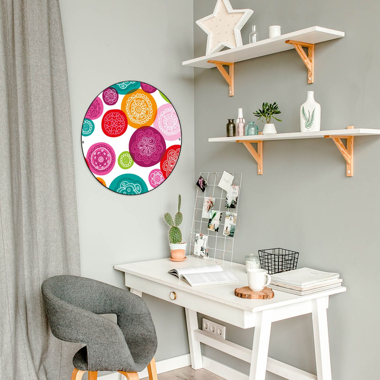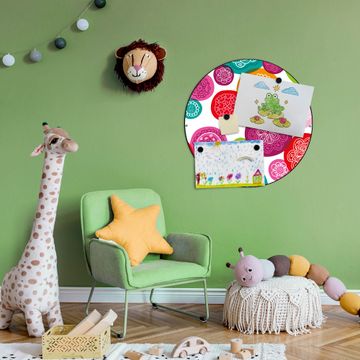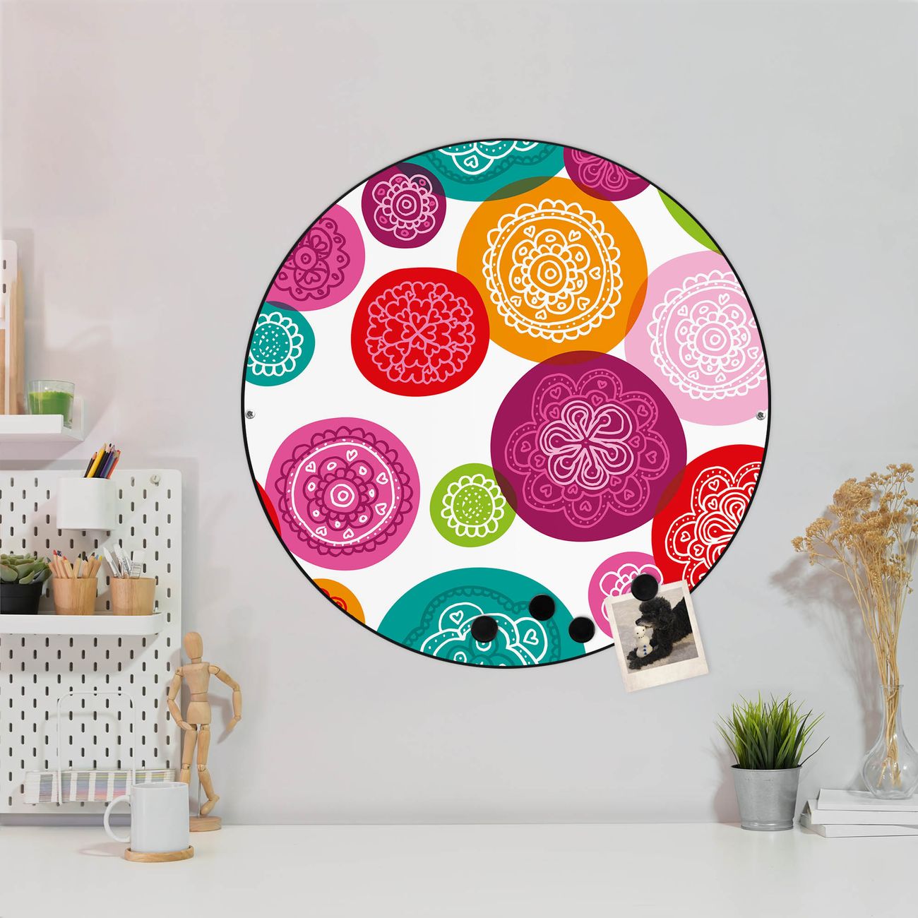 FUNKTION / DESIGN Die banjado Magnettafel mit dem Motiv Motiv Naive Blüten bringt Ordnung in Ihr Zettelchaos. Fotos, Termine, Notizen oder Rezepte lassen Sich hier stilvoll mit Magneten ordnen, Sie behalten alles im Blick. Die Design Magnetwand ist beschreibbar und wieder abwischbar. Mit dieser Pinnwand haben Sie auch ohne Notizen und Magneten ein schönes Dekoelement. Das Format bietet Ihnen ausreichend Platz um alle wichtigen Informationen im Blick zu behalten. DETAILS / NUTZEN Die magnetische Metall Pinnwand besteht aus schwarz lackiertem Stahl. Sie hat einen Durchmesser von 47cm. Es befinden sich an den Seiten zwei vorgefertigte Löcher die eine schnelle und unkomplizierte Anbringung ermöglichen. Das Motiv ist mit einem seidenmatten Laminat versehen und schützt so zusätzlich vor Kratzern. Es halten alle handelsüblichen Magneten daran. Wir sind ein kleines Team aus dem Herzen von Sachsen. Wir fertigen alle Artikel von Hand für Sie an, Sie erhalten keine preiswerte Importware. Auf Wunsch können Sie auch Ihr eigenes Foto auf die Magnettafel aufbringen, schreiben Sie uns an.