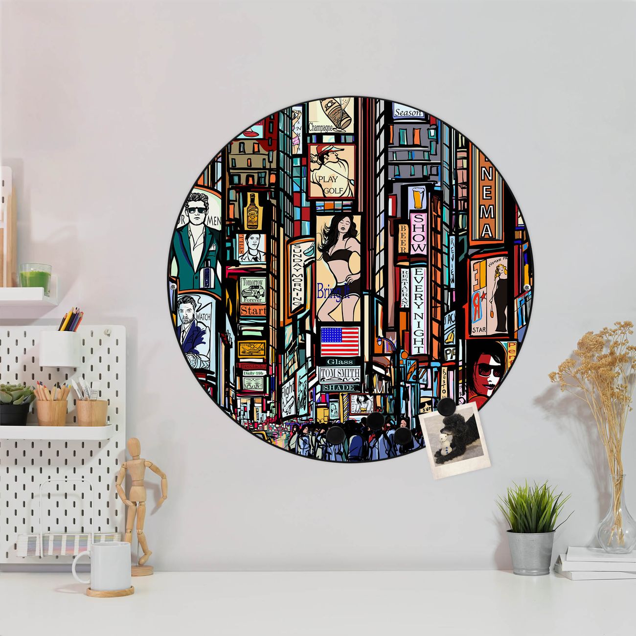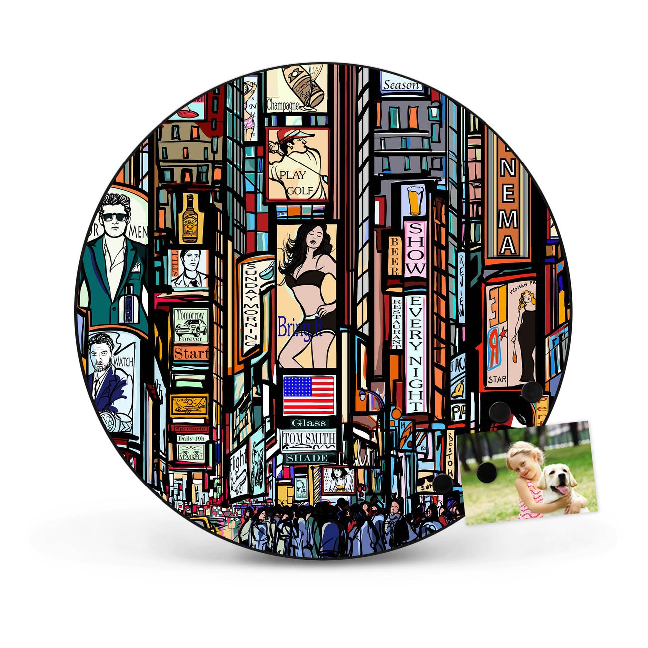 FUNKTION / DESIGN Die banjado Magnettafel mit dem Motiv Motiv New York Show bringt Ordnung in Ihr Zettelchaos. Fotos, Termine, Notizen oder Rezepte lassen Sich hier stilvoll mit Magneten ordnen, Sie behalten alles im Blick. Die Design Magnetwand ist beschreibbar und wieder abwischbar. Mit dieser Pinnwand haben Sie auch ohne Notizen und Magneten ein schönes Dekoelement. Das Format bietet Ihnen ausreichend Platz um alle wichtigen Informationen im Blick zu behalten. DETAILS / NUTZEN Die magnetische Metall Pinnwand besteht aus schwarz lackiertem Stahl. Sie hat einen Durchmesser von 47cm. Es befinden sich an den Seiten zwei vorgefertigte Löcher die eine schnelle und unkomplizierte Anbringung ermöglichen. Das Motiv ist mit einem seidenmatten Laminat versehen und schützt so zusätzlich vor Kratzern. Es halten alle handelsüblichen Magneten daran. Wir sind ein kleines Team aus dem Herzen von Sachsen. Wir fertigen alle Artikel von Hand für Sie an, Sie erhalten keine preiswerte Importware. Auf Wunsch können Sie auch Ihr eigenes Foto auf die Magnettafel aufbringen, schreiben Sie uns an.
