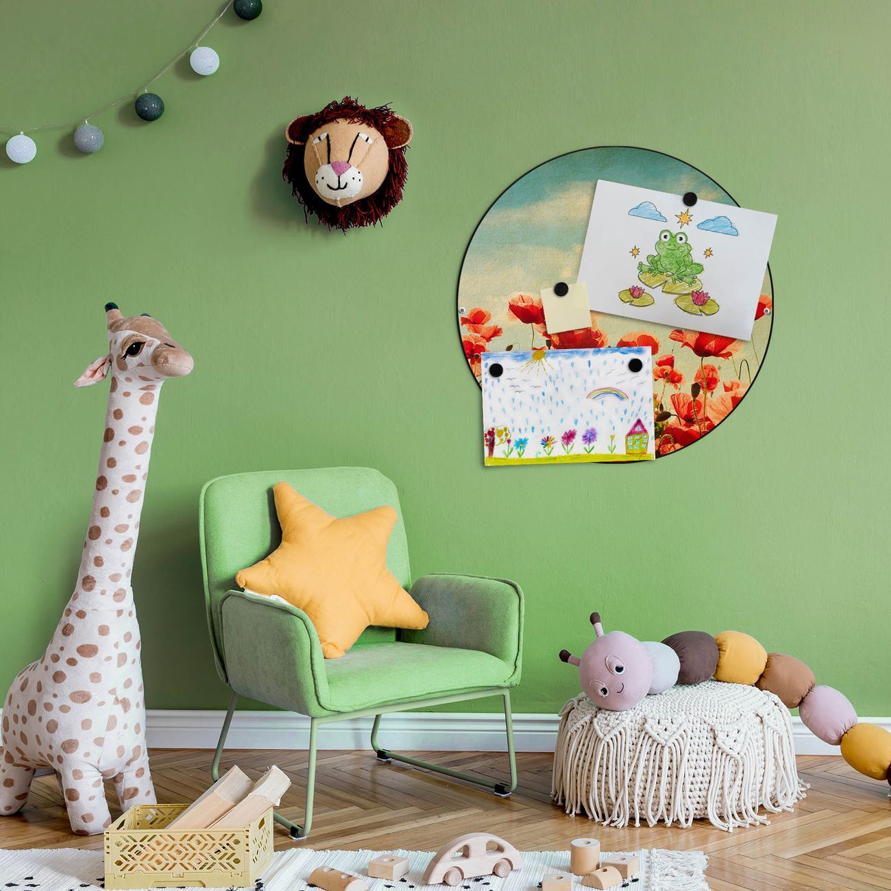FUNKTION / DESIGN Die banjado Magnettafel mit dem Motiv Motiv Oktobermohn bringt Ordnung in Ihr Zettelchaos. Fotos, Termine, Notizen oder Rezepte lassen Sich hier stilvoll mit Magneten ordnen, Sie behalten alles im Blick. Die Design Magnetwand ist beschreibbar und wieder abwischbar. Mit dieser Pinnwand haben Sie auch ohne Notizen und Magneten ein schönes Dekoelement. Das Format bietet Ihnen ausreichend Platz um alle wichtigen Informationen im Blick zu behalten. DETAILS / NUTZEN Die magnetische Metall Pinnwand besteht aus schwarz lackiertem Stahl. Sie hat einen Durchmesser von 47cm. Es befinden sich an den Seiten zwei vorgefertigte Löcher die eine schnelle und unkomplizierte Anbringung ermöglichen. Das Motiv ist mit einem seidenmatten Laminat versehen und schützt so zusätzlich vor Kratzern. Es halten alle handelsüblichen Magneten daran. Wir sind ein kleines Team aus dem Herzen von Sachsen. Wir fertigen alle Artikel von Hand für Sie an, Sie erhalten keine preiswerte Importware. Auf Wunsch können Sie auch Ihr eigenes Foto auf die Magnettafel aufbringen, schreiben Sie uns an.