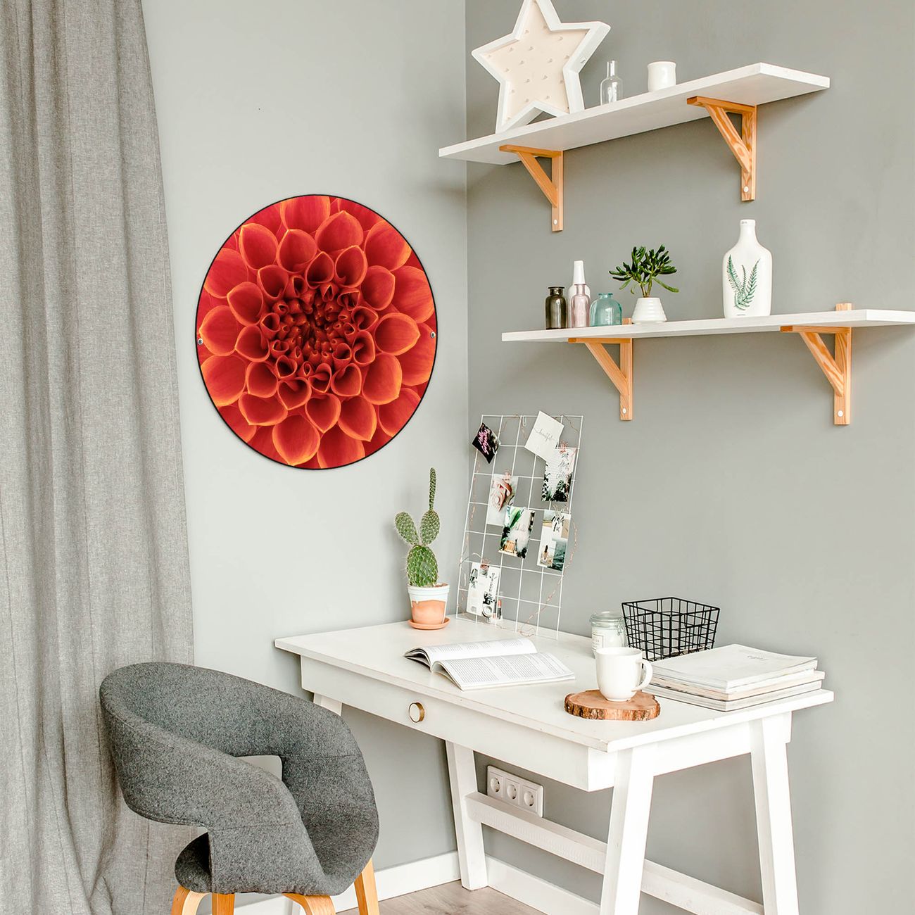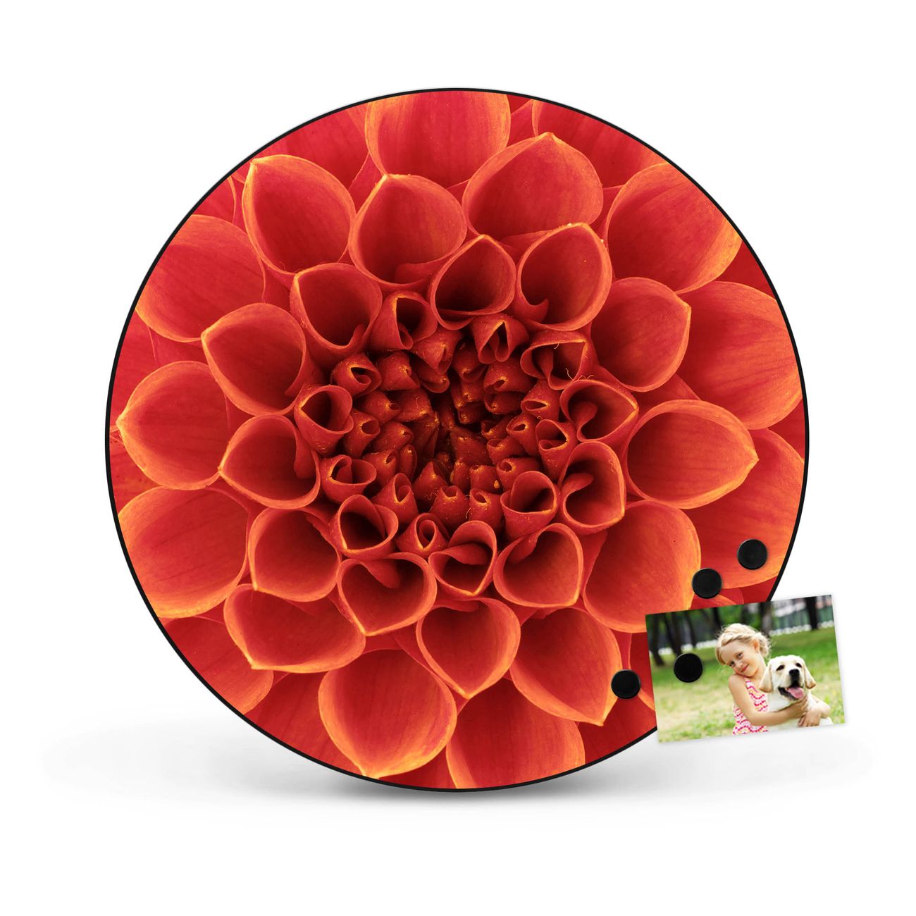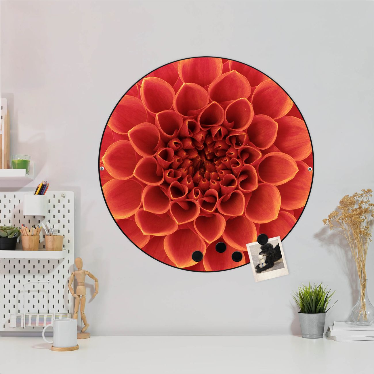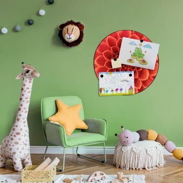 FUNKTION / DESIGN Die banjado Magnettafel mit dem Motiv Motiv Orange Chrysantheme bringt Ordnung in Ihr Zettelchaos. Fotos, Termine, Notizen oder Rezepte lassen Sich hier stilvoll mit Magneten ordnen, Sie behalten alles im Blick. Die Design Magnetwand ist beschreibbar und wieder abwischbar. Mit dieser Pinnwand haben Sie auch ohne Notizen und Magneten ein schönes Dekoelement. Das Format bietet Ihnen ausreichend Platz um alle wichtigen Informationen im Blick zu behalten. DETAILS / NUTZEN Die magnetische Metall Pinnwand besteht aus schwarz lackiertem Stahl. Sie hat einen Durchmesser von 47cm. Es befinden sich an den Seiten zwei vorgefertigte Löcher die eine schnelle und unkomplizierte Anbringung ermöglichen. Das Motiv ist mit einem seidenmatten Laminat versehen und schützt so zusätzlich vor Kratzern. Es halten alle handelsüblichen Magneten daran. Wir sind ein kleines Team aus dem Herzen von Sachsen. Wir fertigen alle Artikel von Hand für Sie an, Sie erhalten keine preiswerte Importware. Auf Wunsch können Sie auch Ihr eigenes Foto auf die Magnettafel aufbringen, schreiben Sie uns an.