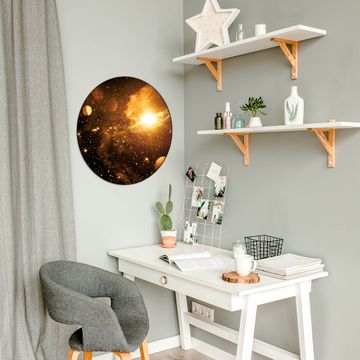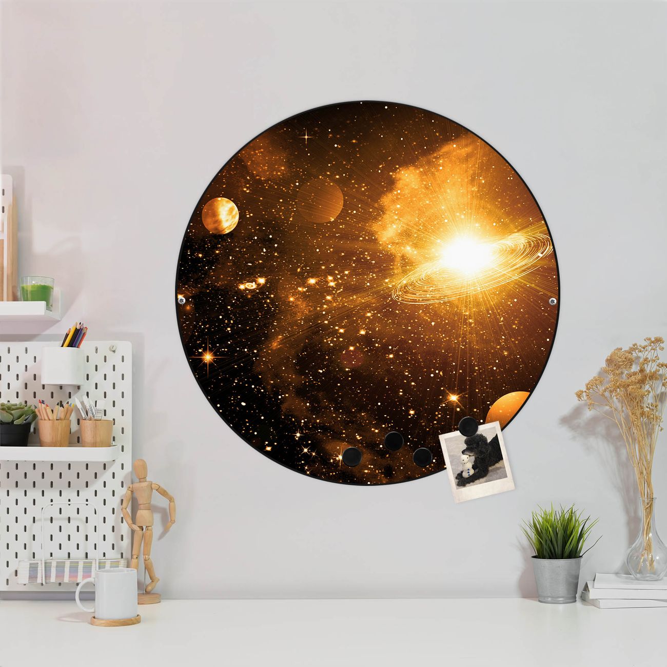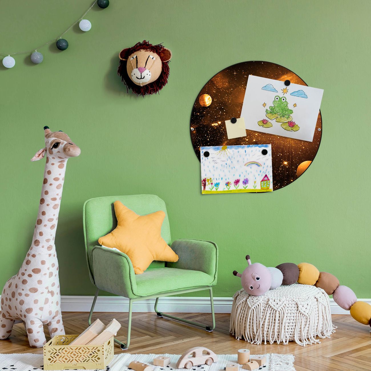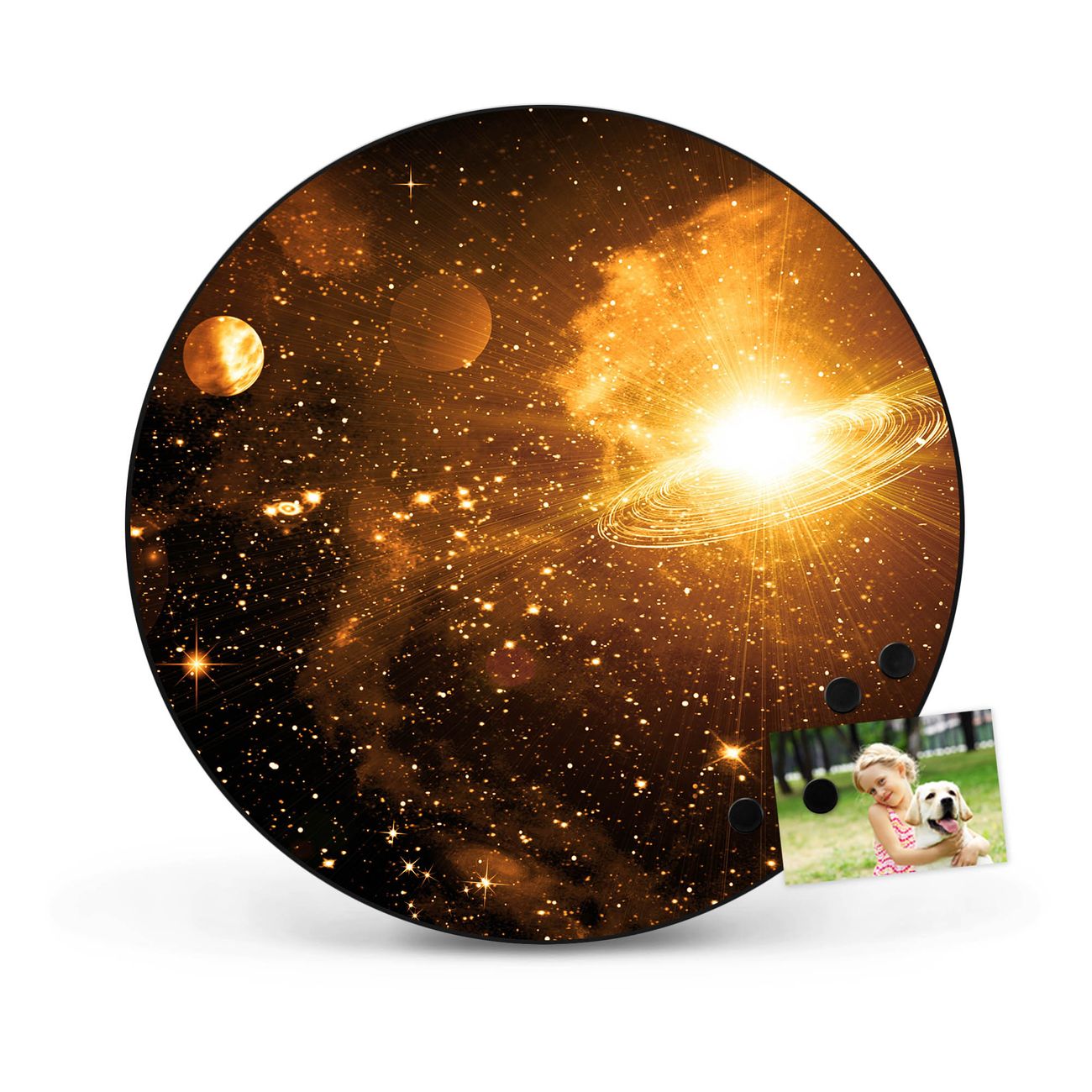 FUNKTION / DESIGN Die banjado Magnettafel mit dem Motiv Motiv Outer Space bringt Ordnung in Ihr Zettelchaos. Fotos, Termine, Notizen oder Rezepte lassen Sich hier stilvoll mit Magneten ordnen, Sie behalten alles im Blick. Die Design Magnetwand ist beschreibbar und wieder abwischbar. Mit dieser Pinnwand haben Sie auch ohne Notizen und Magneten ein schönes Dekoelement. Das Format bietet Ihnen ausreichend Platz um alle wichtigen Informationen im Blick zu behalten. DETAILS / NUTZEN Die magnetische Metall Pinnwand besteht aus schwarz lackiertem Stahl. Sie hat einen Durchmesser von 47cm. Es befinden sich an den Seiten zwei vorgefertigte Löcher die eine schnelle und unkomplizierte Anbringung ermöglichen. Das Motiv ist mit einem seidenmatten Laminat versehen und schützt so zusätzlich vor Kratzern. Es halten alle handelsüblichen Magneten daran. Wir sind ein kleines Team aus dem Herzen von Sachsen. Wir fertigen alle Artikel von Hand für Sie an, Sie erhalten keine preiswerte Importware. Auf Wunsch können Sie auch Ihr eigenes Foto auf die Magnettafel aufbringen, schreiben Sie uns an.