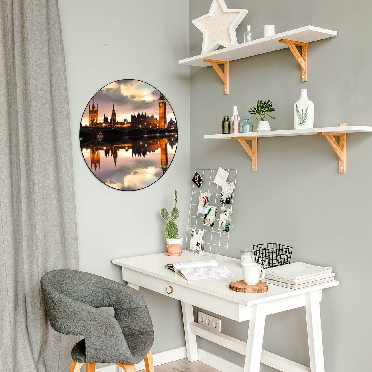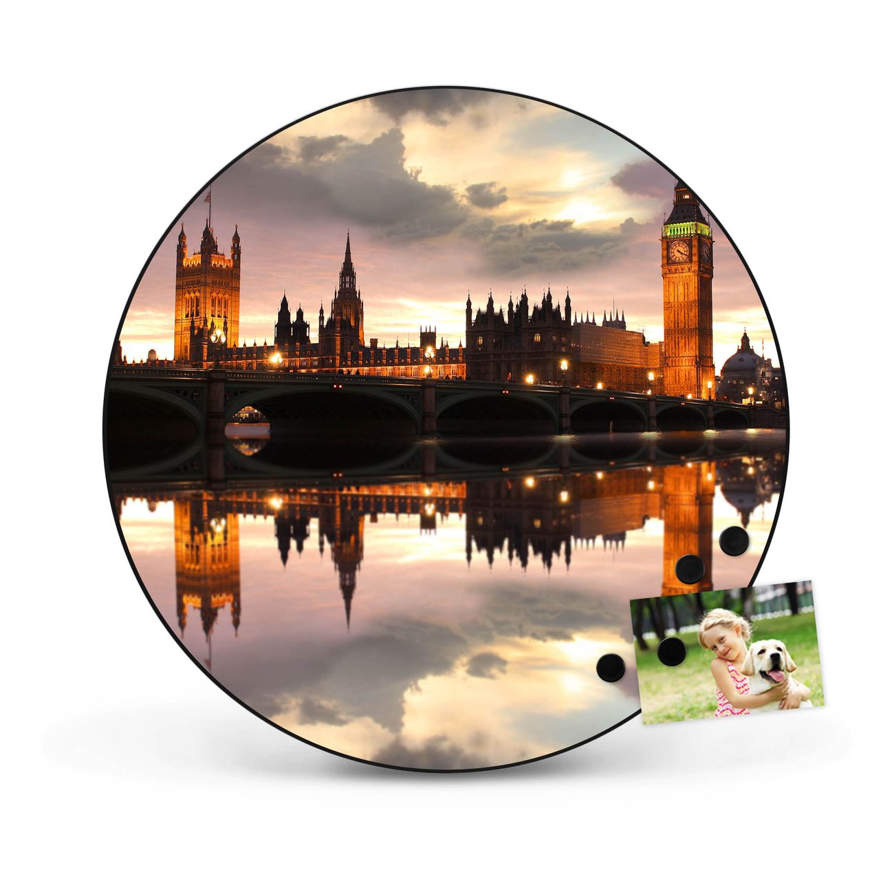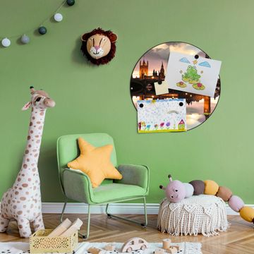 FUNKTION / DESIGN Die banjado Magnettafel mit dem Motiv Motiv Palace of Westminster bringt Ordnung in Ihr Zettelchaos. Fotos, Termine, Notizen oder Rezepte lassen Sich hier stilvoll mit Magneten ordnen, Sie behalten alles im Blick. Die Design Magnetwand ist beschreibbar und wieder abwischbar. Mit dieser Pinnwand haben Sie auch ohne Notizen und Magneten ein schönes Dekoelement. Das Format bietet Ihnen ausreichend Platz um alle wichtigen Informationen im Blick zu behalten. DETAILS / NUTZEN Die magnetische Metall Pinnwand besteht aus schwarz lackiertem Stahl. Sie hat einen Durchmesser von 47cm. Es befinden sich an den Seiten zwei vorgefertigte Löcher die eine schnelle und unkomplizierte Anbringung ermöglichen. Das Motiv ist mit einem seidenmatten Laminat versehen und schützt so zusätzlich vor Kratzern. Es halten alle handelsüblichen Magneten daran. Wir sind ein kleines Team aus dem Herzen von Sachsen. Wir fertigen alle Artikel von Hand für Sie an, Sie erhalten keine preiswerte Importware. Auf Wunsch können Sie auch Ihr eigenes Foto auf die Magnettafel aufbringen, schreiben Sie uns an.