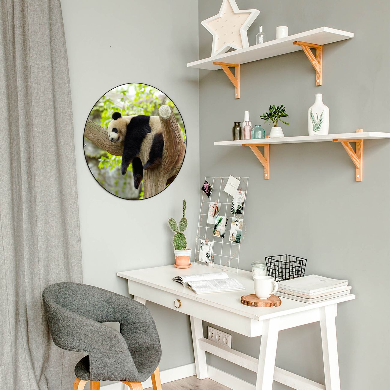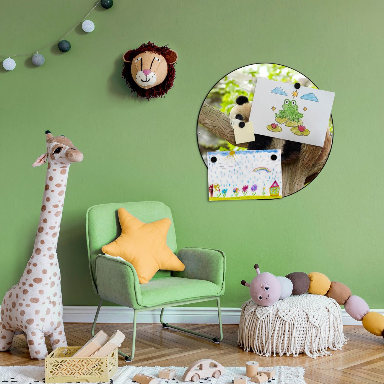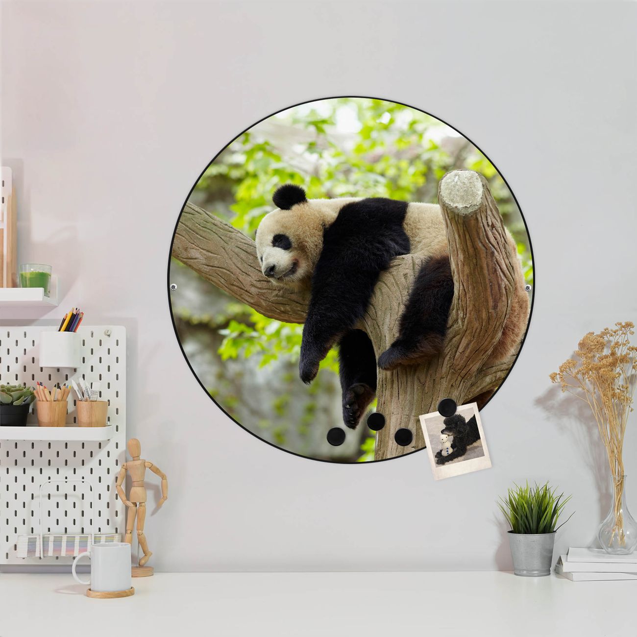 FUNKTION / DESIGN Die banjado Magnettafel mit dem Motiv Motiv Panda bringt Ordnung in Ihr Zettelchaos. Fotos, Termine, Notizen oder Rezepte lassen Sich hier stilvoll mit Magneten ordnen, Sie behalten alles im Blick. Die Design Magnetwand ist beschreibbar und wieder abwischbar. Mit dieser Pinnwand haben Sie auch ohne Notizen und Magneten ein schönes Dekoelement. Das Format bietet Ihnen ausreichend Platz um alle wichtigen Informationen im Blick zu behalten. DETAILS / NUTZEN Die magnetische Metall Pinnwand besteht aus schwarz lackiertem Stahl. Sie hat einen Durchmesser von 47cm. Es befinden sich an den Seiten zwei vorgefertigte Löcher die eine schnelle und unkomplizierte Anbringung ermöglichen. Das Motiv ist mit einem seidenmatten Laminat versehen und schützt so zusätzlich vor Kratzern. Es halten alle handelsüblichen Magneten daran. Wir sind ein kleines Team aus dem Herzen von Sachsen. Wir fertigen alle Artikel von Hand für Sie an, Sie erhalten keine preiswerte Importware. Auf Wunsch können Sie auch Ihr eigenes Foto auf die Magnettafel aufbringen, schreiben Sie uns an.