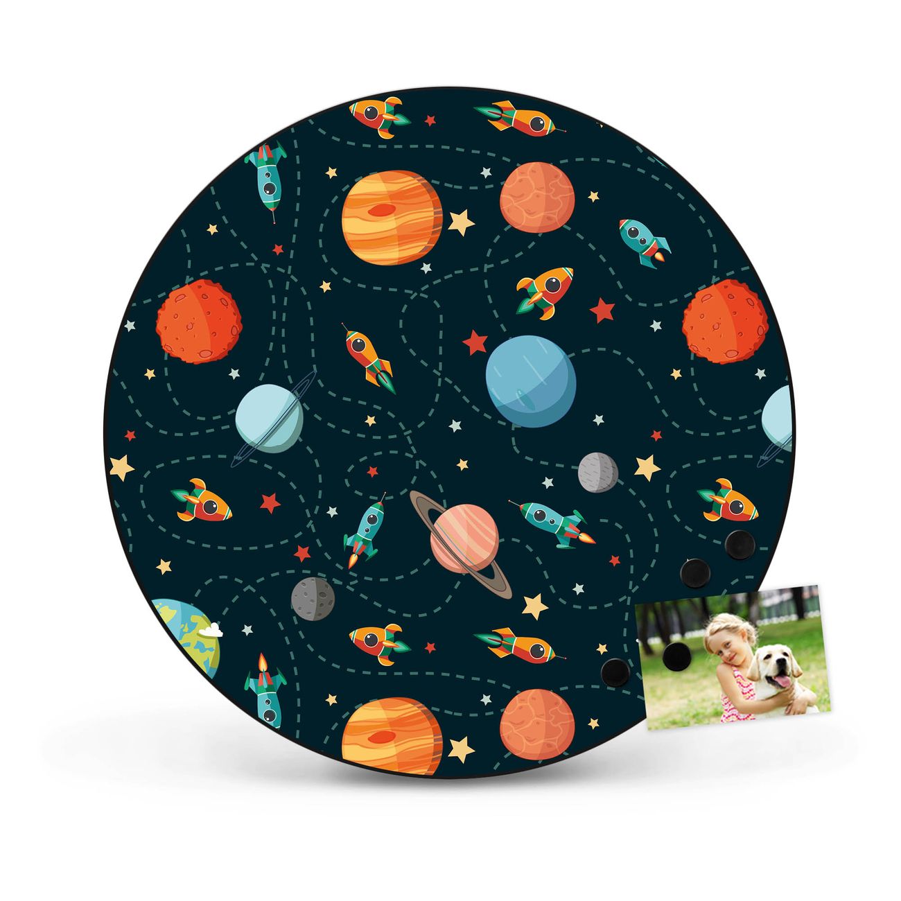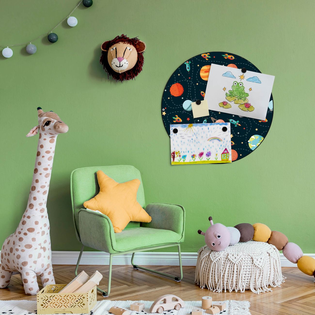 FUNKTION / DESIGN Die banjado Magnettafel mit dem Motiv Motiv Planet Cruiser bringt Ordnung in Ihr Zettelchaos. Fotos, Termine, Notizen oder Rezepte lassen Sich hier stilvoll mit Magneten ordnen, Sie behalten alles im Blick. Die Design Magnetwand ist beschreibbar und wieder abwischbar. Mit dieser Pinnwand haben Sie auch ohne Notizen und Magneten ein schönes Dekoelement. Das Format bietet Ihnen ausreichend Platz um alle wichtigen Informationen im Blick zu behalten. DETAILS / NUTZEN Die magnetische Metall Pinnwand besteht aus schwarz lackiertem Stahl. Sie hat einen Durchmesser von 47cm. Es befinden sich an den Seiten zwei vorgefertigte Löcher die eine schnelle und unkomplizierte Anbringung ermöglichen. Das Motiv ist mit einem seidenmatten Laminat versehen und schützt so zusätzlich vor Kratzern. Es halten alle handelsüblichen Magneten daran. Wir sind ein kleines Team aus dem Herzen von Sachsen. Wir fertigen alle Artikel von Hand für Sie an, Sie erhalten keine preiswerte Importware. Auf Wunsch können Sie auch Ihr eigenes Foto auf die Magnettafel aufbringen, schreiben Sie uns an.
