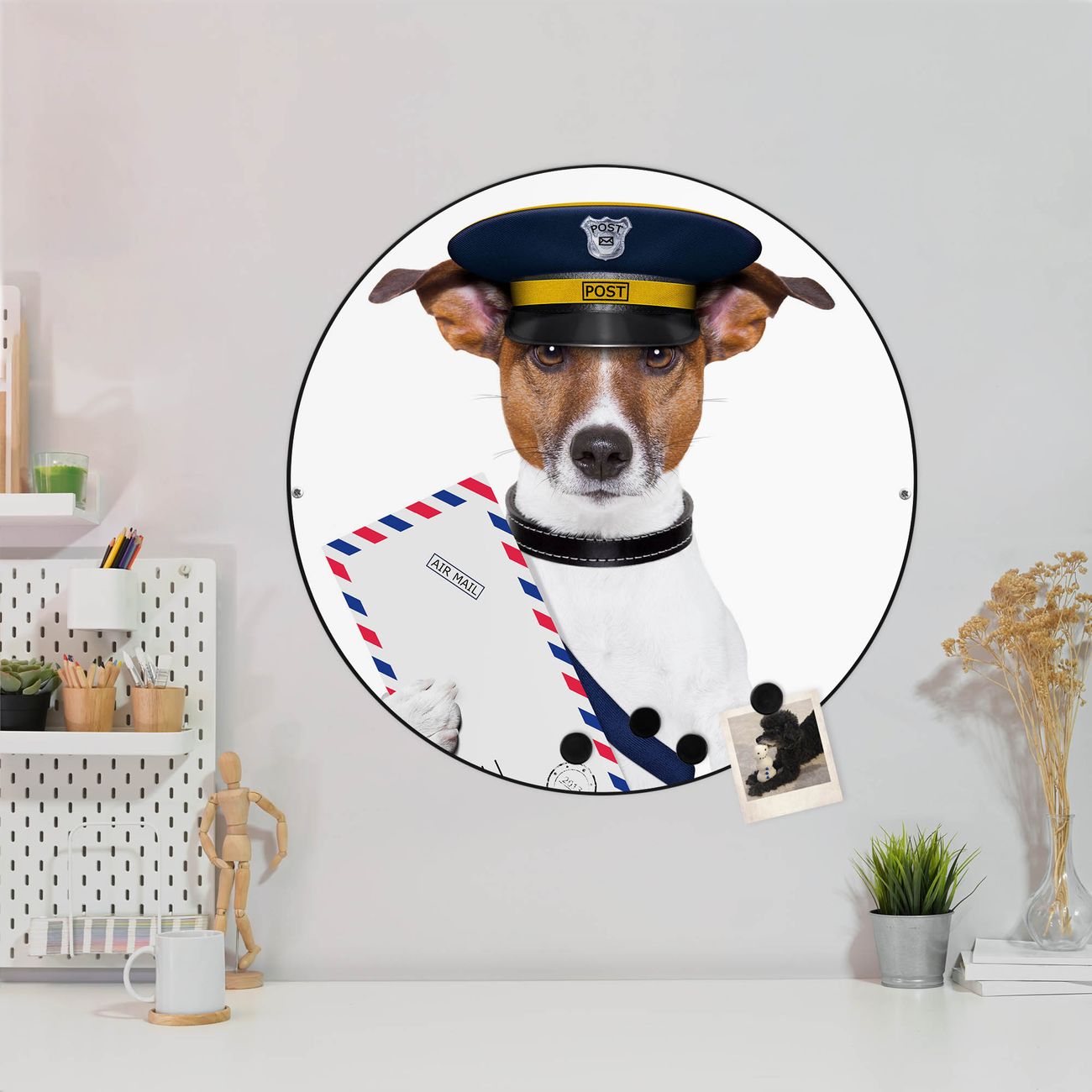 FUNKTION / DESIGN Die banjado Magnettafel mit dem Motiv Motiv Postbote Jack Russel bringt Ordnung in Ihr Zettelchaos. Fotos, Termine, Notizen oder Rezepte lassen Sich hier stilvoll mit Magneten ordnen, Sie behalten alles im Blick. Die Design Magnetwand ist beschreibbar und wieder abwischbar. Mit dieser Pinnwand haben Sie auch ohne Notizen und Magneten ein schönes Dekoelement. Das Format bietet Ihnen ausreichend Platz um alle wichtigen Informationen im Blick zu behalten. DETAILS / NUTZEN Die magnetische Metall Pinnwand besteht aus schwarz lackiertem Stahl. Sie hat einen Durchmesser von 47cm. Es befinden sich an den Seiten zwei vorgefertigte Löcher die eine schnelle und unkomplizierte Anbringung ermöglichen. Das Motiv ist mit einem seidenmatten Laminat versehen und schützt so zusätzlich vor Kratzern. Es halten alle handelsüblichen Magneten daran. Wir sind ein kleines Team aus dem Herzen von Sachsen. Wir fertigen alle Artikel von Hand für Sie an, Sie erhalten keine preiswerte Importware. Auf Wunsch können Sie auch Ihr eigenes Foto auf die Magnettafel aufbringen, schreiben Sie uns an.