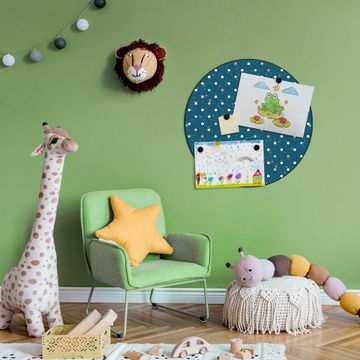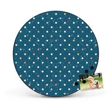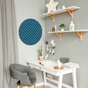 FUNKTION / DESIGN Die banjado Magnettafel mit dem Motiv Motiv Punkte auf Blau bringt Ordnung in Ihr Zettelchaos. Fotos, Termine, Notizen oder Rezepte lassen Sich hier stilvoll mit Magneten ordnen, Sie behalten alles im Blick. Die Design Magnetwand ist beschreibbar und wieder abwischbar. Mit dieser Pinnwand haben Sie auch ohne Notizen und Magneten ein schönes Dekoelement. Das Format bietet Ihnen ausreichend Platz um alle wichtigen Informationen im Blick zu behalten. DETAILS / NUTZEN Die magnetische Metall Pinnwand besteht aus schwarz lackiertem Stahl. Sie hat einen Durchmesser von 47cm. Es befinden sich an den Seiten zwei vorgefertigte Löcher die eine schnelle und unkomplizierte Anbringung ermöglichen. Das Motiv ist mit einem seidenmatten Laminat versehen und schützt so zusätzlich vor Kratzern. Es halten alle handelsüblichen Magneten daran. Wir sind ein kleines Team aus dem Herzen von Sachsen. Wir fertigen alle Artikel von Hand für Sie an, Sie erhalten keine preiswerte Importware. Auf Wunsch können Sie auch Ihr eigenes Foto auf die Magnettafel aufbringen, schreiben Sie uns an.