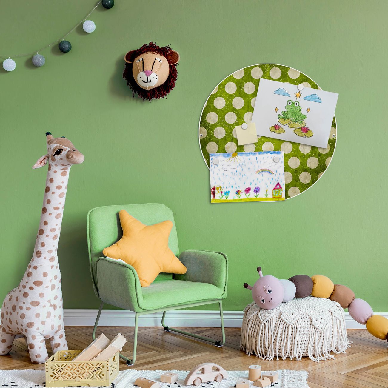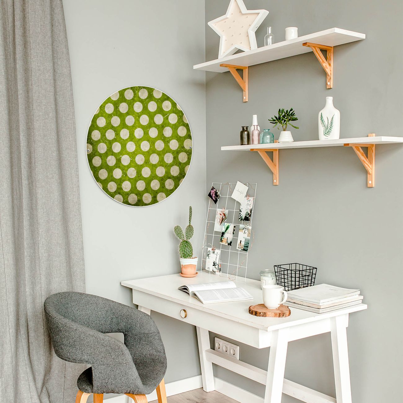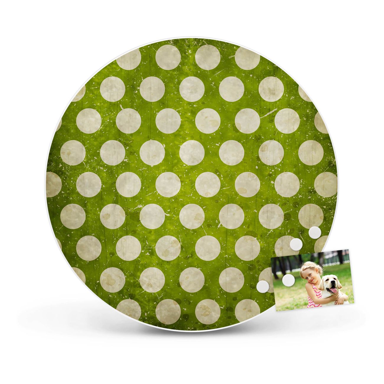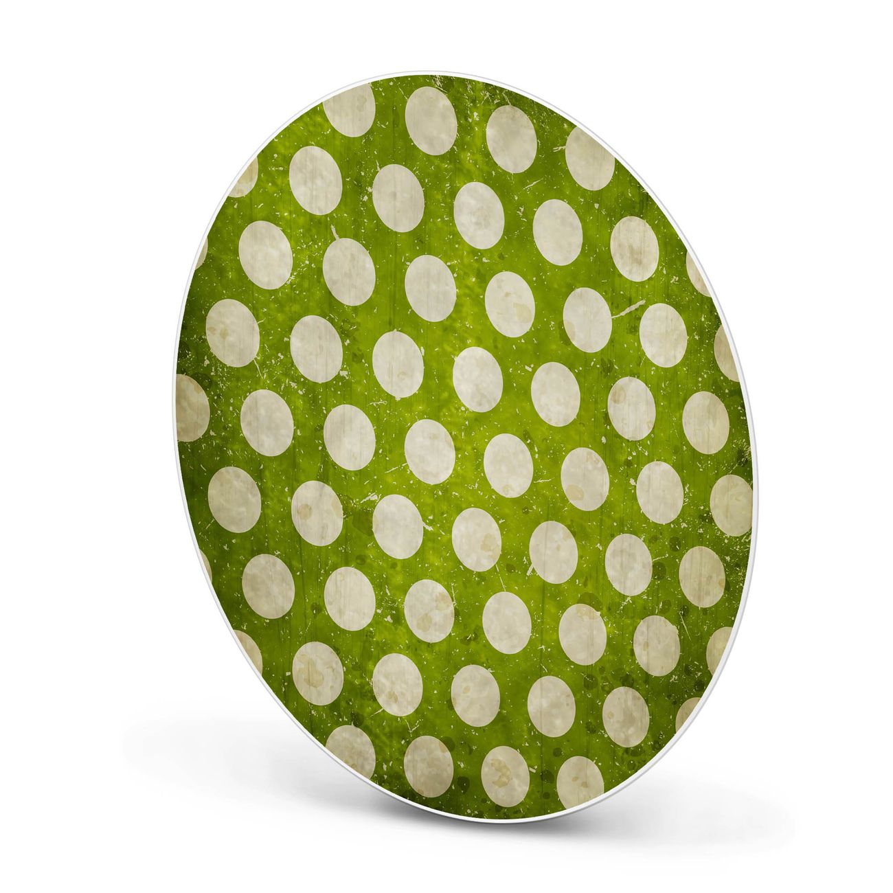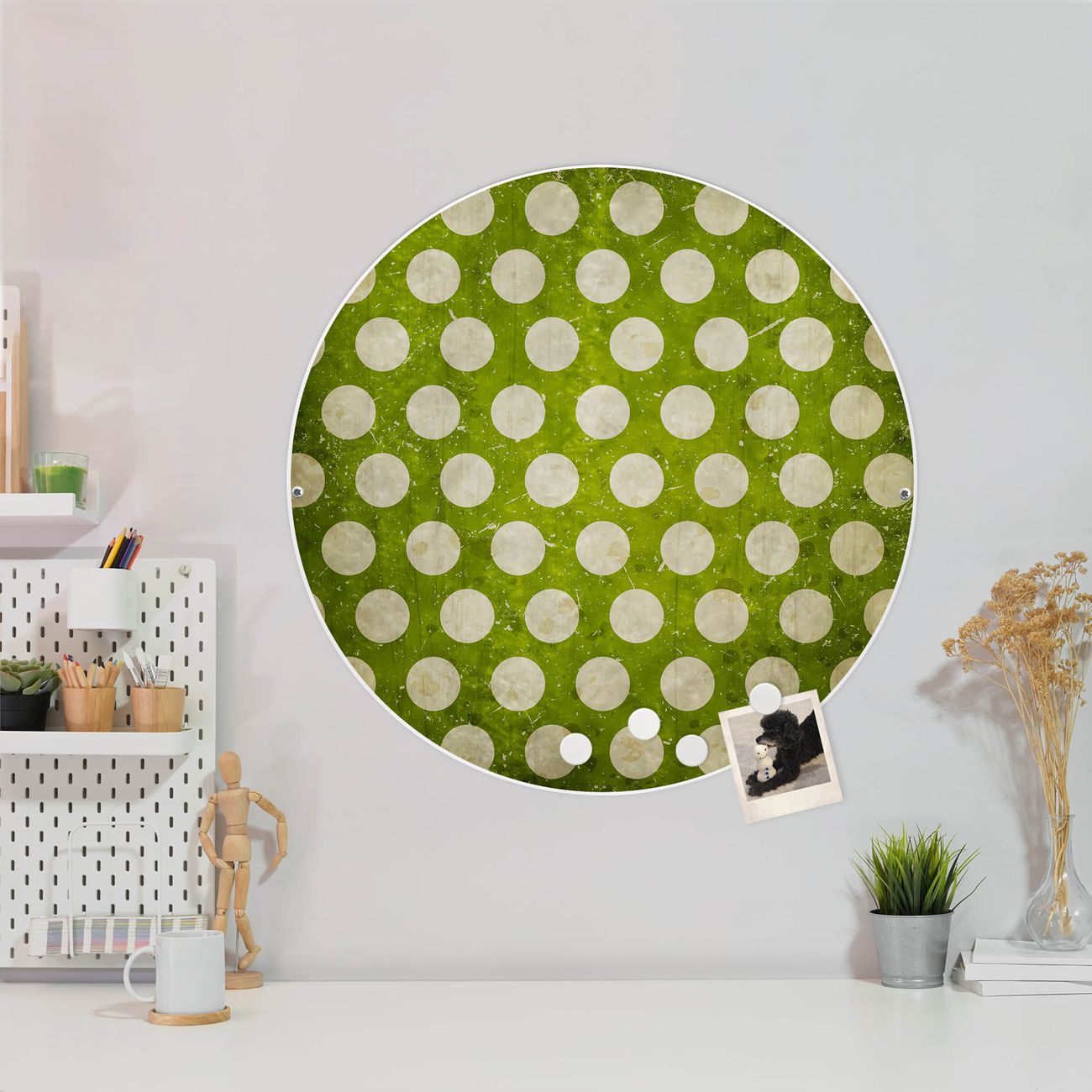 FUNKTION / DESIGN Die banjado Magnettafel mit dem Motiv Motiv Punkte Grün Vintage bringt Ordnung in Ihr Zettelchaos. Fotos, Termine, Notizen oder Rezepte lassen Sich hier stilvoll mit Magneten ordnen, Sie behalten alles im Blick. Die Design Magnetwand ist beschreibbar und wieder abwischbar. Mit dieser Pinnwand haben Sie auch ohne Notizen und Magneten ein schönes Dekoelement. Das Format bietet Ihnen ausreichend Platz um alle wichtigen Informationen im Blick zu behalten. DETAILS / NUTZEN Die magnetische Metall Pinnwand besteht aus weiß lackiertem Stahl. Sie hat einen Durchmesser von 47cm. Es befinden sich an den Seiten zwei vorgefertigte Löcher die eine schnelle und unkomplizierte Anbringung ermöglichen. Das Motiv ist mit einem seidenmatten Laminat versehen und schützt so zusätzlich vor Kratzern. Es halten alle handelsüblichen Magneten daran. Wir sind ein kleines Team aus dem Herzen von Sachsen. Wir fertigen alle Artikel von Hand für Sie an, Sie erhalten keine preiswerte Importware. Auf Wunsch können Sie auch Ihr eigenes Foto auf die Magnettafel aufbringen, schreiben Sie uns an.