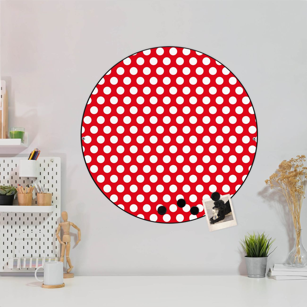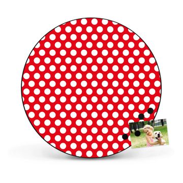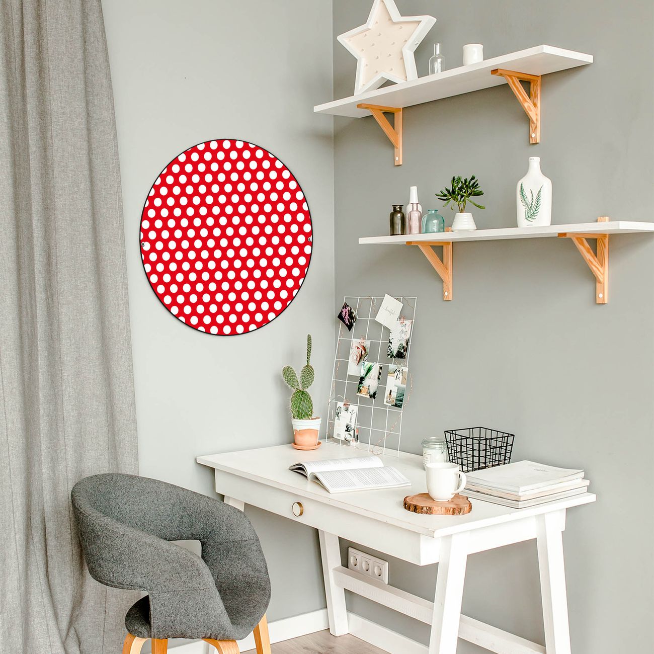 FUNKTION / DESIGN Die banjado Magnettafel mit dem Motiv Motiv Punkte Rot bringt Ordnung in Ihr Zettelchaos. Fotos, Termine, Notizen oder Rezepte lassen Sich hier stilvoll mit Magneten ordnen, Sie behalten alles im Blick. Die Design Magnetwand ist beschreibbar und wieder abwischbar. Mit dieser Pinnwand haben Sie auch ohne Notizen und Magneten ein schönes Dekoelement. Das Format bietet Ihnen ausreichend Platz um alle wichtigen Informationen im Blick zu behalten. DETAILS / NUTZEN Die magnetische Metall Pinnwand besteht aus schwarz lackiertem Stahl. Sie hat einen Durchmesser von 47cm. Es befinden sich an den Seiten zwei vorgefertigte Löcher die eine schnelle und unkomplizierte Anbringung ermöglichen. Das Motiv ist mit einem seidenmatten Laminat versehen und schützt so zusätzlich vor Kratzern. Es halten alle handelsüblichen Magneten daran. Wir sind ein kleines Team aus dem Herzen von Sachsen. Wir fertigen alle Artikel von Hand für Sie an, Sie erhalten keine preiswerte Importware. Auf Wunsch können Sie auch Ihr eigenes Foto auf die Magnettafel aufbringen, schreiben Sie uns an.