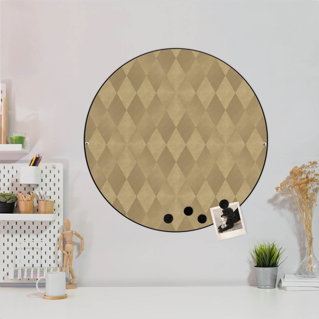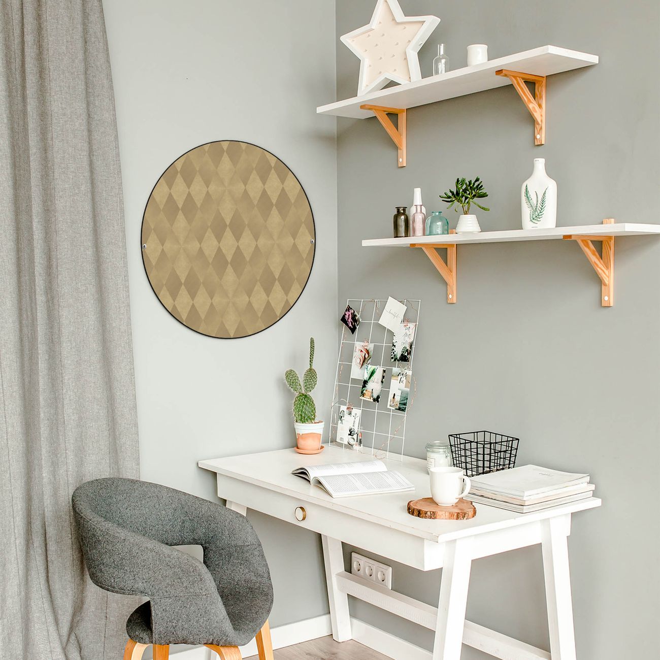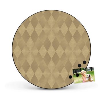FUNKTION / DESIGN Die banjado Magnettafel mit dem Motiv Motiv Rauten Metall bringt Ordnung in Ihr Zettelchaos. Fotos, Termine, Notizen oder Rezepte lassen Sich hier stilvoll mit Magneten ordnen, Sie behalten alles im Blick. Die Design Magnetwand ist beschreibbar und wieder abwischbar. Mit dieser Pinnwand haben Sie auch ohne Notizen und Magneten ein schönes Dekoelement. Das Format bietet Ihnen ausreichend Platz um alle wichtigen Informationen im Blick zu behalten. DETAILS / NUTZEN Die magnetische Metall Pinnwand besteht aus schwarz lackiertem Stahl. Sie hat einen Durchmesser von 47cm. Es befinden sich an den Seiten zwei vorgefertigte Löcher die eine schnelle und unkomplizierte Anbringung ermöglichen. Das Motiv ist mit einem seidenmatten Laminat versehen und schützt so zusätzlich vor Kratzern. Es halten alle handelsüblichen Magneten daran. Wir sind ein kleines Team aus dem Herzen von Sachsen. Wir fertigen alle Artikel von Hand für Sie an, Sie erhalten keine preiswerte Importware. Auf Wunsch können Sie auch Ihr eigenes Foto auf die Magnettafel aufbringen, schreiben Sie uns an.